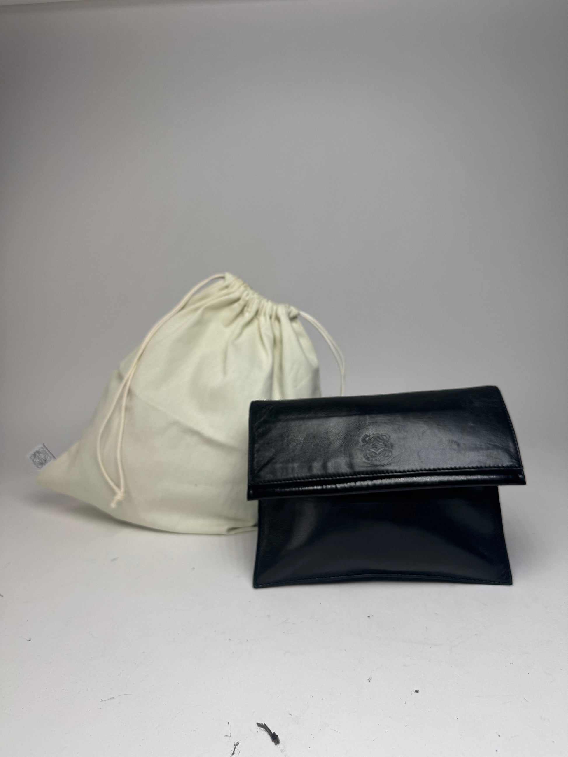 LOEWE MADRID Black Leather Accordion Clutch. This vintage clutch is crafted from exceptionally soft black leather and features a magnetic flap closure with three interior compartments, giving it an accordion-style structure. The Loewe Anagram logo is embossed prominently on the front. Introduced in the 1970s, the Anagram—designed by Spanish artist Vicente Vela—has become an enduring symbol of Loewe’s craftsmanship and heritage.