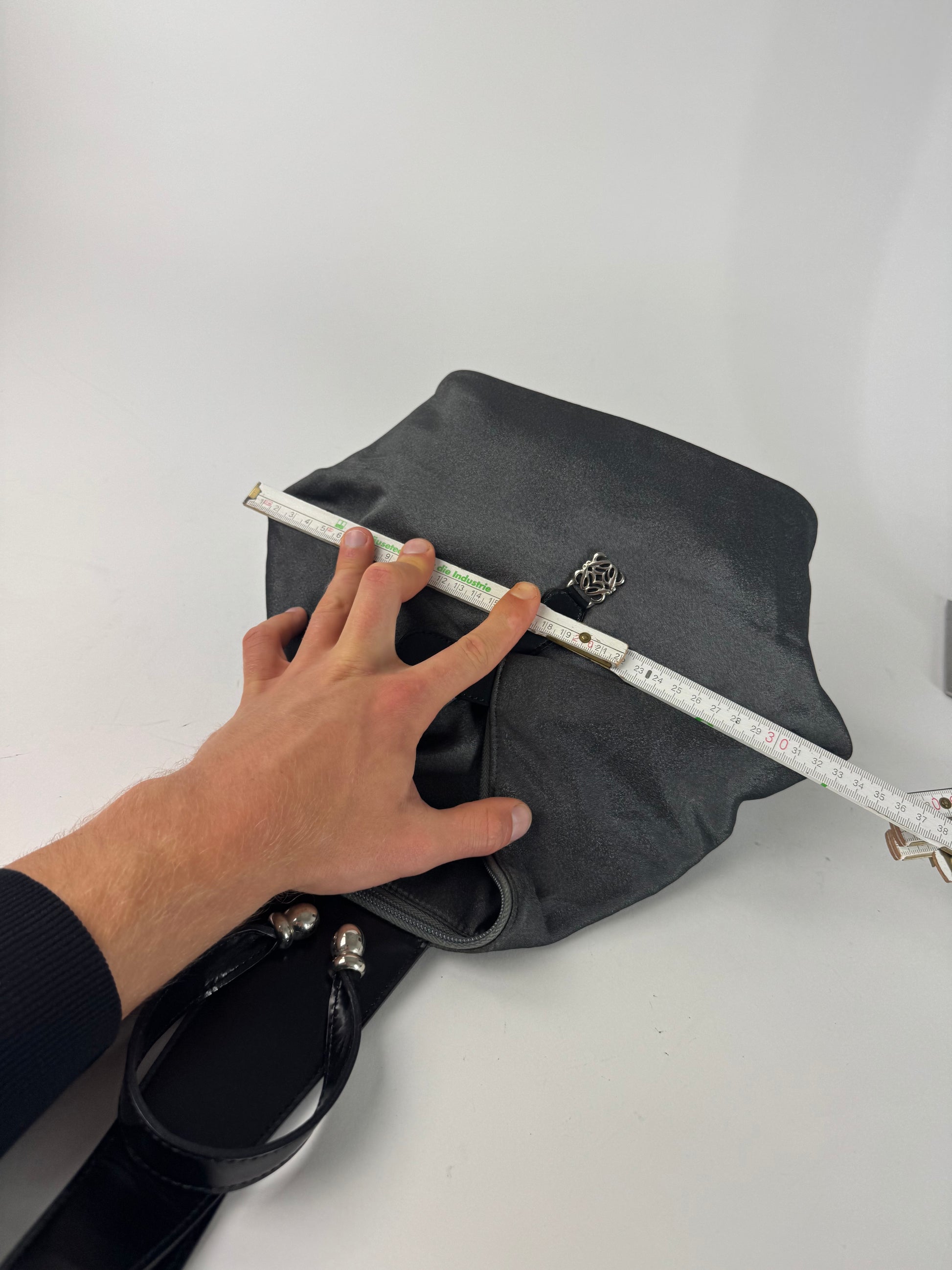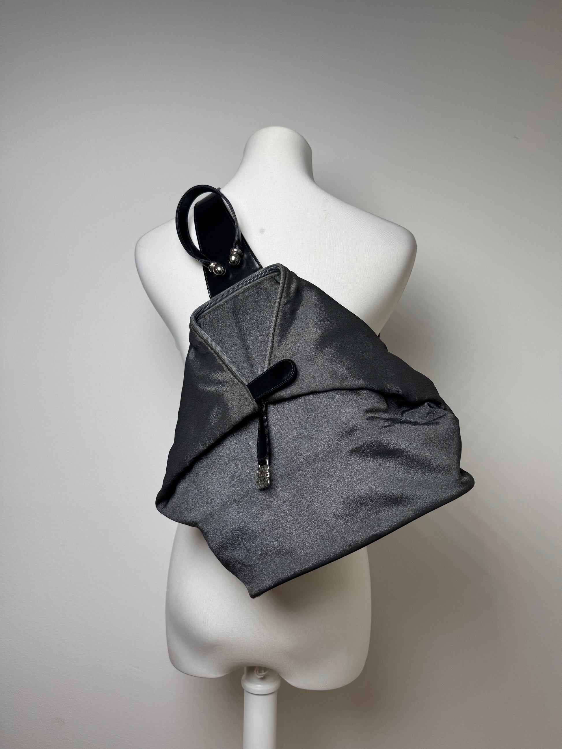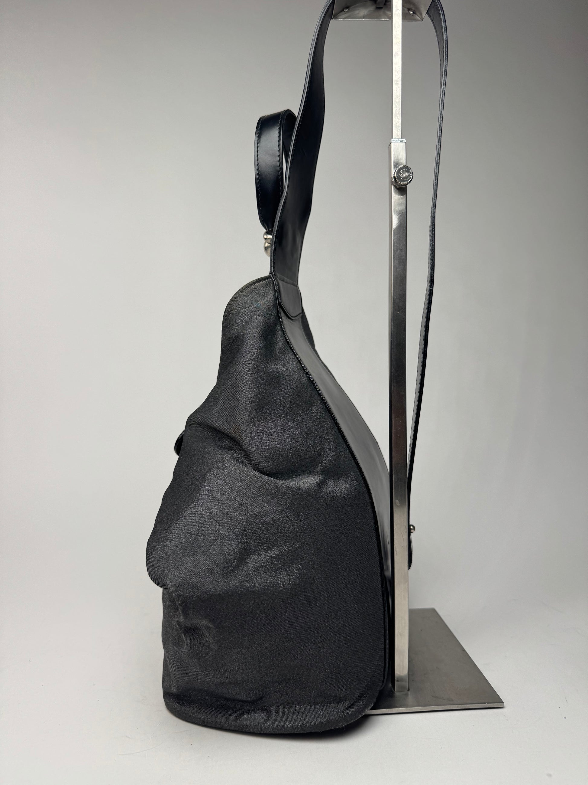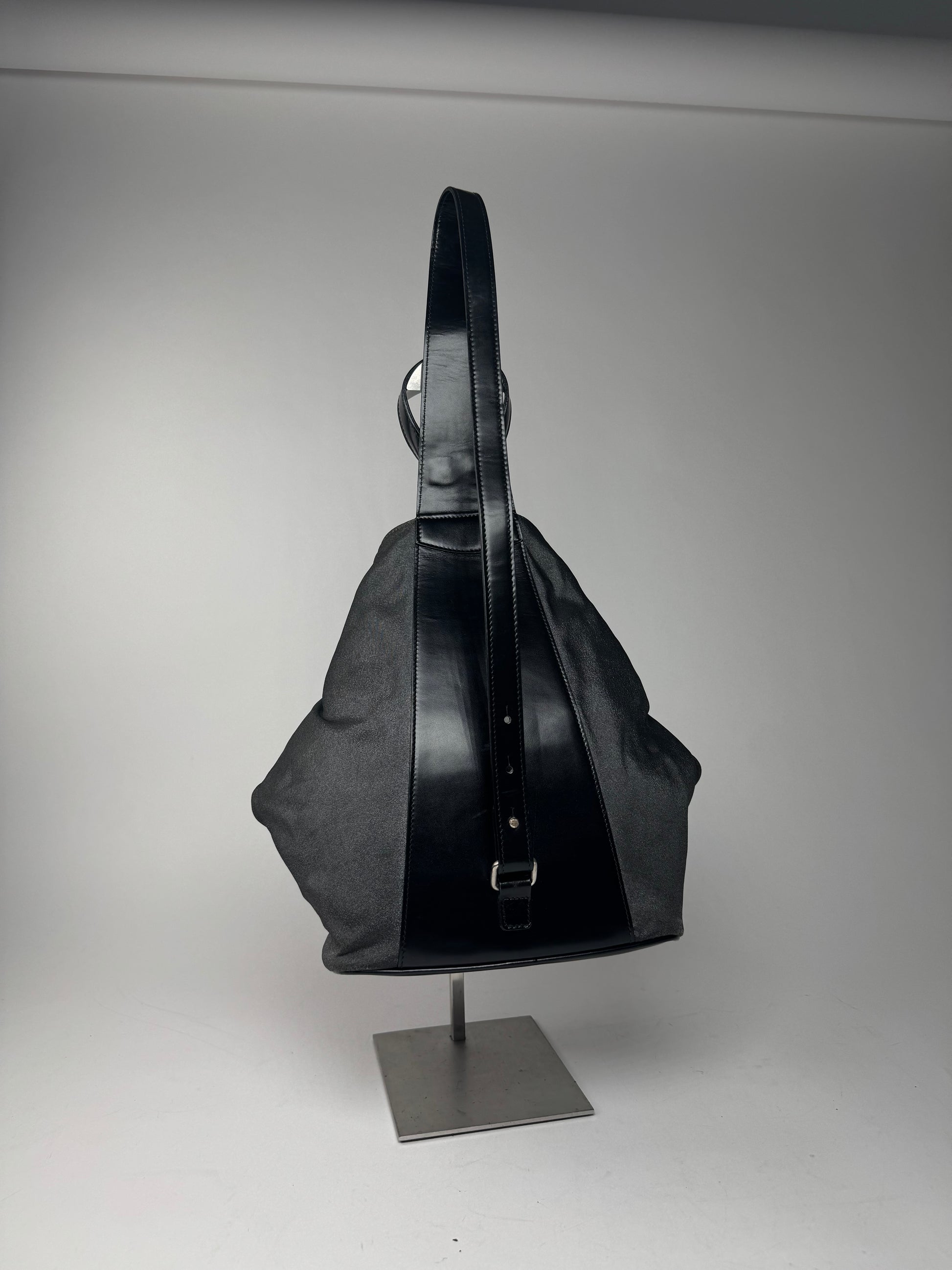 LOEWE MADRID Vintage Anton Backpack / Shoulder Bag. This versatile vintage bag by Loewe Madrid is crafted from gray canvas with black leather accents, combining a timeless design with functionality. The silver-tone steel hardware enhances its elegant appeal. The interior is lined with black canvas for a refined finish. Despite normal signs of use, the bag remains in very good condition. Made in Italy.