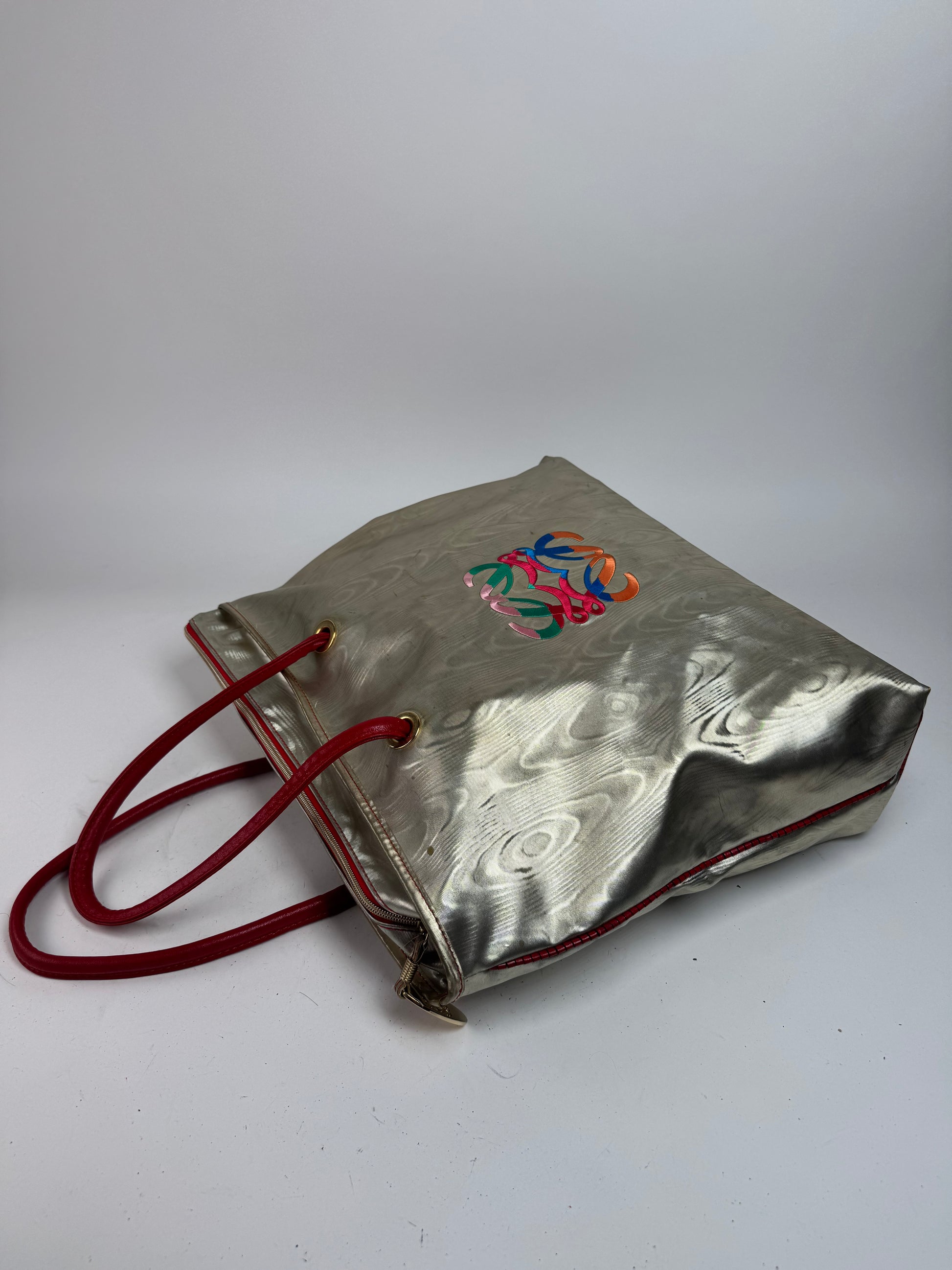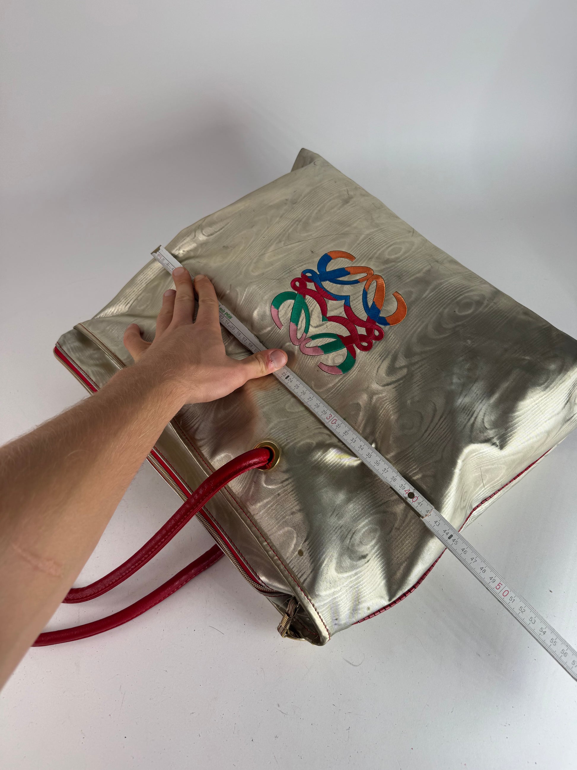 This vintage handbag from Loewe Madrid is crafted in pearlescent leather with contrasting red leather handles. The front features the multicolour Loewe anagram logo in pink, green, red, blue, and orange for a playful and iconic finish. It includes a top zipper closure and a beige canvas interior. Made in Italy.