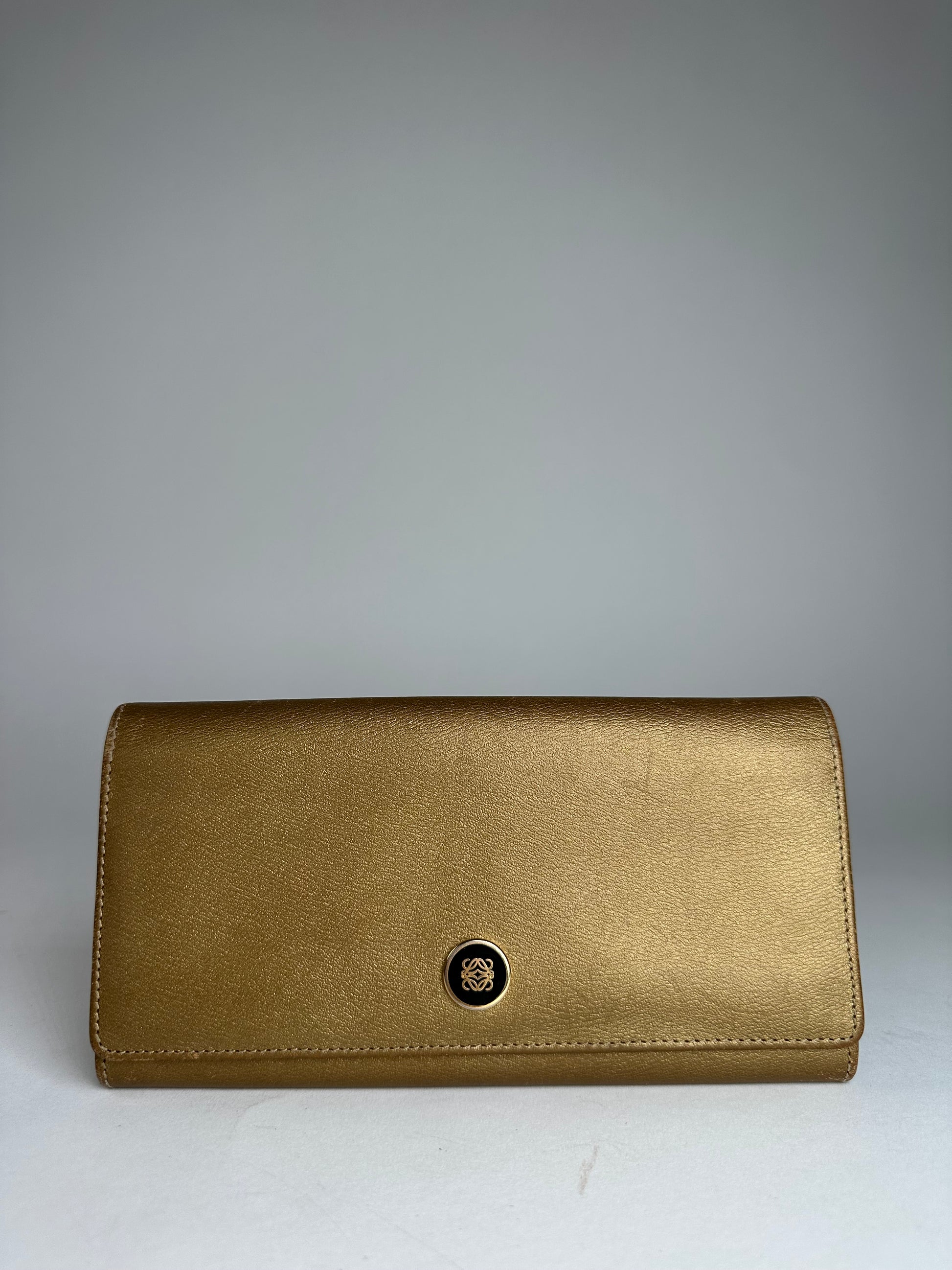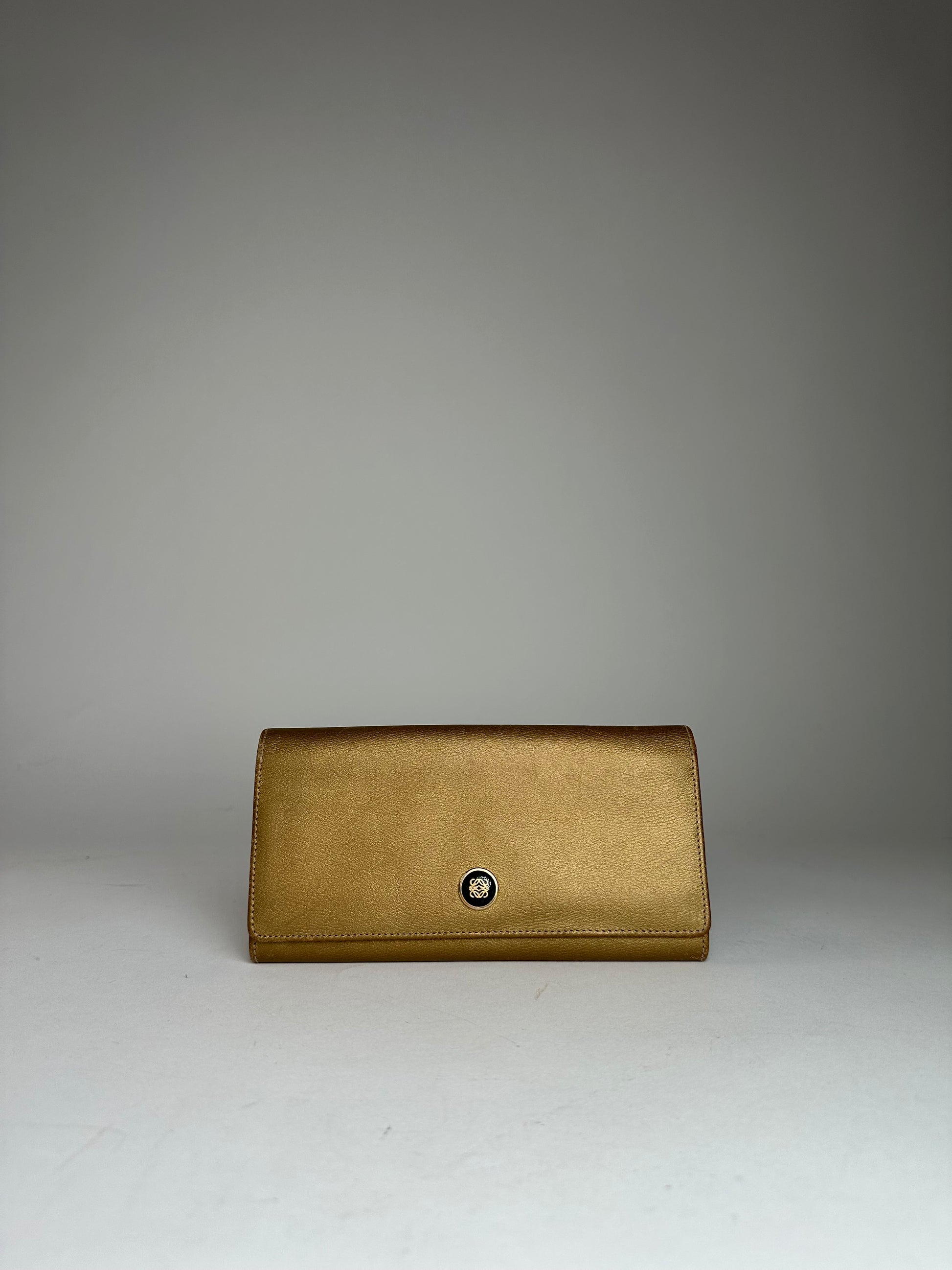 LOEWE Vintage Anagram Wallet. This elegant wallet is crafted of gold leather and features the Loewe Anagram logo in gold and black-tone steel on the front. The design includes a snap button closure and opens to a matching gold leather interior.