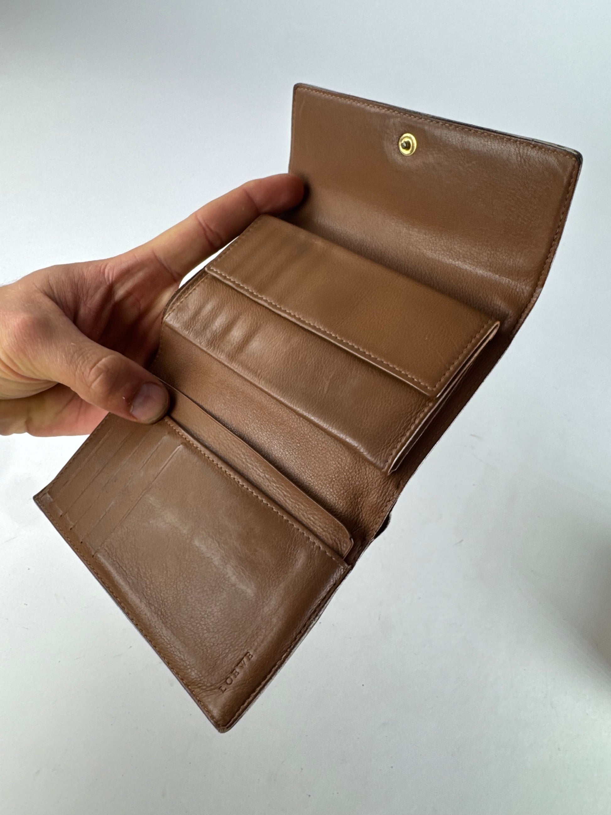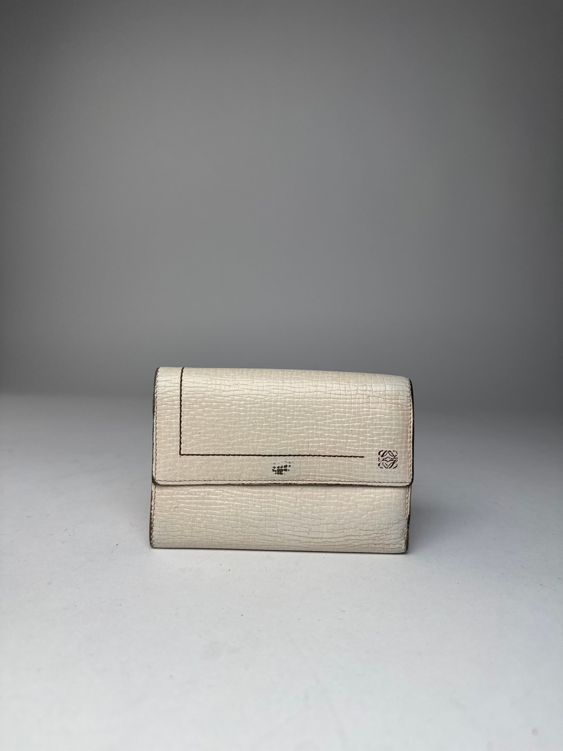 LOEWE Madrid Vintage Wallet. This chic wallet is finely crafted of white leather and features a brown Loewe anagram logo on the front. The wallet features a snap button closure and opens to a brown leather interior.