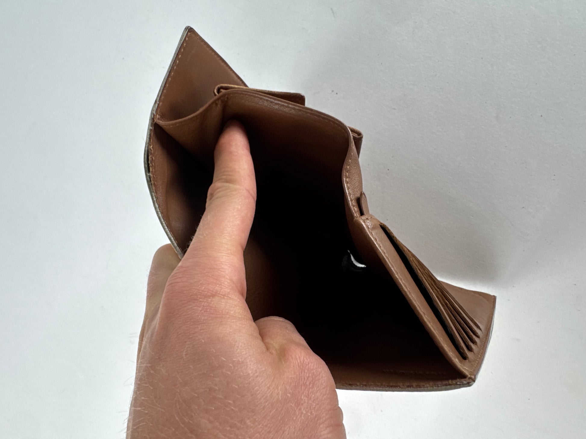 Condition Details: The exterior leather is clean and beautiful in very good condition, with a noticeable stain on the front. The interior leather is clean and in great shape.