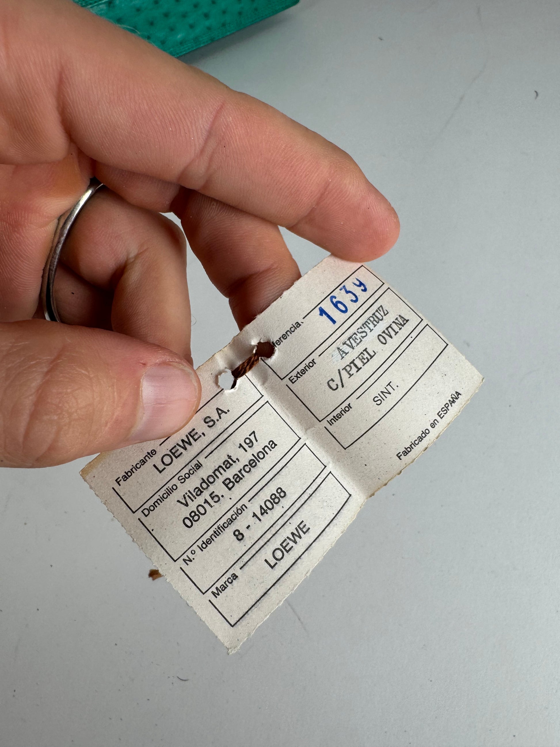 LOEWE MADRID Vintage Belt Bag. This chic accessory is finely crafted of turquoise ostrich leather with gold-tone steel hardware. It features a magnetic flap closure and comes with the original Loewe purchase receipt. Likely dating back to the 1980s, this piece reflects Loewe’s heritage of fine leather craftsmanship and bold design.