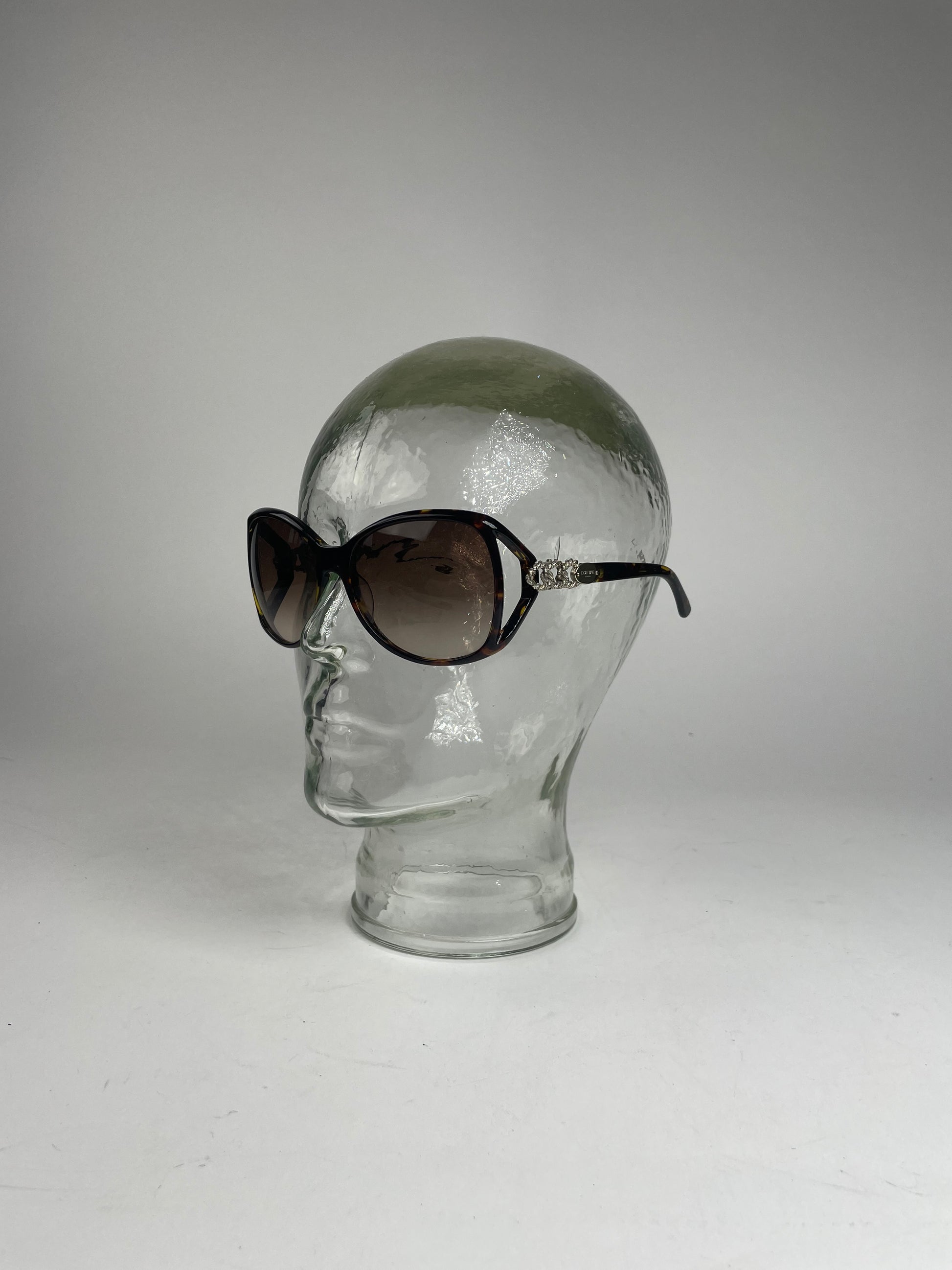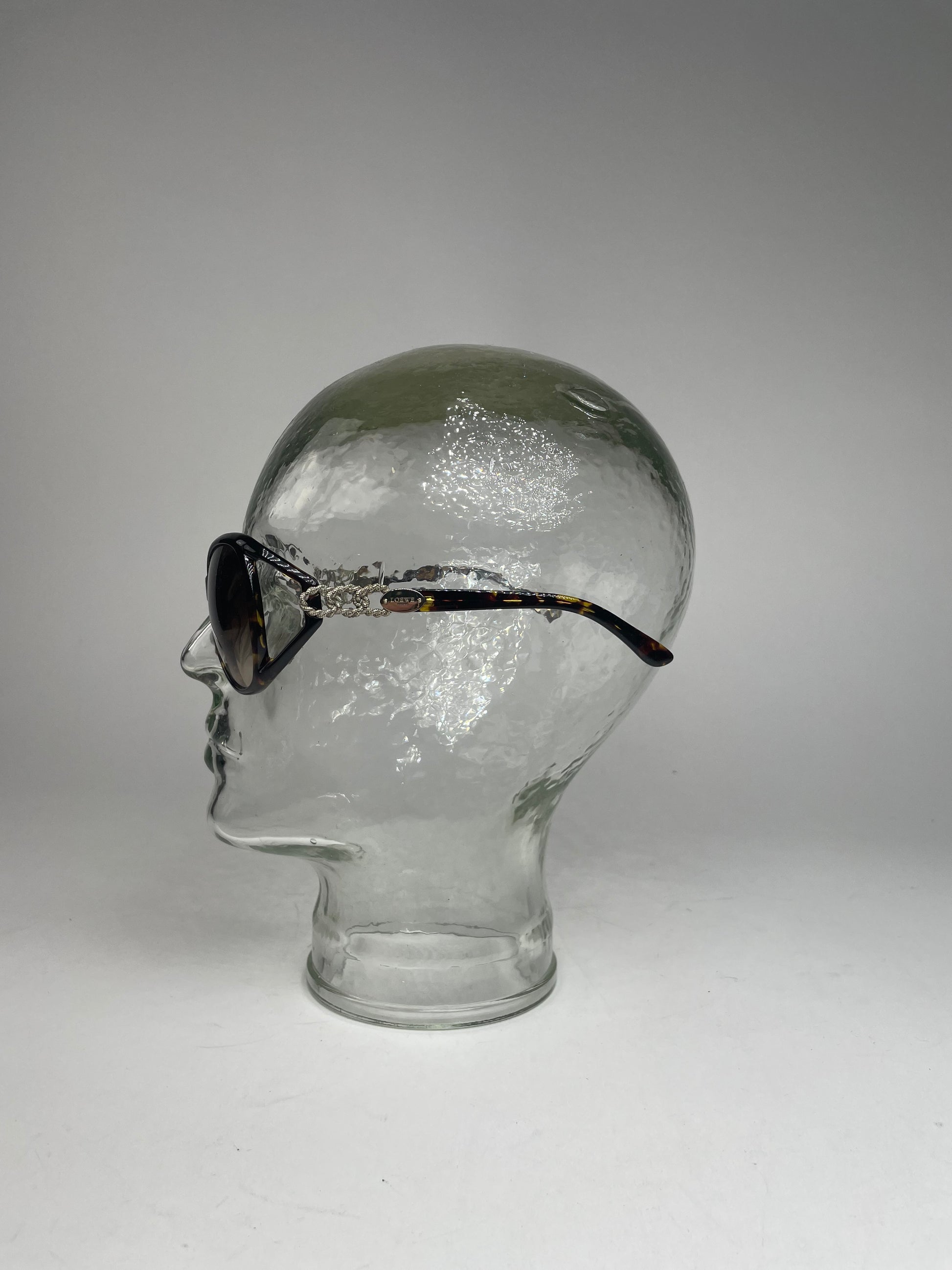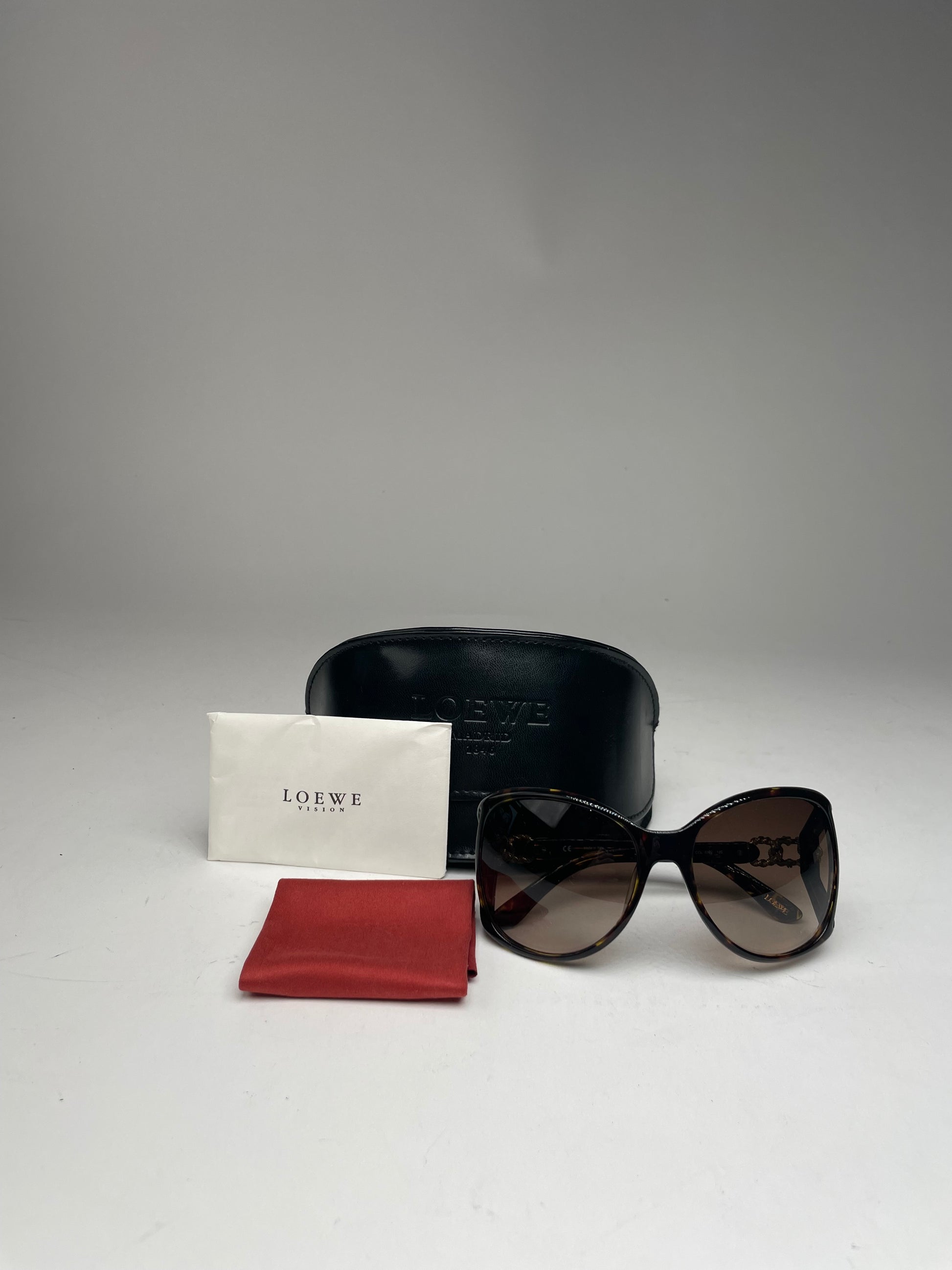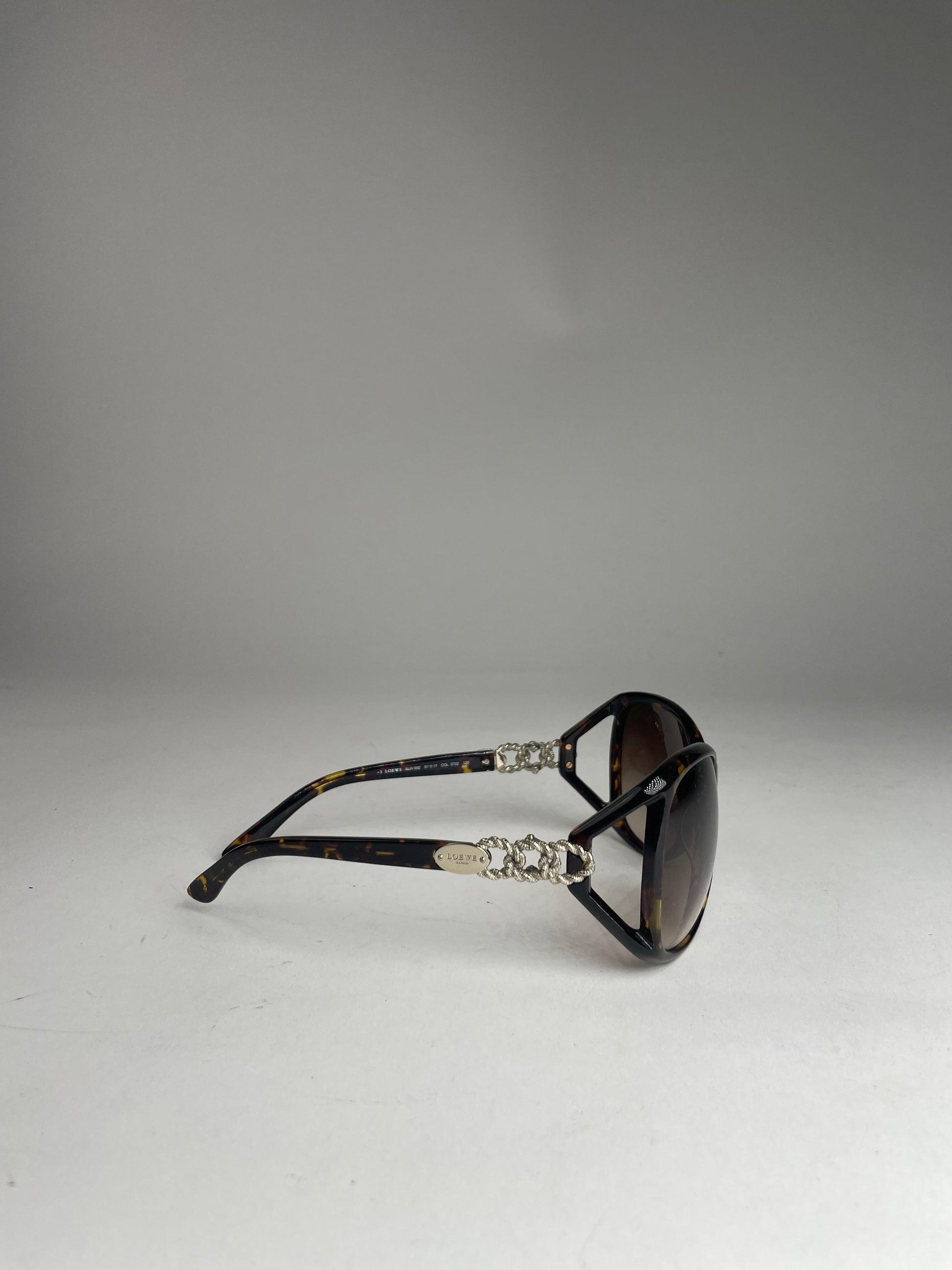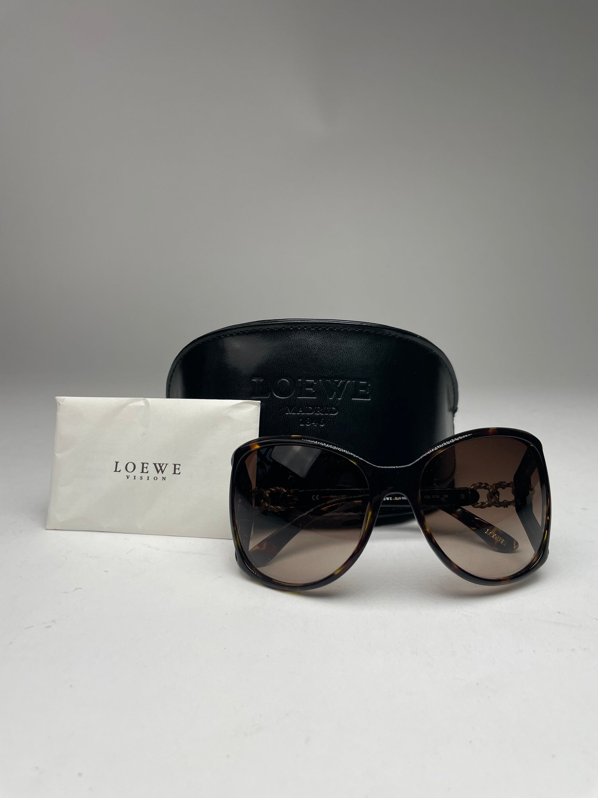 LOEWE MADRID Vintage Oversized Sunglasses. These vintage oversized sunglasses by Loewe Madrid feature a striking brown-patterned acetate frame combined with intricately braided silver-tone steel temples. The brown-tinted lenses offer a stylish and timeless look. Despite minor scratches, the sunglasses remain in very good condition. Made in Italy. The sale includes the original Loewe sunglasses case, authentication card, and cleaning cloth.