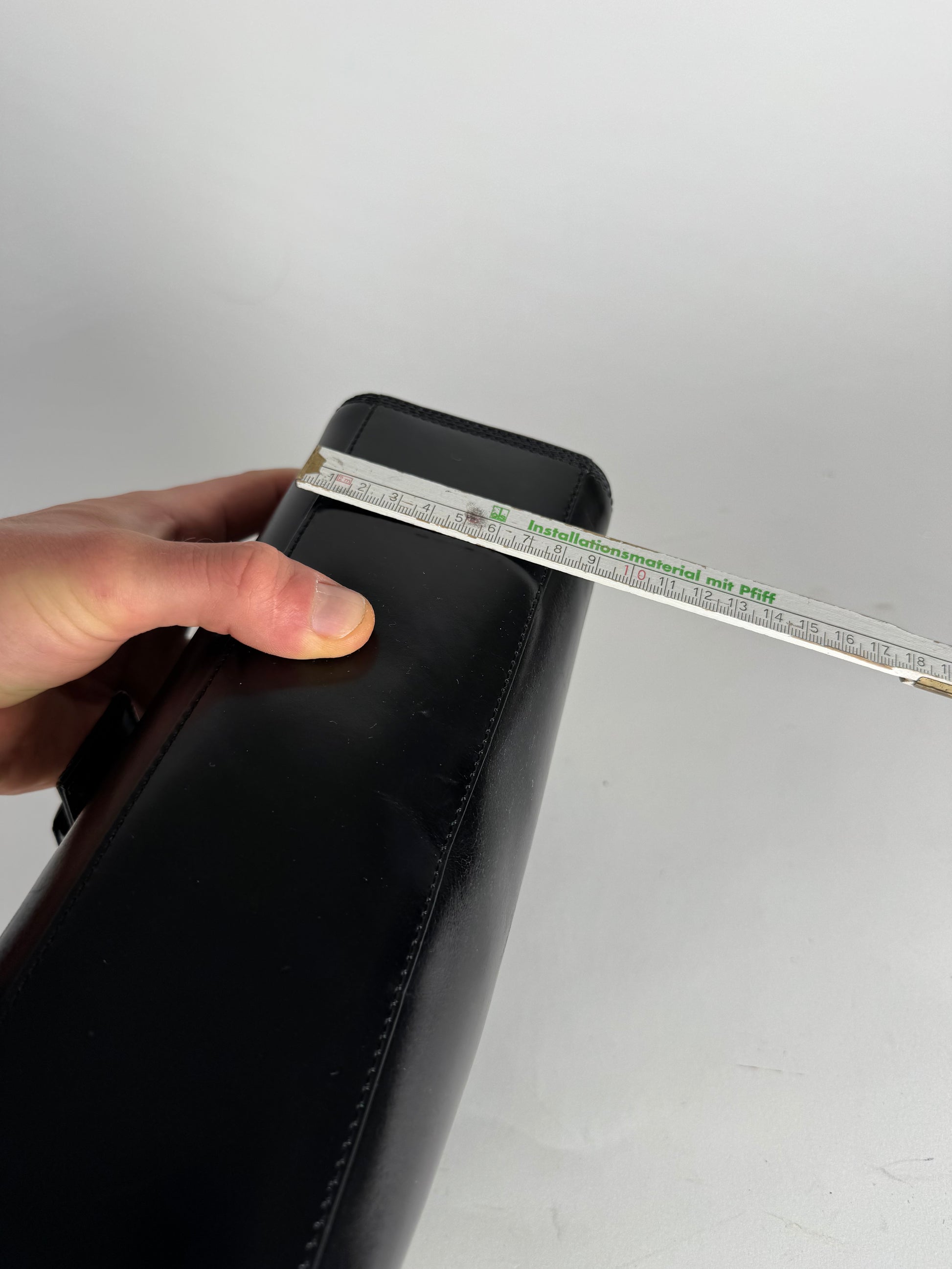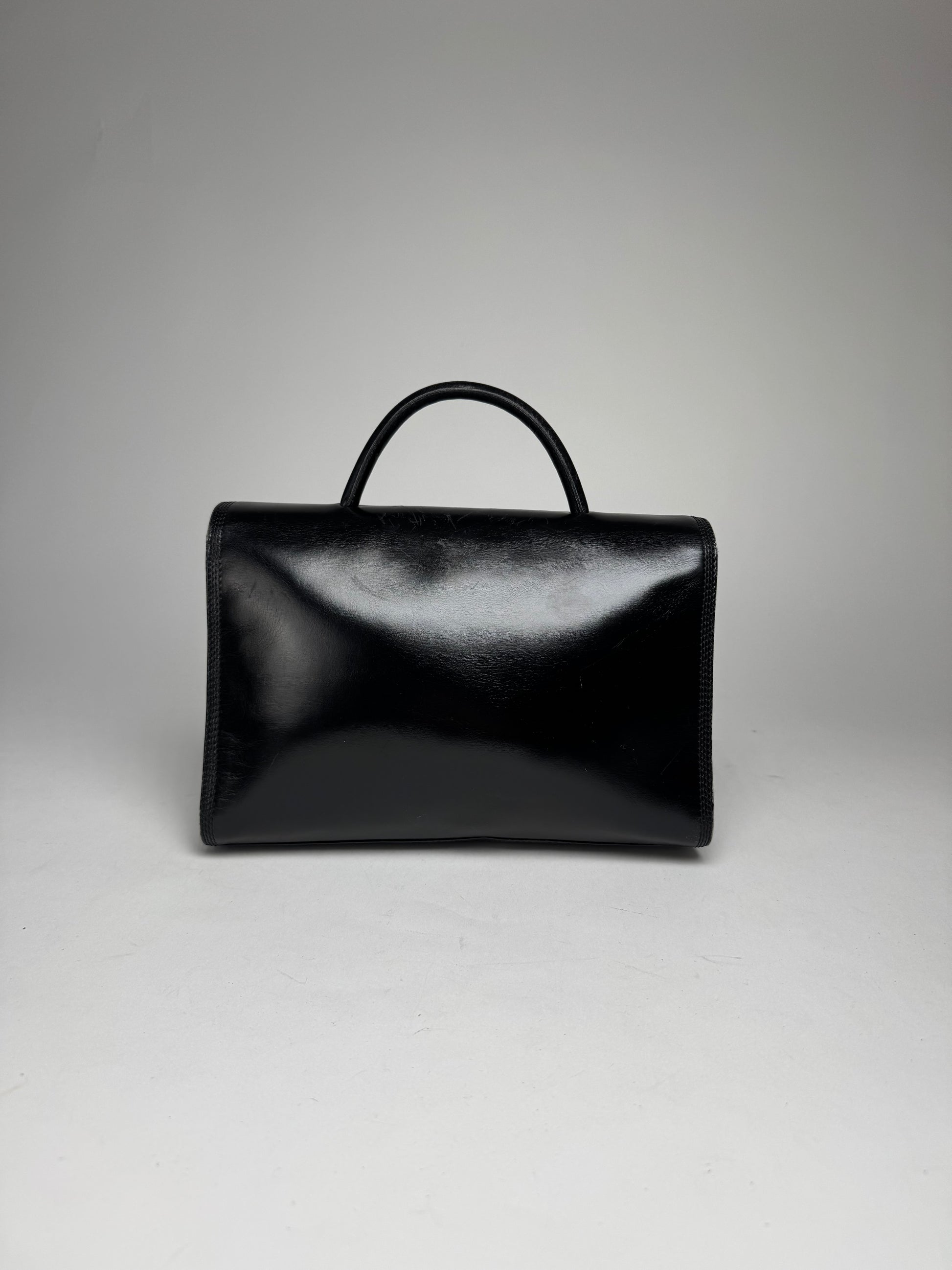 This vintage handbag is crafted from black leather and features a short handle. The interior lining is sticky and damaged; therefore, despite minor scratches and stains, the overall condition is best described as good. Made in Spain.