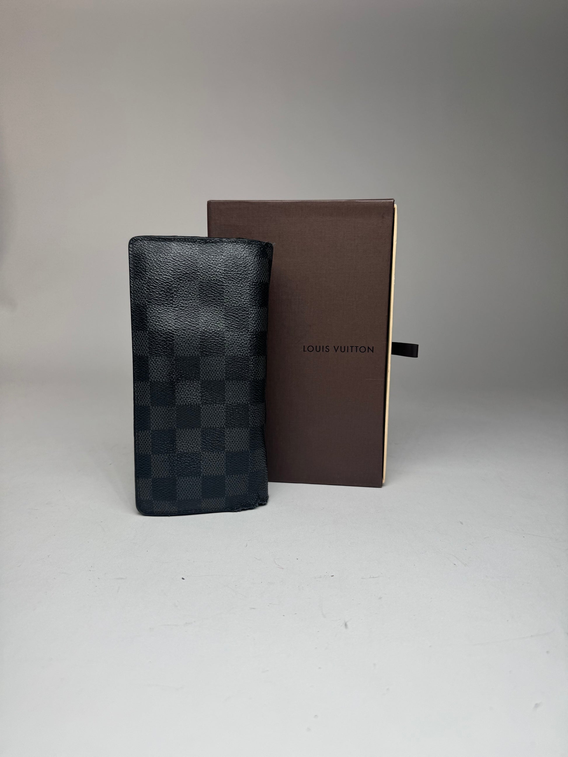 LOUIS VUITTON Vintage Card Holder / ID Case. This vintage Louis Vuitton card holder is crafted from black and grey Damier monogram canvas, combining functionality with a sleek and timeless design. It features a zip closure and comes with the original Louis Vuitton box. Despite slightly bent material, the item remains in very good condition. Made in France, it includes the initials T.M. stamped on the exterior. A refined unisex accessory.