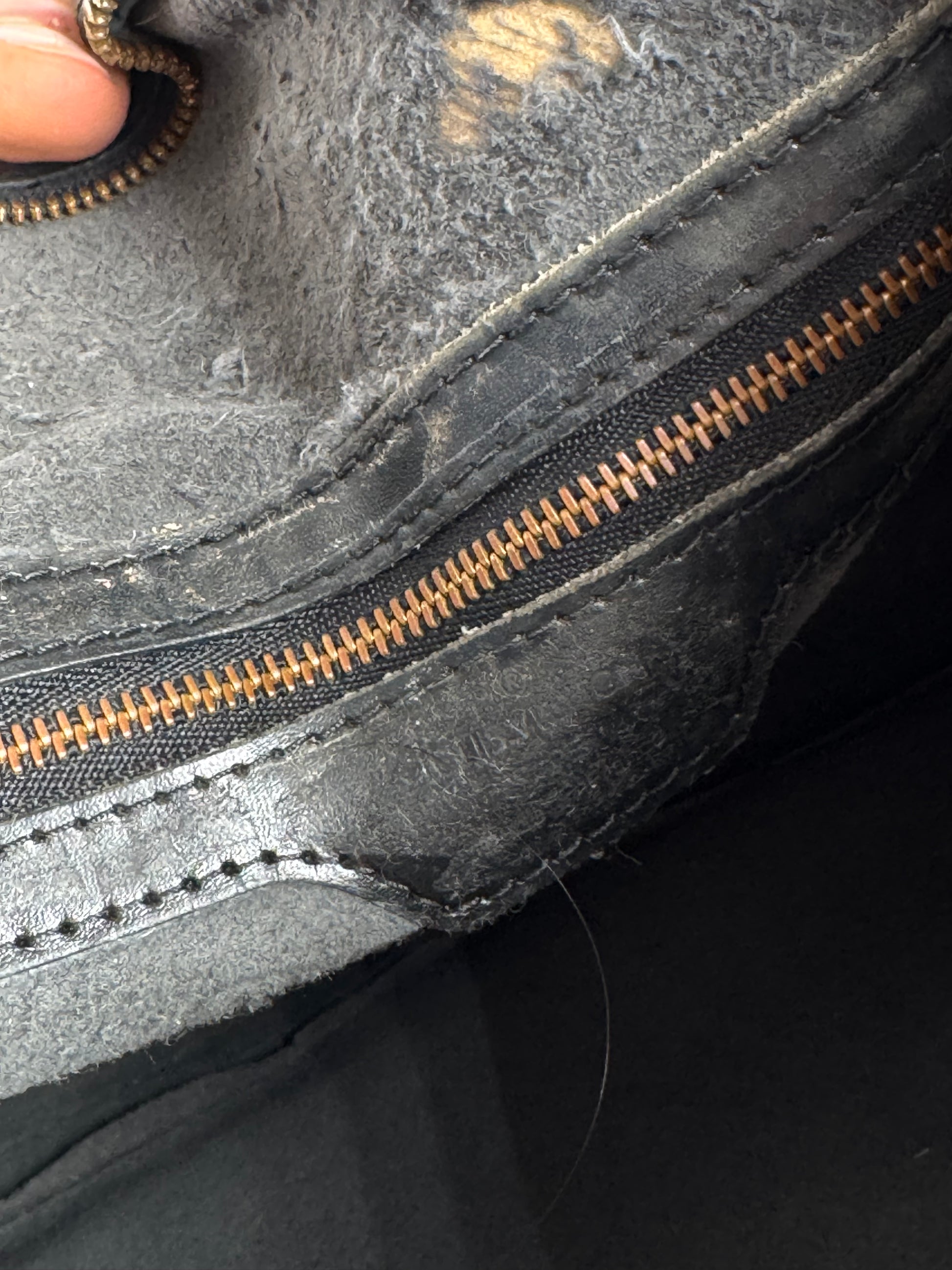 Condition Details: The leather remains in good condition despite signs of wear, including material imperfections inside and on the bottom, as well as stains and scratches. One of the two zipper pulls is missing. The overall structure remains firm, and the bag is still a beautiful piece.