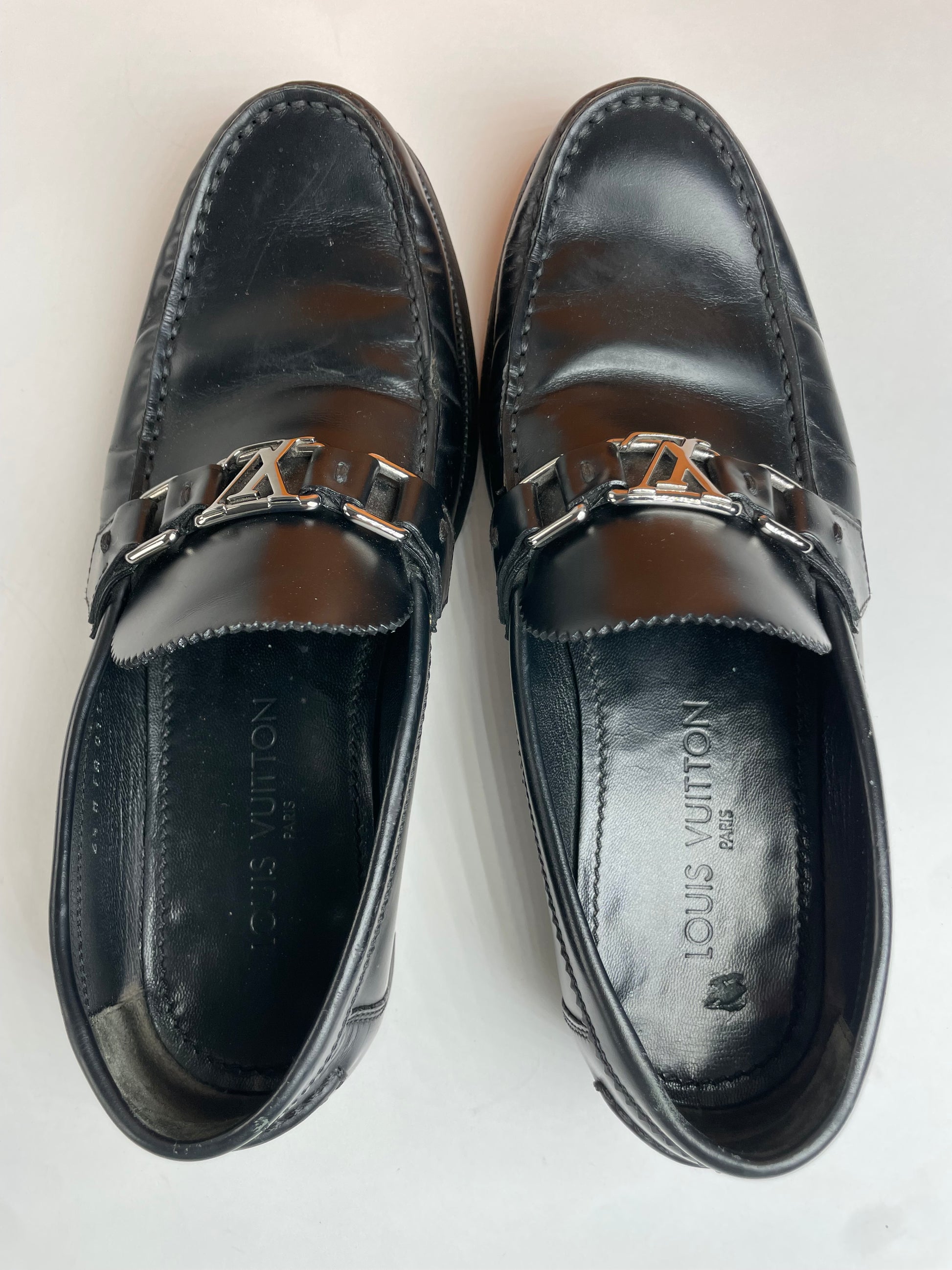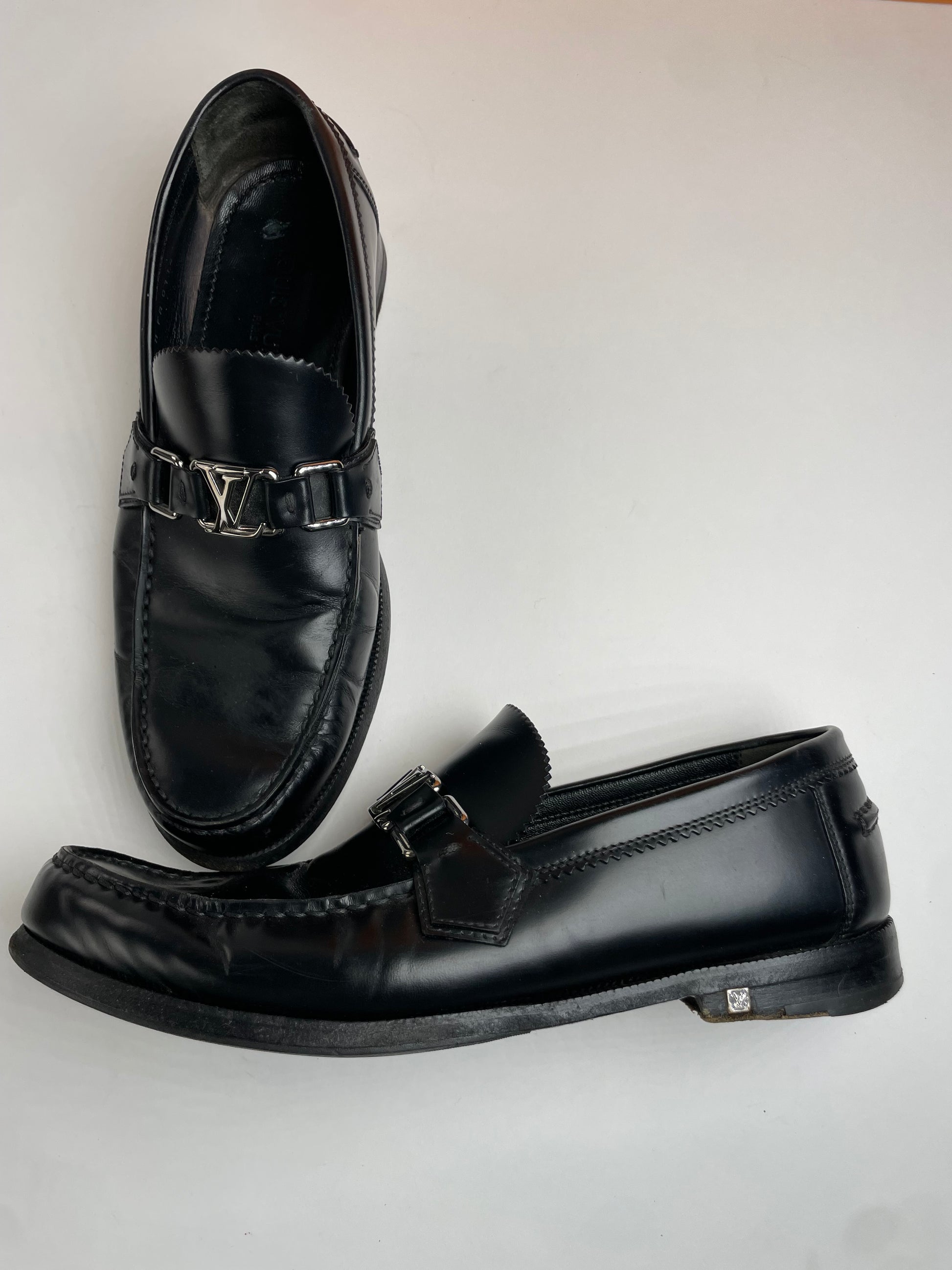 LOUIS VUITTON Vintage Loafers. These chic loafers are crafted from smooth black leather and feature a silver-tone steel LV logo across the instep, with an additional silver Louis Vuitton appliqué on the heel. They come with a Louis Vuitton dustbag.