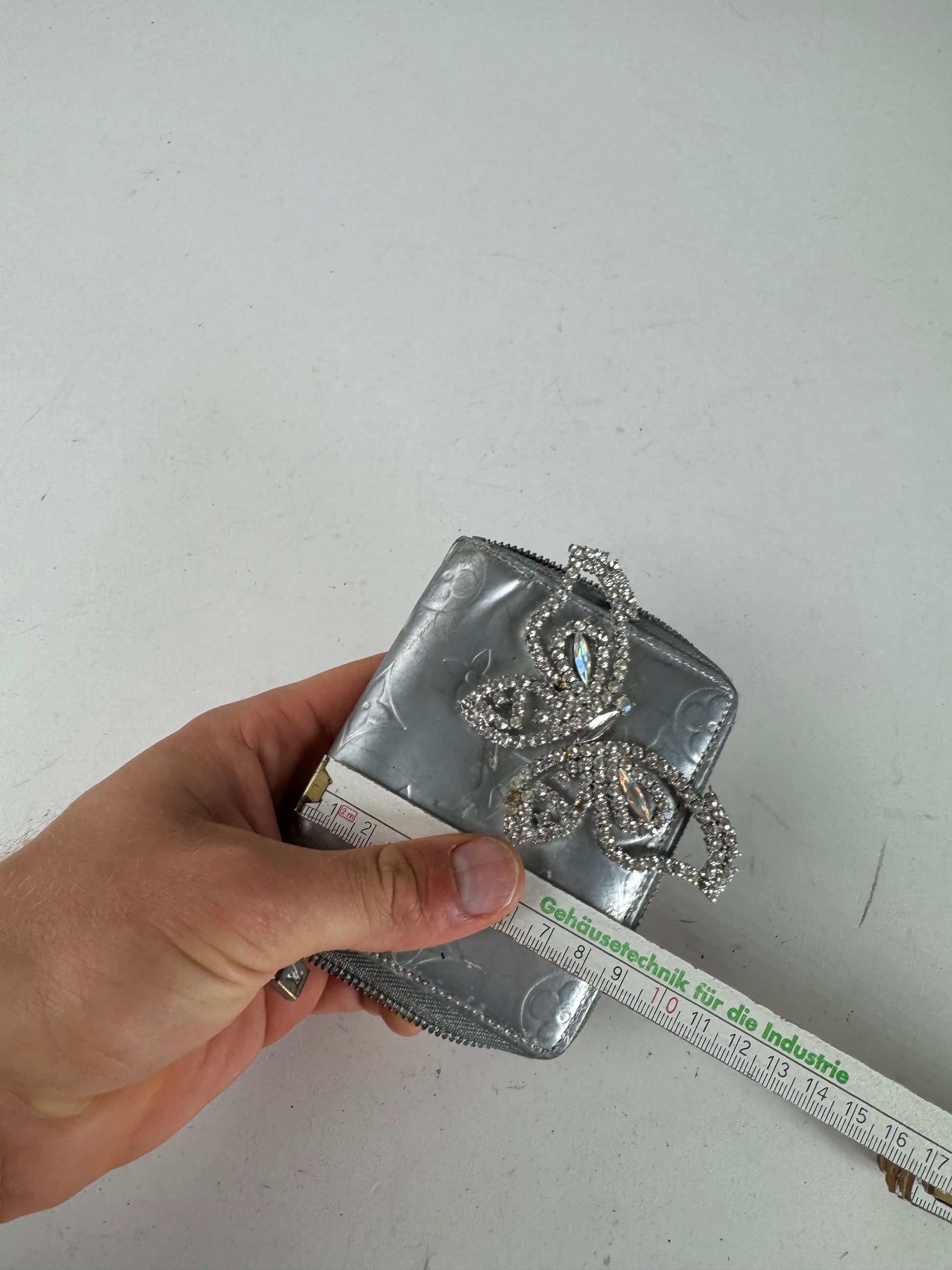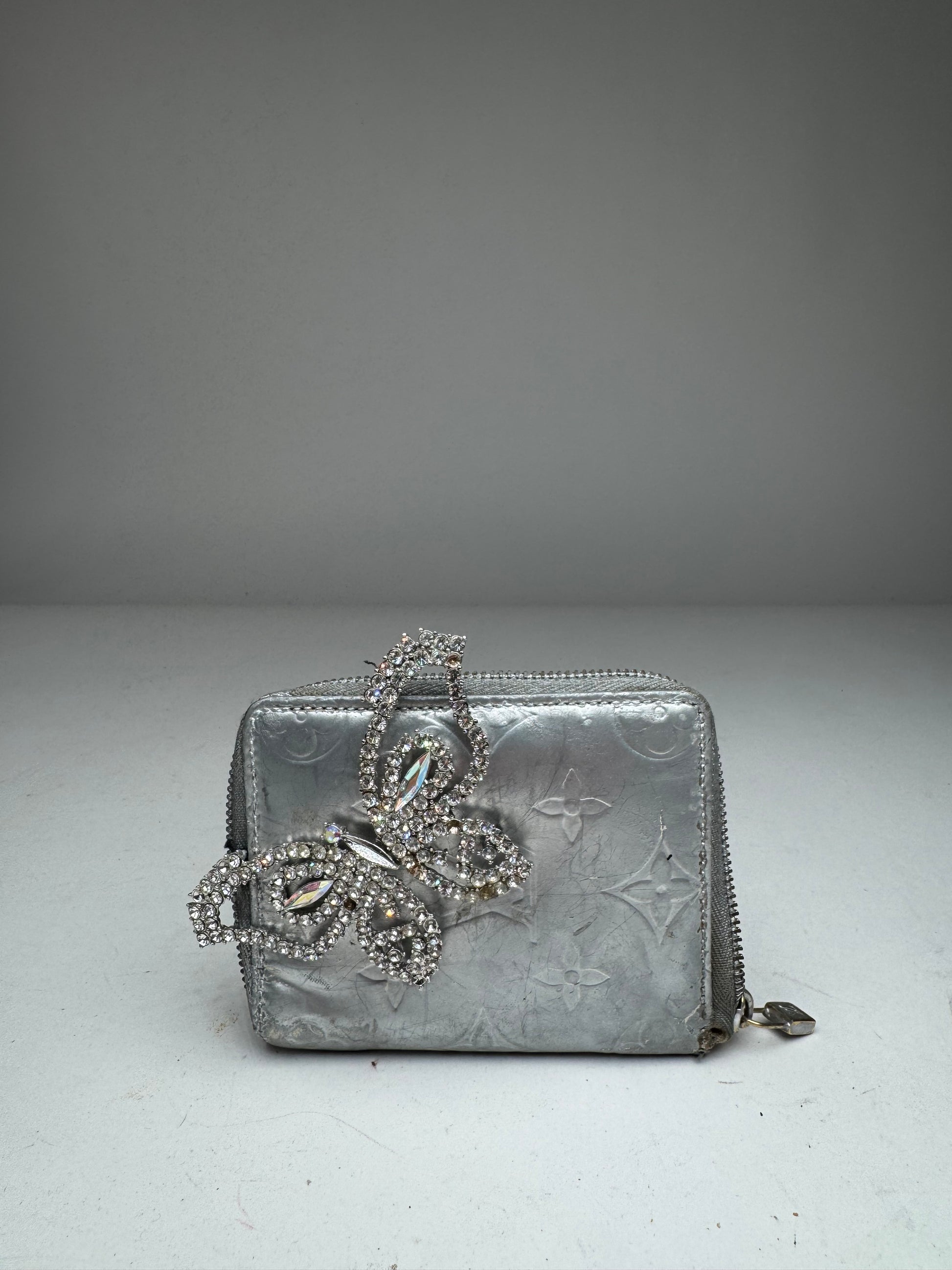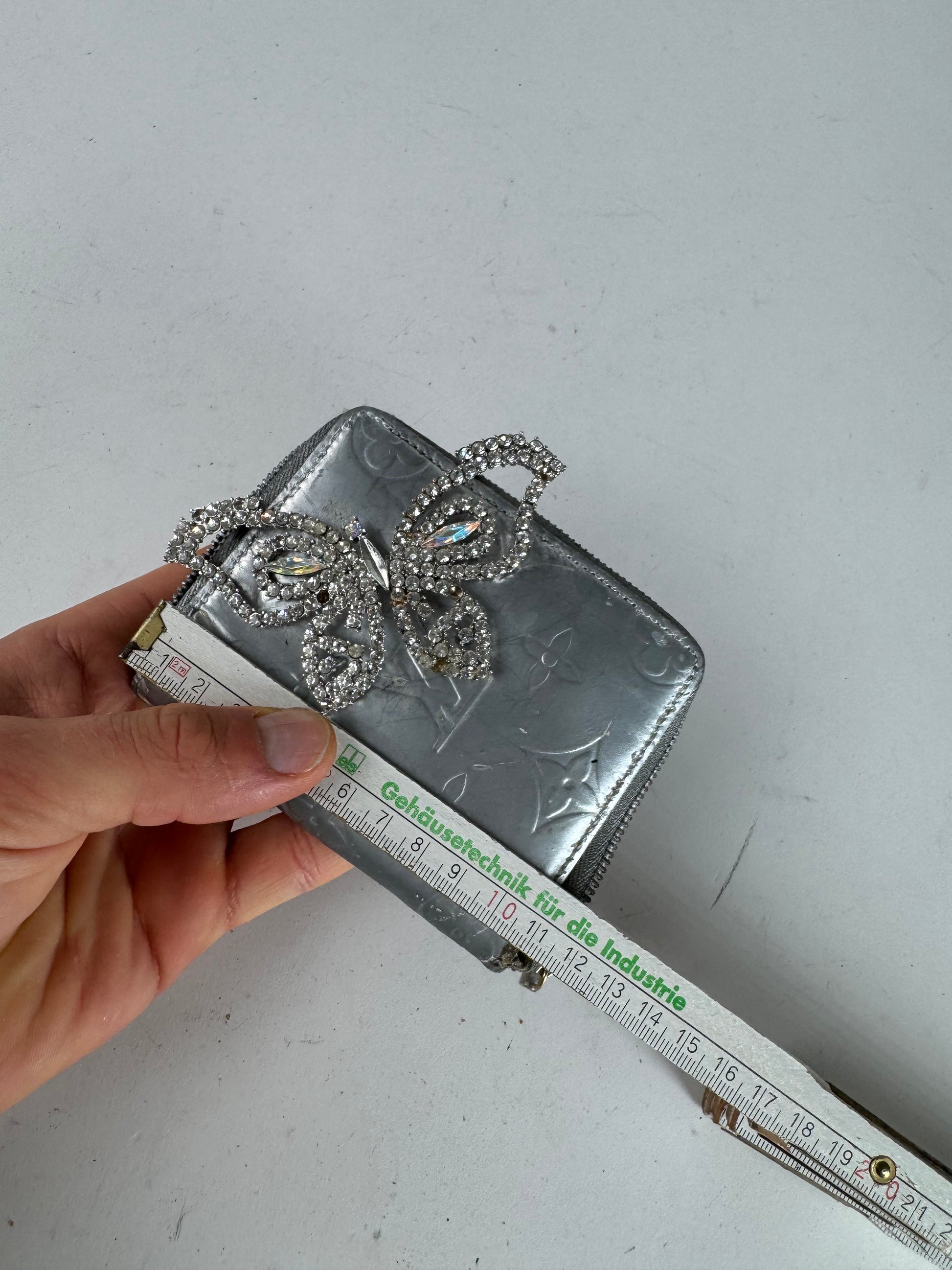 LOUIS VUITTON Silver Vernis Zippy Modified Wallet. This chic wallet is finely crafted of signature Louis Vuitton silver Vernis patent leather. This piece has been modified with a magnetic closure replacing the original zipper and features an added silver butterfly detail on the exterior.