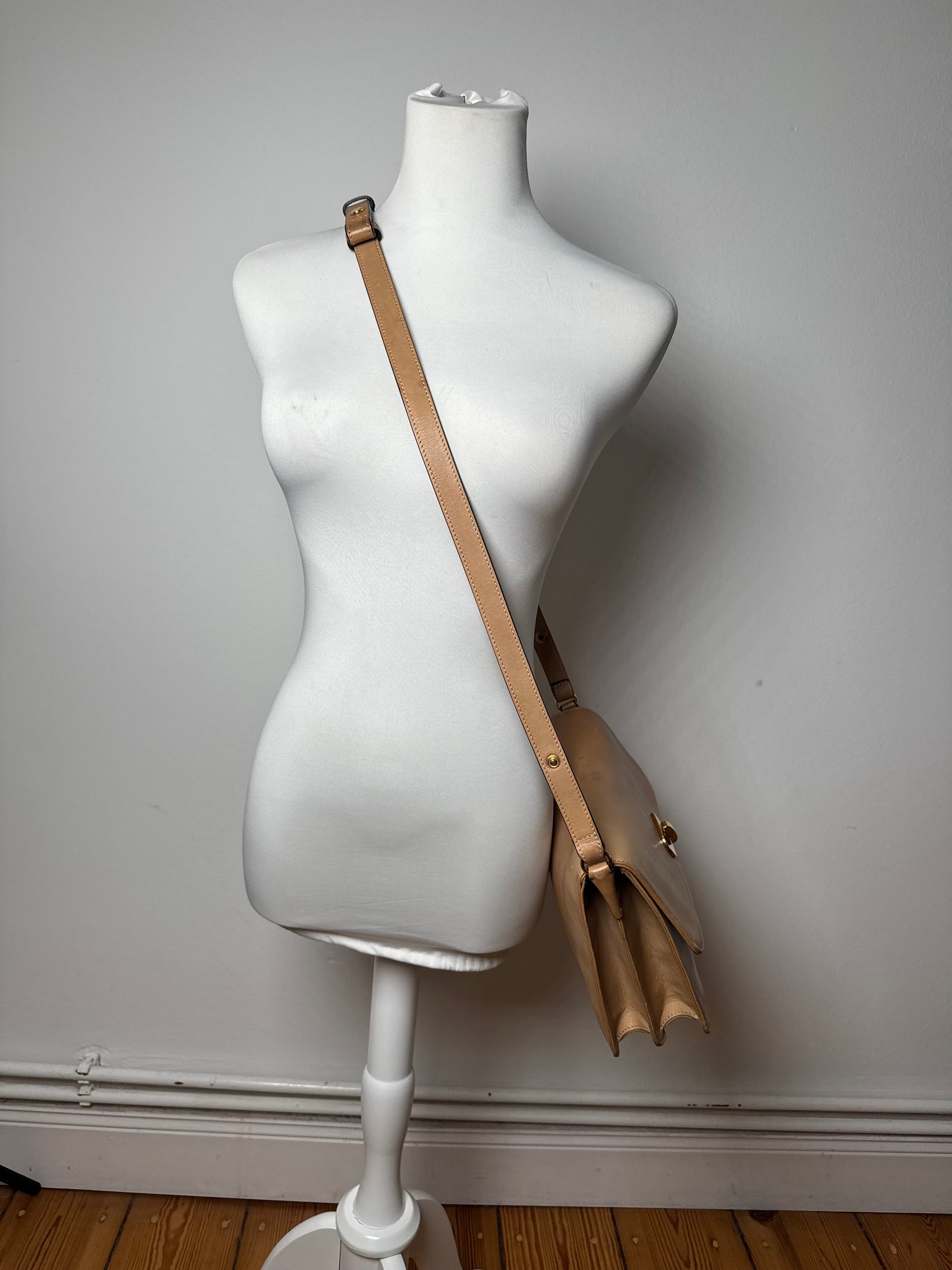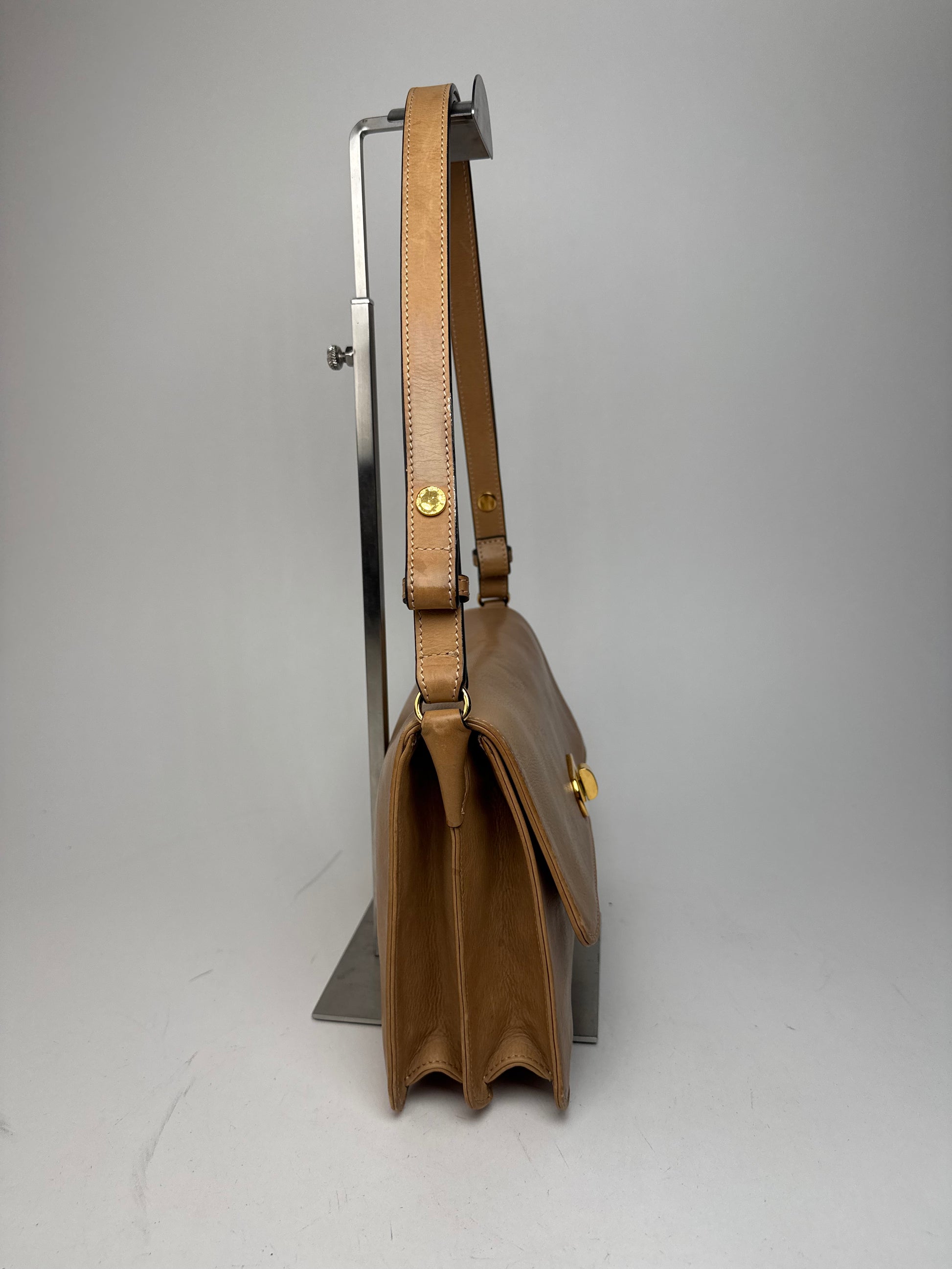 This versatile vintage handbag is finely crafted of camel-colored leather and can be worn as a shoulder bag with the strap or carried by the handle as a classic handbag. It features golden steel hardware and a twist-lock closure. The interior is lined with beige canvas. Made in Italy, this design reflects Marni’s modern yet timeless approach to Italian craftsmanship.