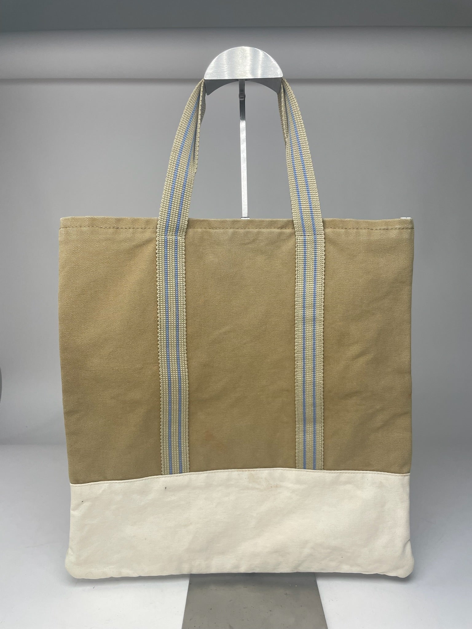 This chic vintage shopper bag by Marni is crafted from beige canvas with white accents and beige/blue striped handles. The bag is in very good condition, showing only normal signs of wear.