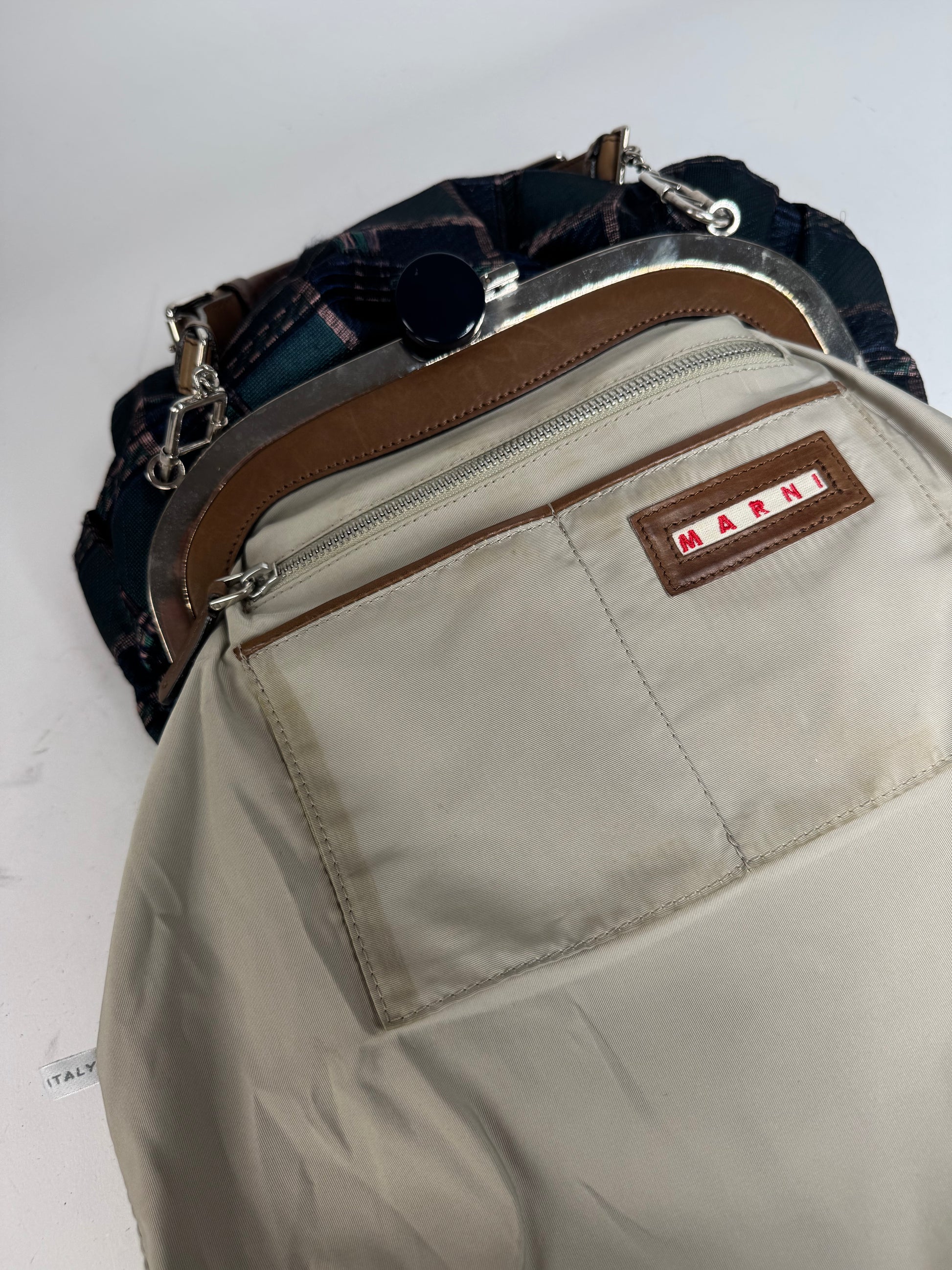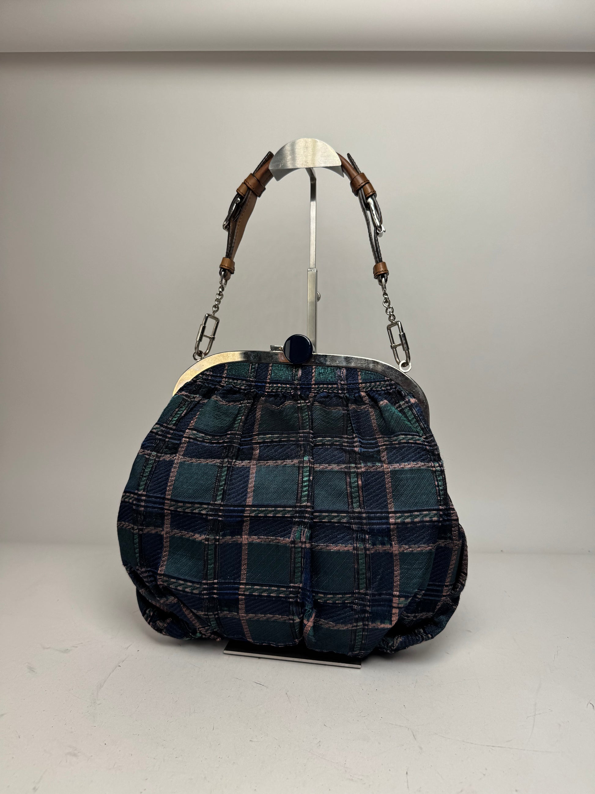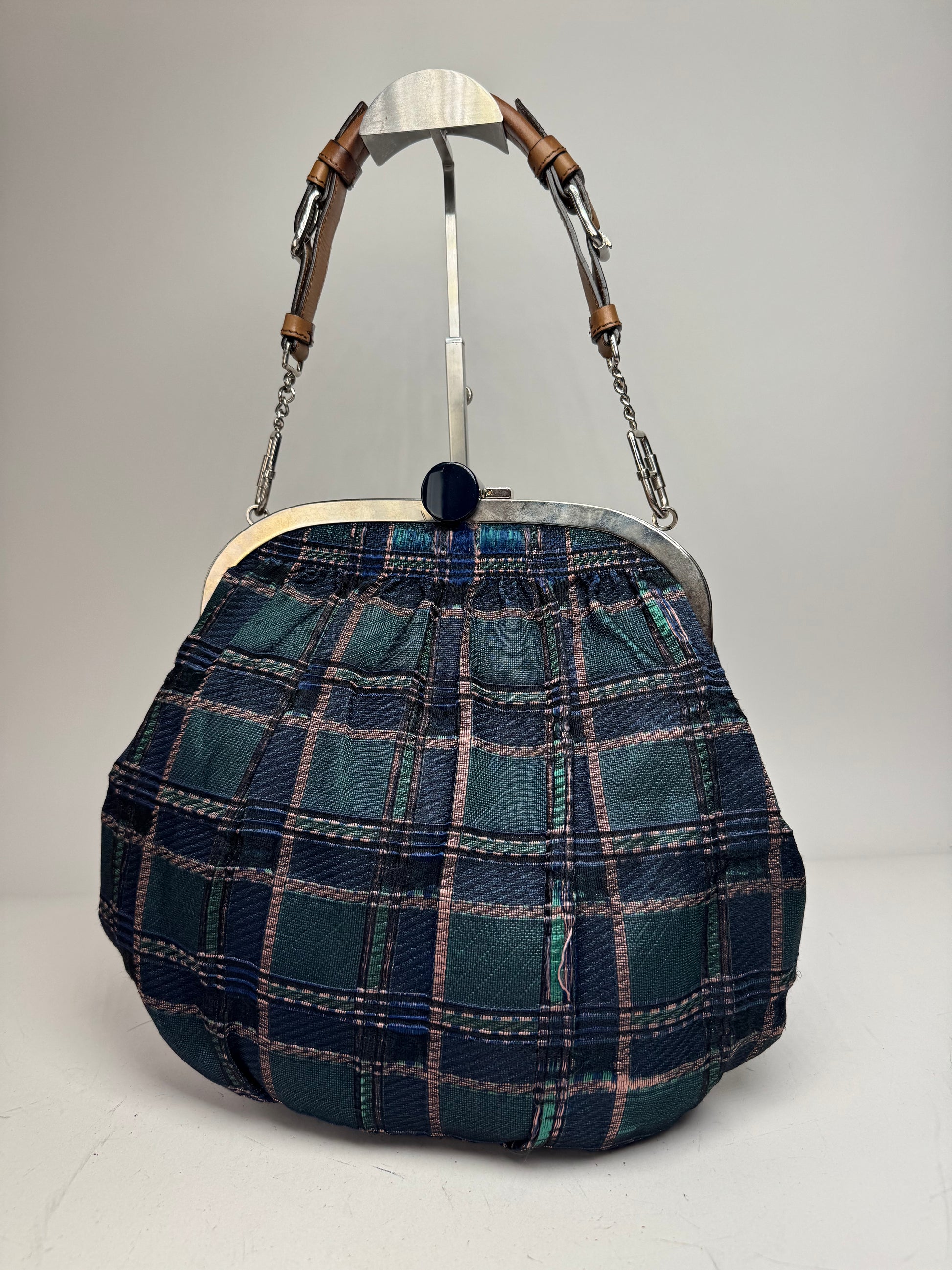 This unique vintage handbag from Marni is crafted in a textured canvas-wool blend with a variegated turquoise, blue, and rose colour palette. The bag features a chain-style silver-tone steel handle interwoven with brown leather for a refined finish. Designed with a flap closure and lined in beige canvas, this Italian-made piece blends artisanal texture with understated elegance.