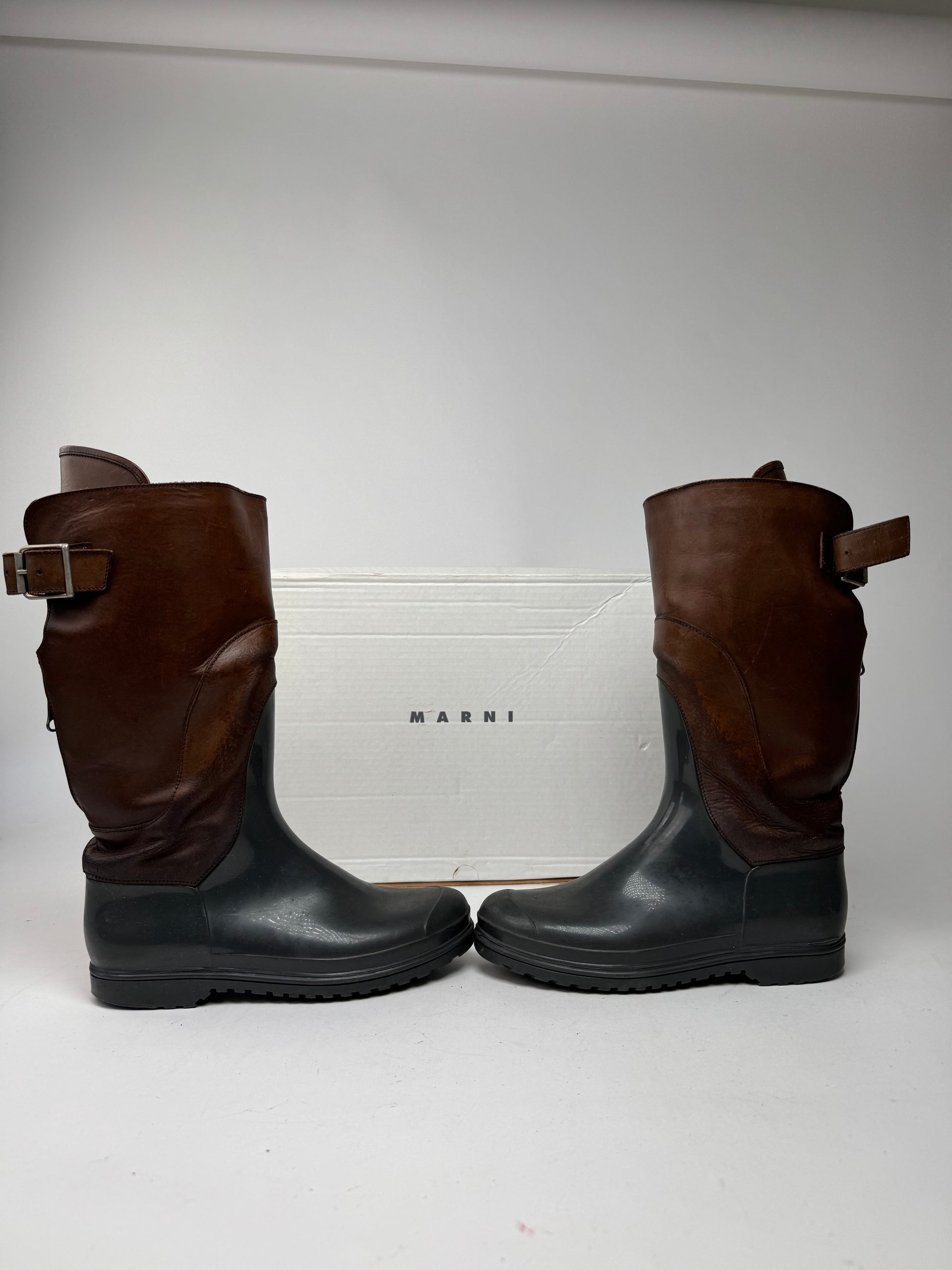 MARNI Vintage Leather & Khaki Boots. These unique vintage boots are crafted from brown leather and khaki-colored synthetic material, featuring a stylish adjustable strap with a buckle for a customizable fit.