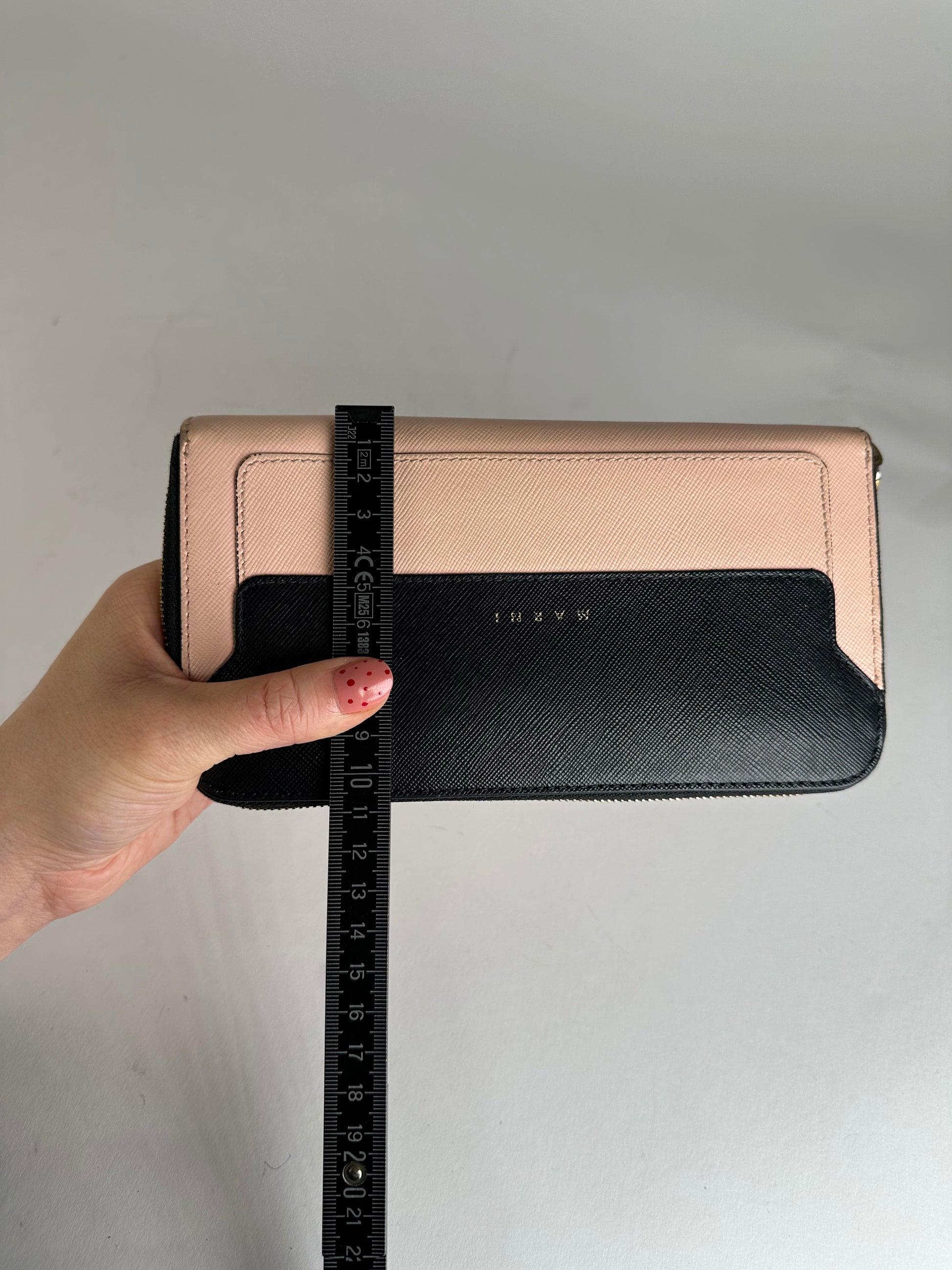 MARNI Vintage Wallet. This stylish wallet is crafted of black and rose-colored leather. It features a white MARNI logo lettering on the front and a top zipper closure. The hardware is silver-tone steel. Made in Italy.