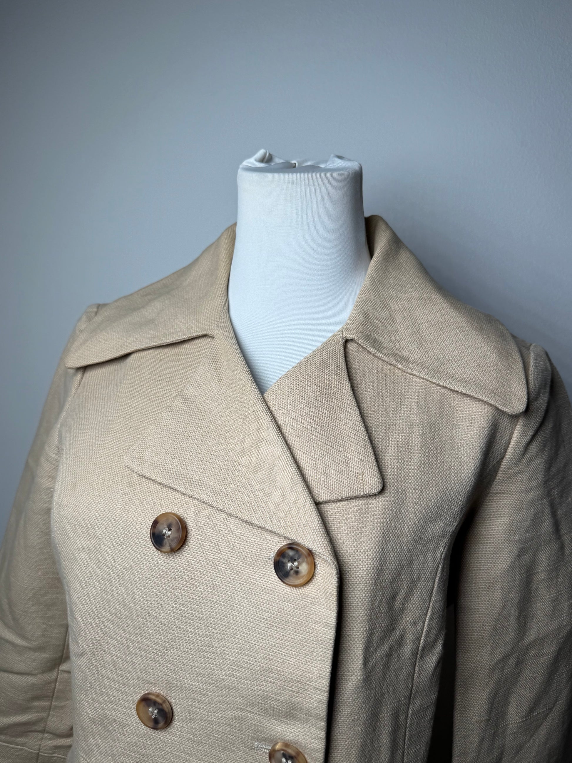 MARNI Vintage Trenchcoat. This stylish trenchcoat is finely crafted of beige linen and cotton fabric. Marni is an Italian luxury fashion house founded in 1994, acclaimed for its artistic aesthetic, refined tailoring, and innovative textile combinations. The coat features a structured silhouette in a breathable natural fabric blend. The mannequin shown in the photos is size 38/M.