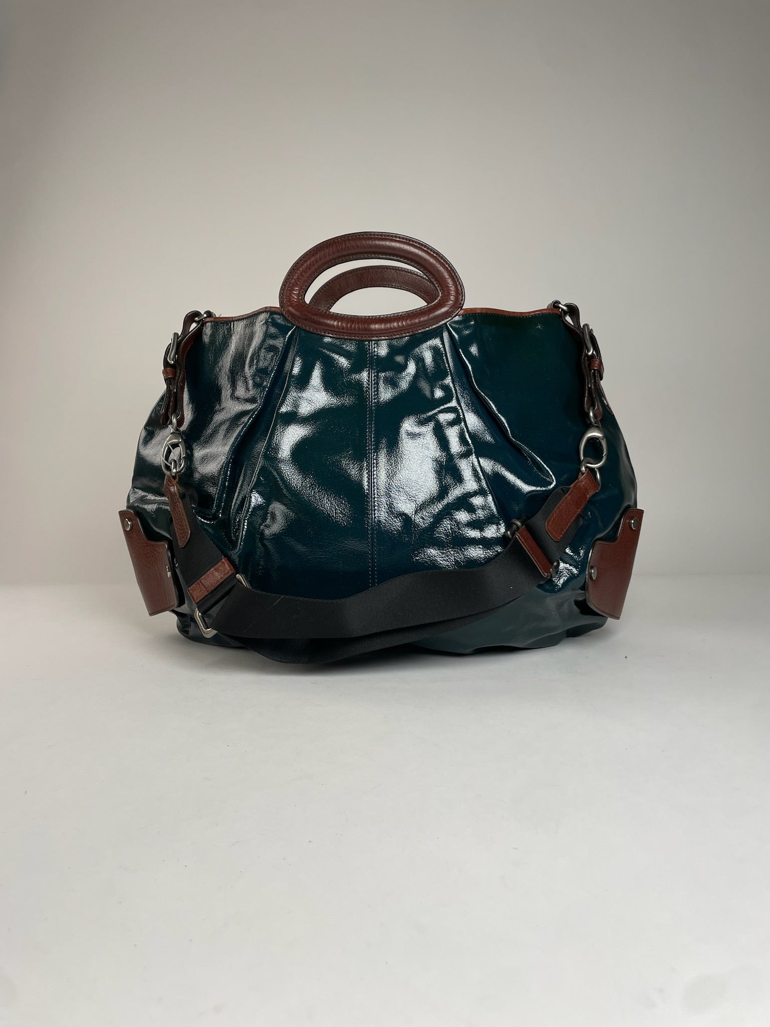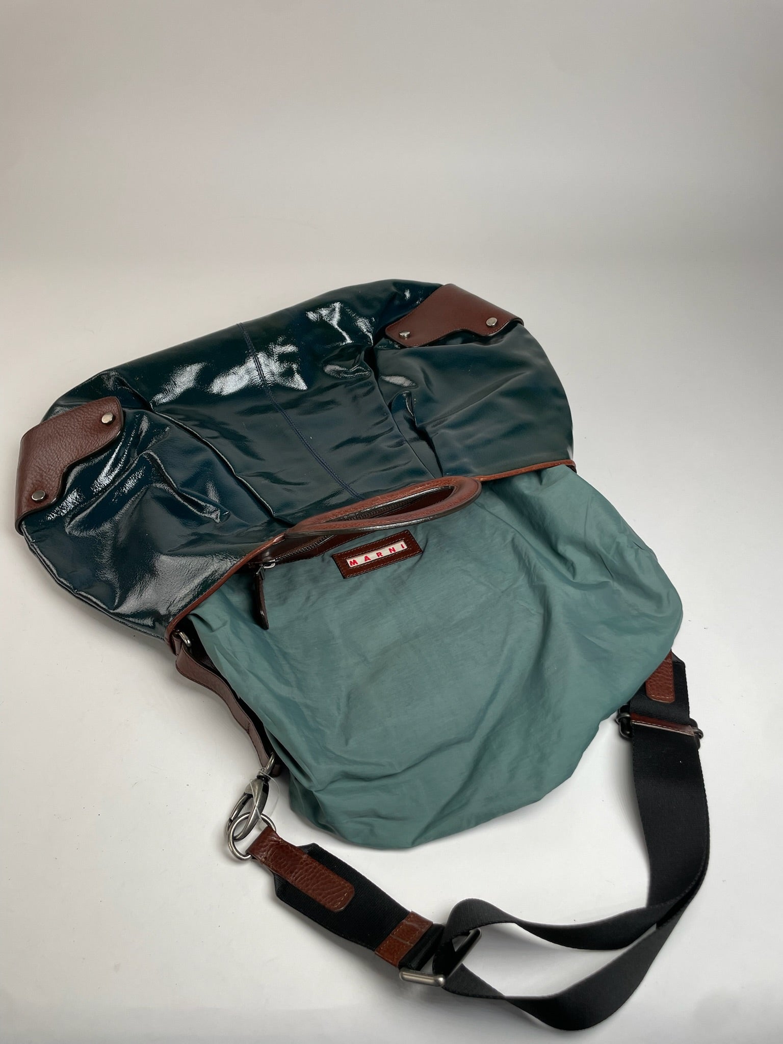 MARNI Vintage 2-Way Handbag. This sophisticated vintage 2-way handbag is crafted of dark green patent leather combined with brown leather details. The bag features two freestanding brown leather top handles, an adjustable and removable shoulder strap made of brown canvas and brown leather, and silver-tone steel hardware. The bag opens to a blue-green canvas interior lining. Made in Italy.