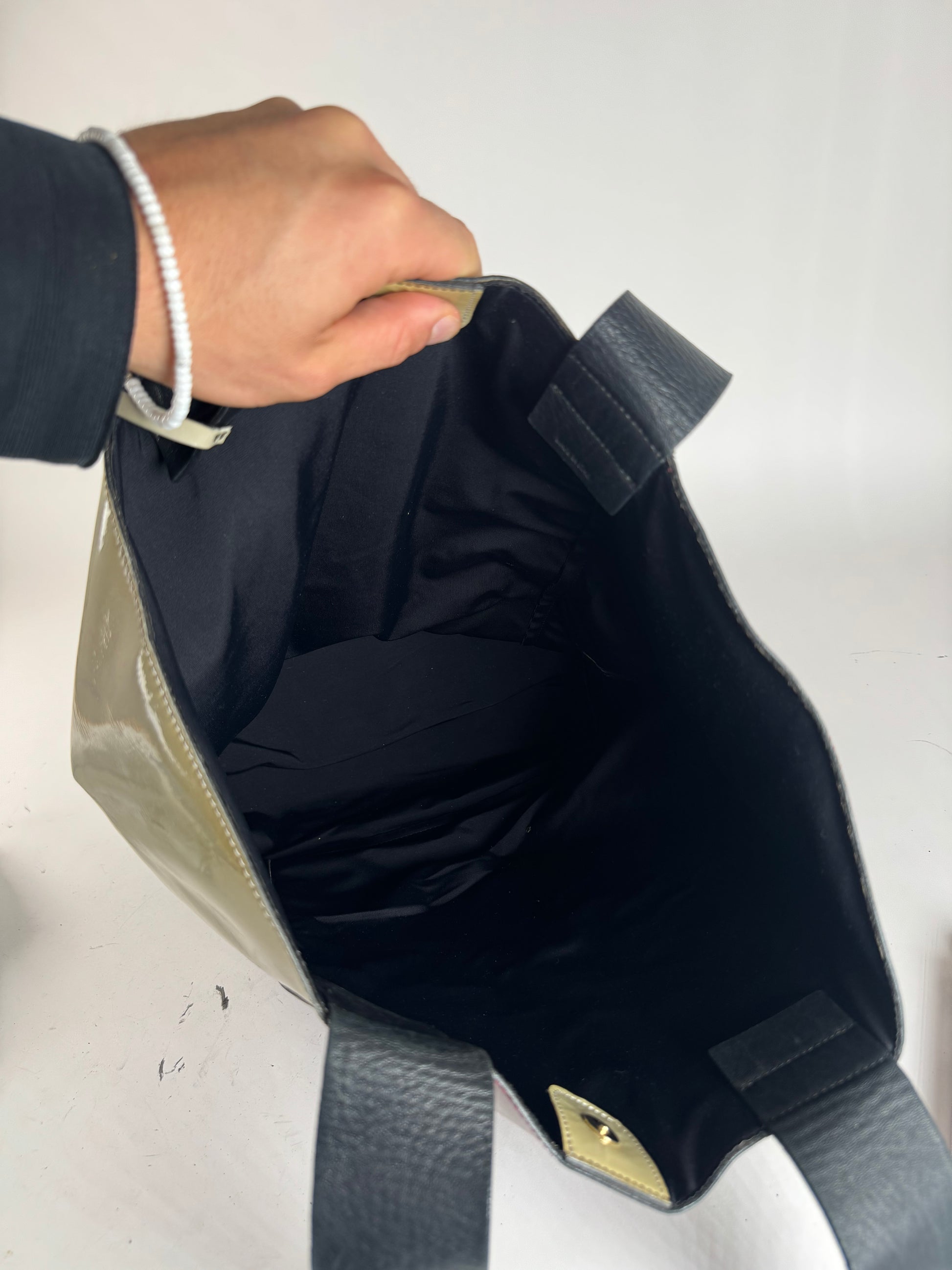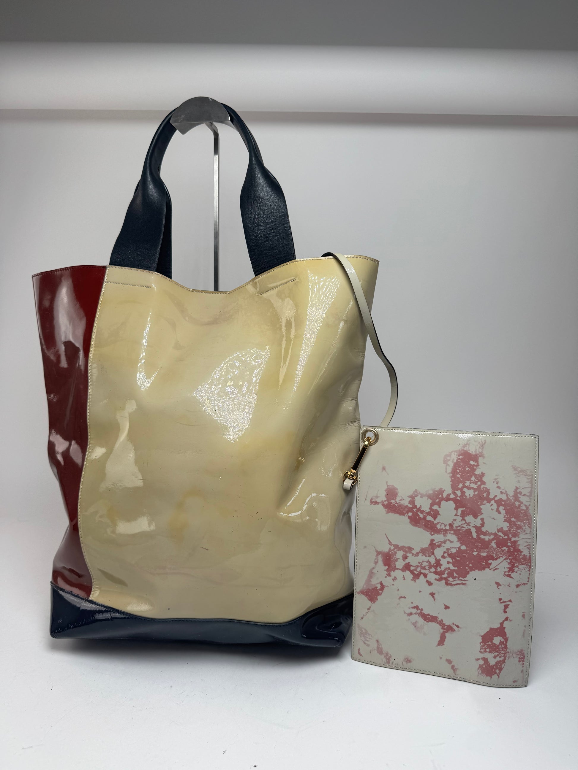 MARNI Vintage Patent Leather Tote Bag. This chic handbag is finely crafted of black, burgundy, and beige patent leather. The tote features black leather handles and includes a detachable clutch in grey patent leather, attached to the handle. The clutch shows several stains on the back side. The bag is styled with gold-tone steel hardware. The top opens to a spacious interior lined with black canvas.