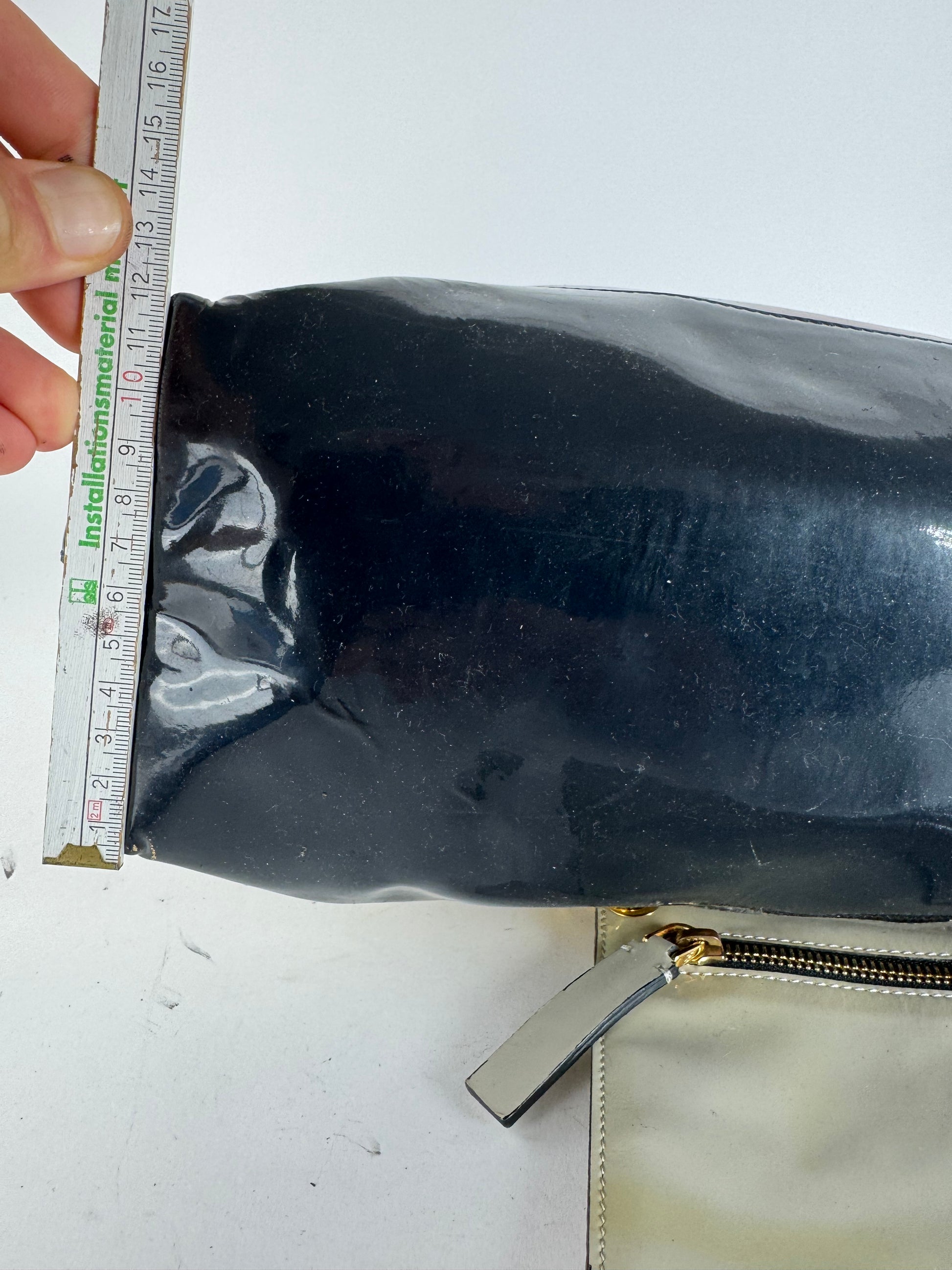 Condition Details: The exterior patent leather remains overall beautiful, but the clutch has visible stains on the back. The handles are firm and clean. The hardware is bright with light scratches. The interior lining is in great shape.