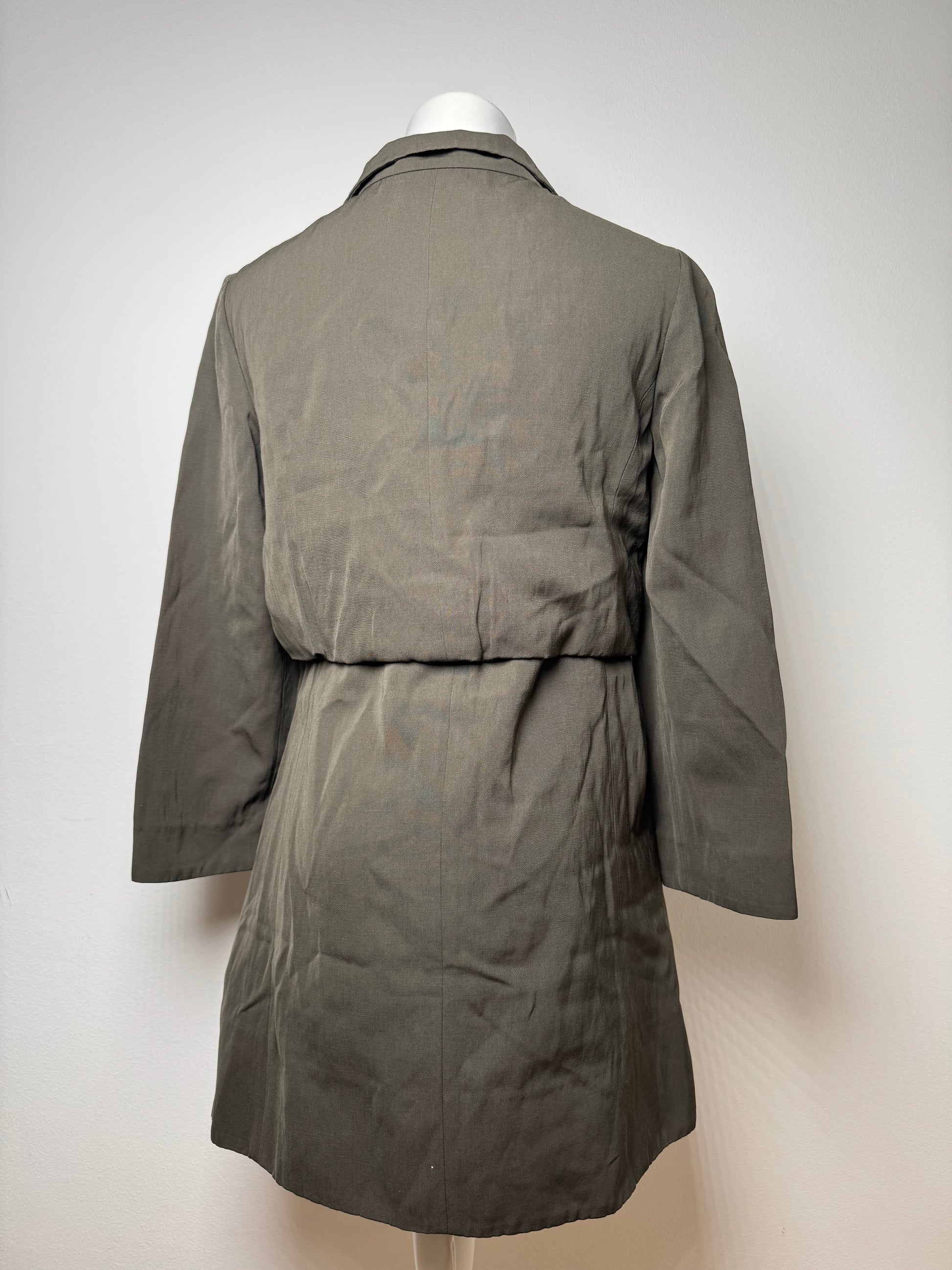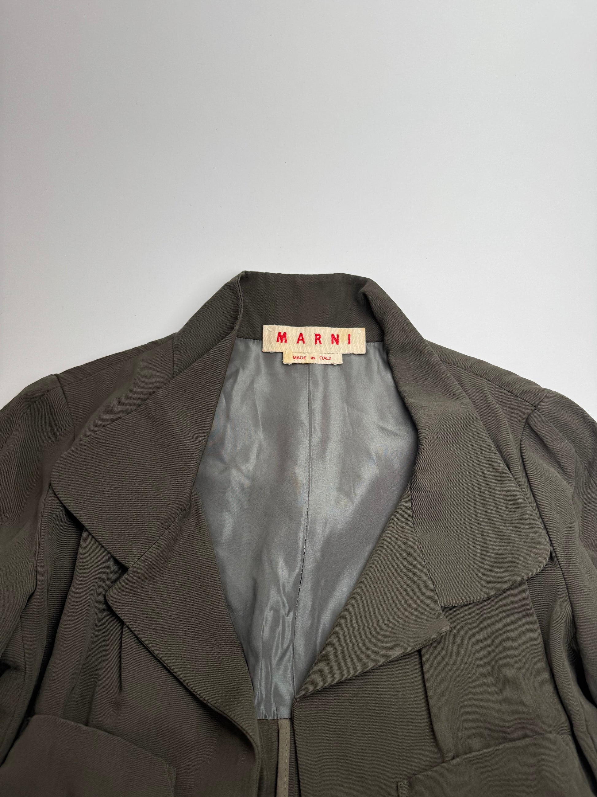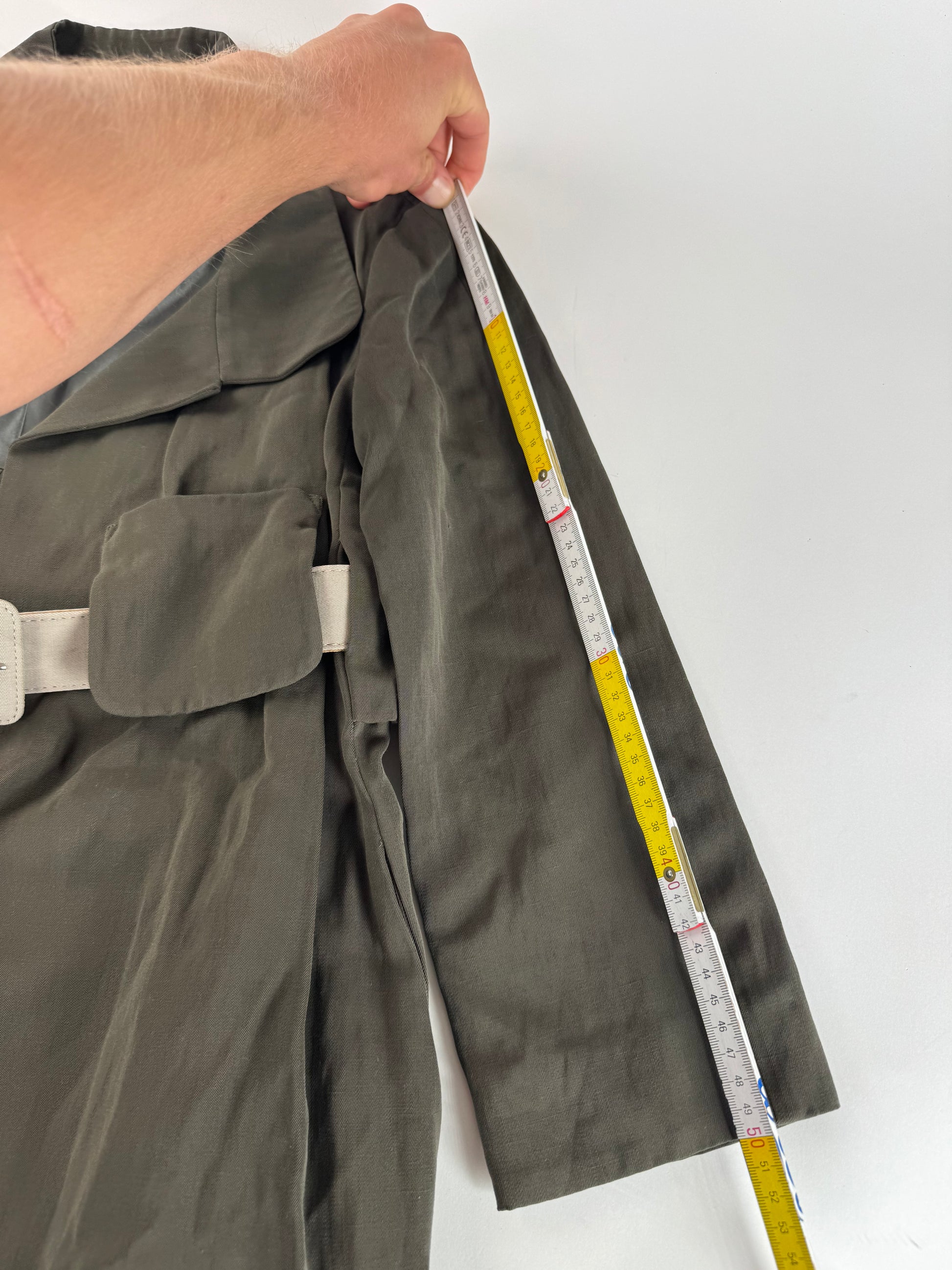 MARNI Vintage Wool-Linen Trench Coat. This chic trench coat is finely crafted of khaki fabric made from 76% lana wool and 24% linen. It features a unique and striking design, and comes with a beige belt. The lining is composed of silk and acetate.