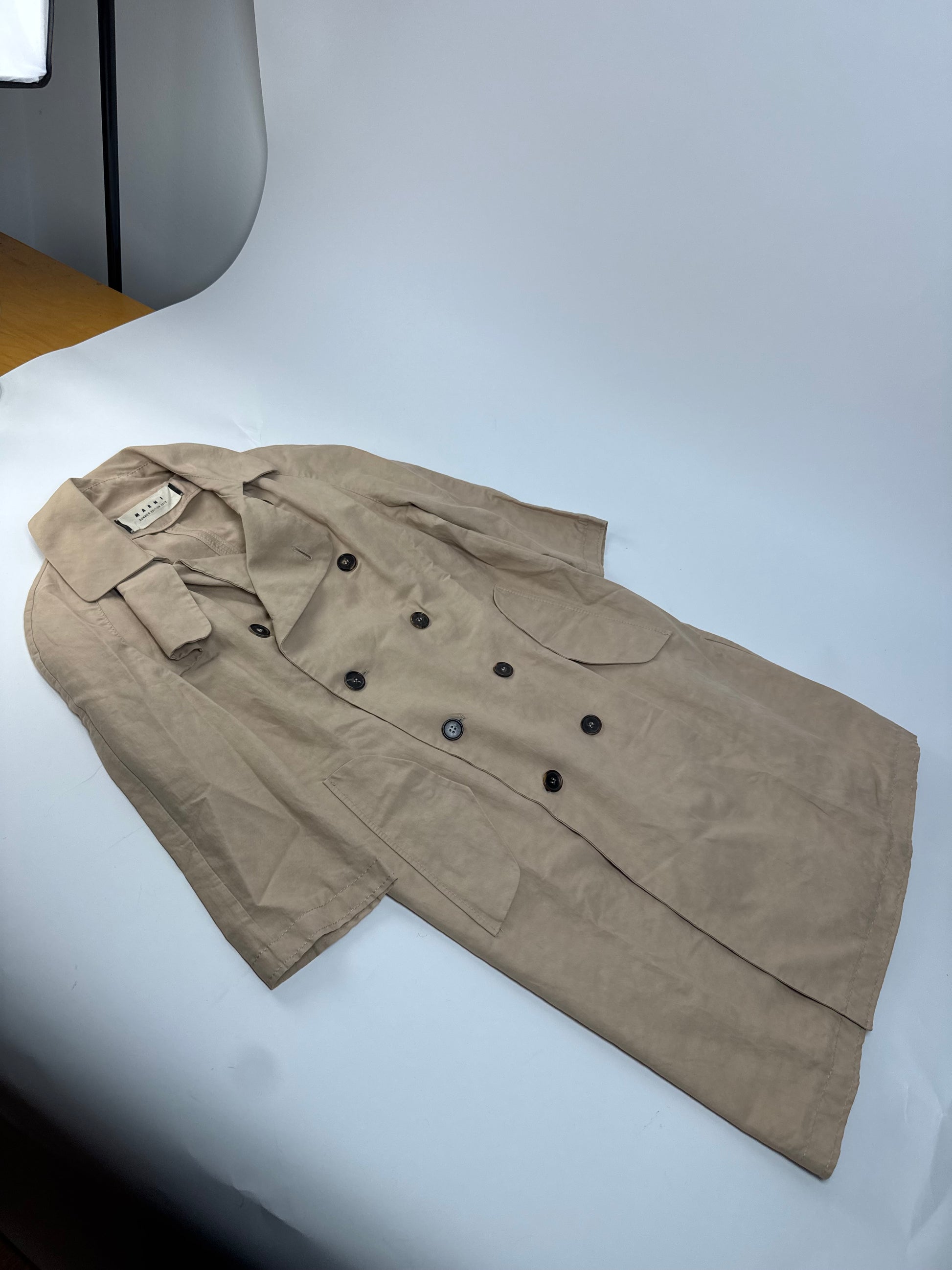 MARNI Summer Edition 2012 Vintage Trenchcoat. This elegant trenchcoat is beautifully tailored in a beige colourway. It features dark brown plastic buttons and a classic silhouette that reflects Marni’s signature understated yet modern aesthetic. The Summer 2012 collection by Marni was known for its architectural cuts, natural tones, and refined fabrics, combining structured tailoring with effortless sophistication.