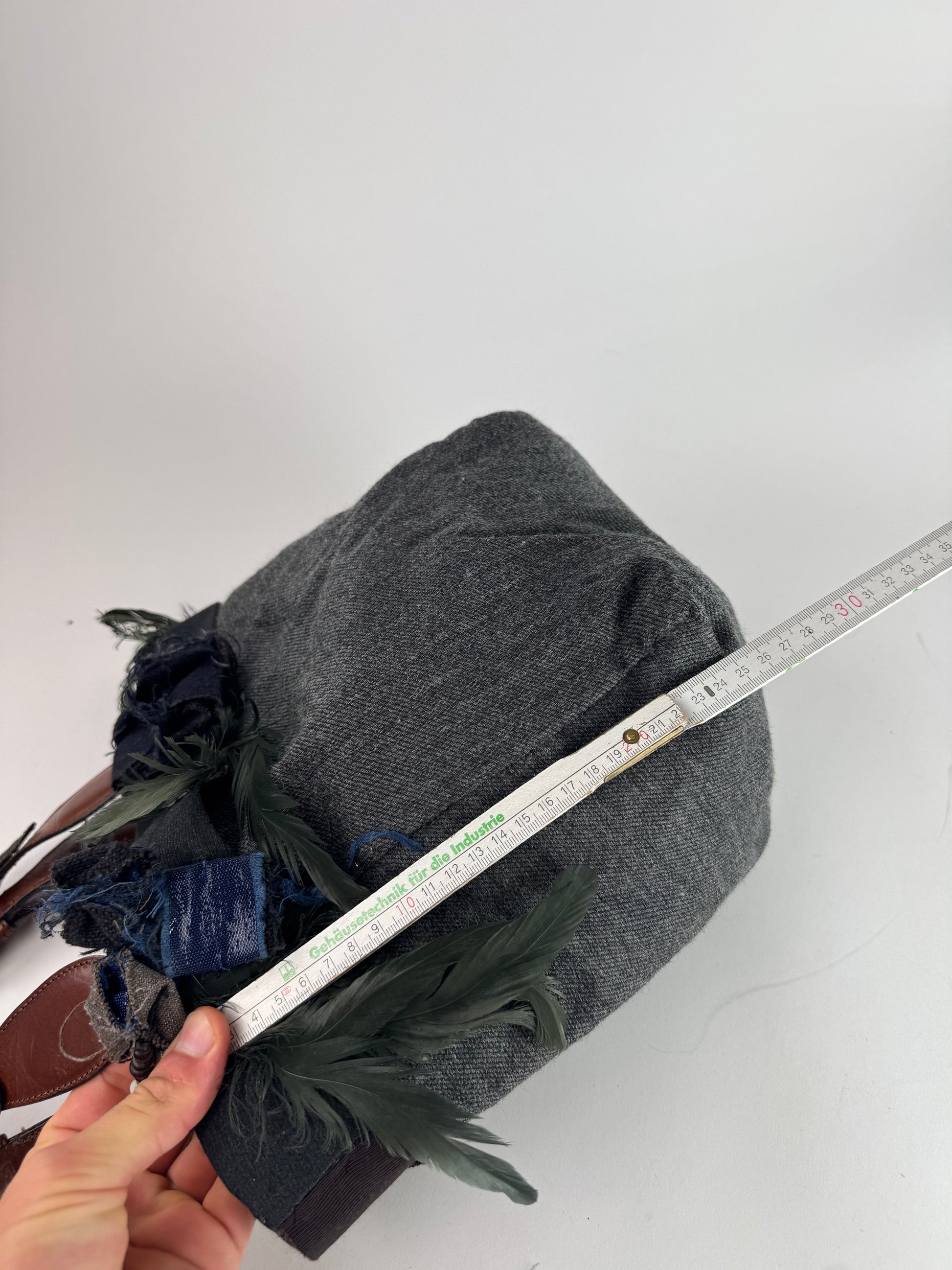 MARNI Vintage Tote Bag. This chic handbag is finely crafted of navy-grey wool material with bronze-tone steel hardware. The bag features red-brown leather handles and decorative feather and denim appliqués around the opening. The interior is lined in beige suede.