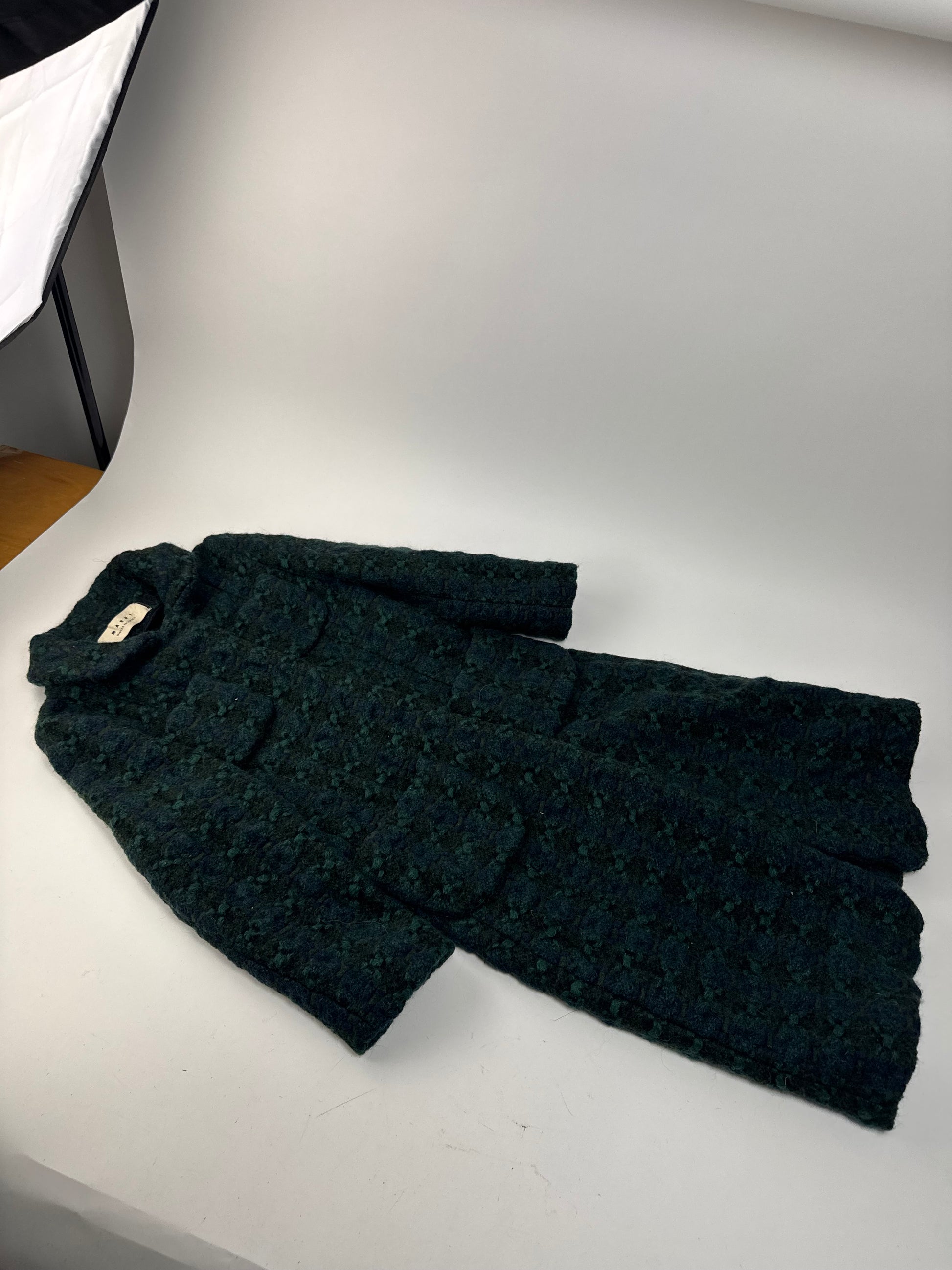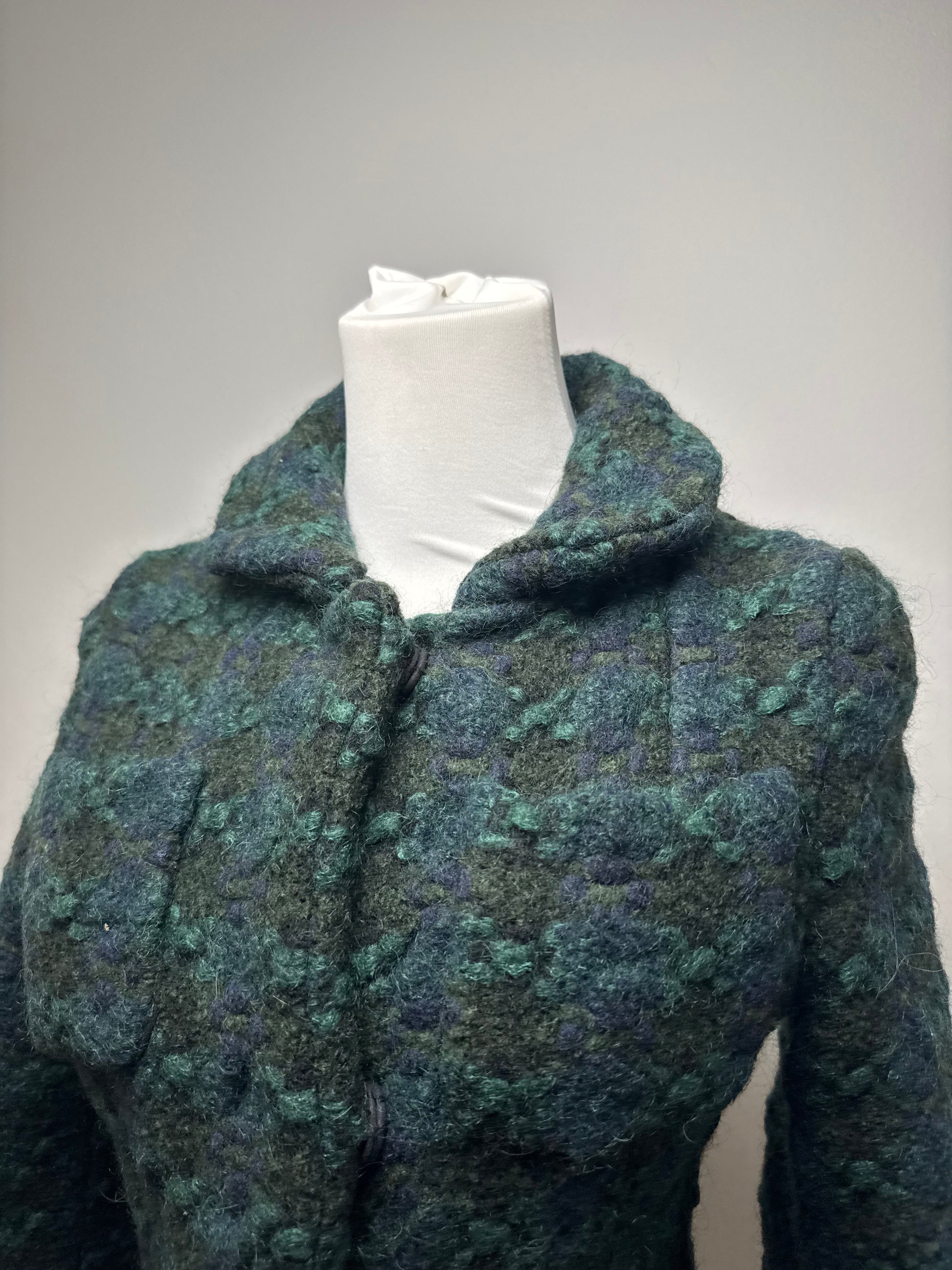 MARNI Vintage Blue-Green Patterned Wool Trench Coat. This stunning vintage trench coat is crafted from a rich blue-green patterned fabric made of 75% Lana wool and 25% polyester. It features multiple black plastic buttons and showcases Marni’s distinctive approach to bold yet refined design. Made in Italy, this piece offers both structure and elegance with a truly unique textile.