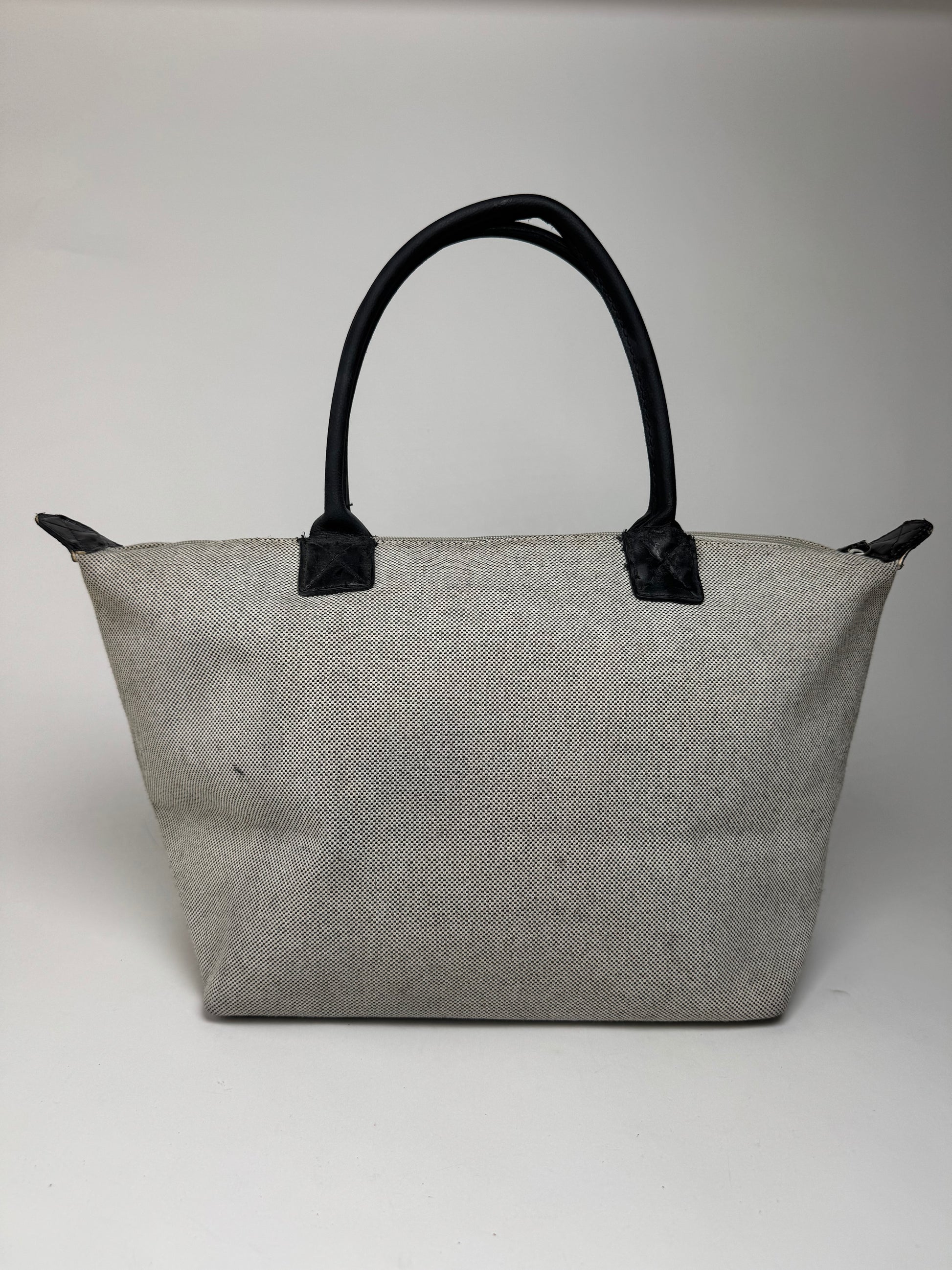 This vintage shopper bag is finely crafted from grey canvas with black leather trim. The design features a secure top zipper closure and silver-tone steel hardware, making it both stylish and functional.