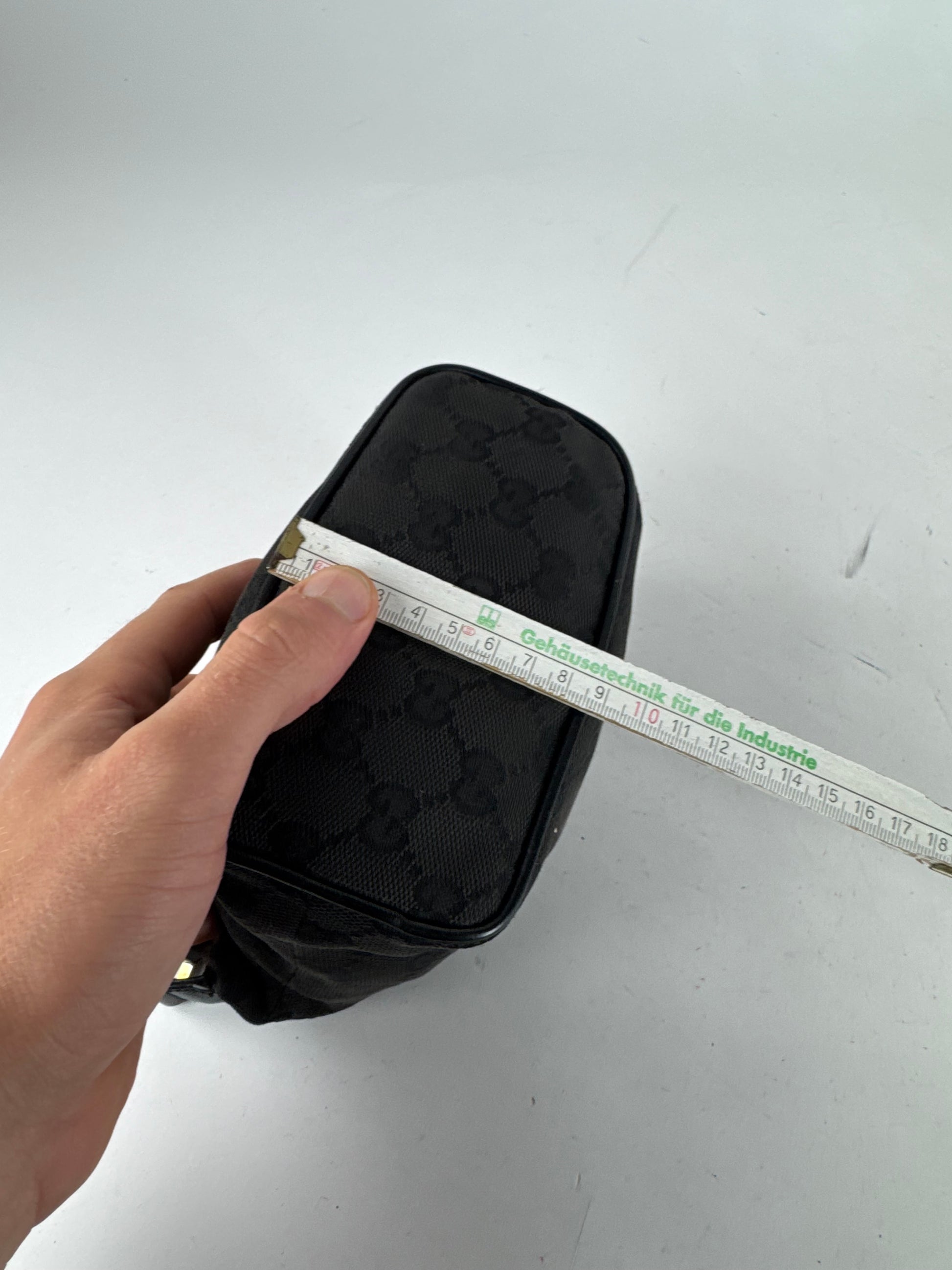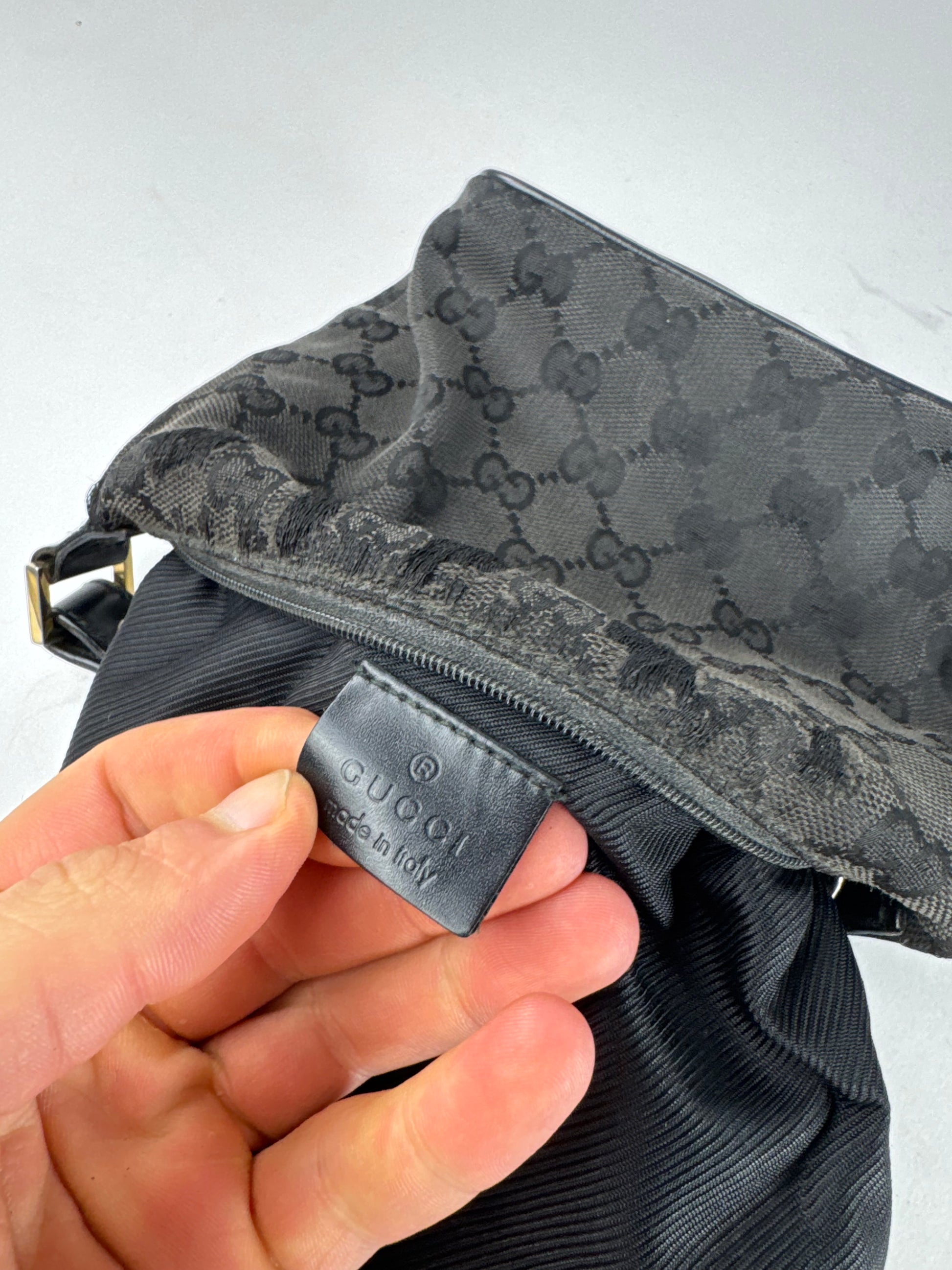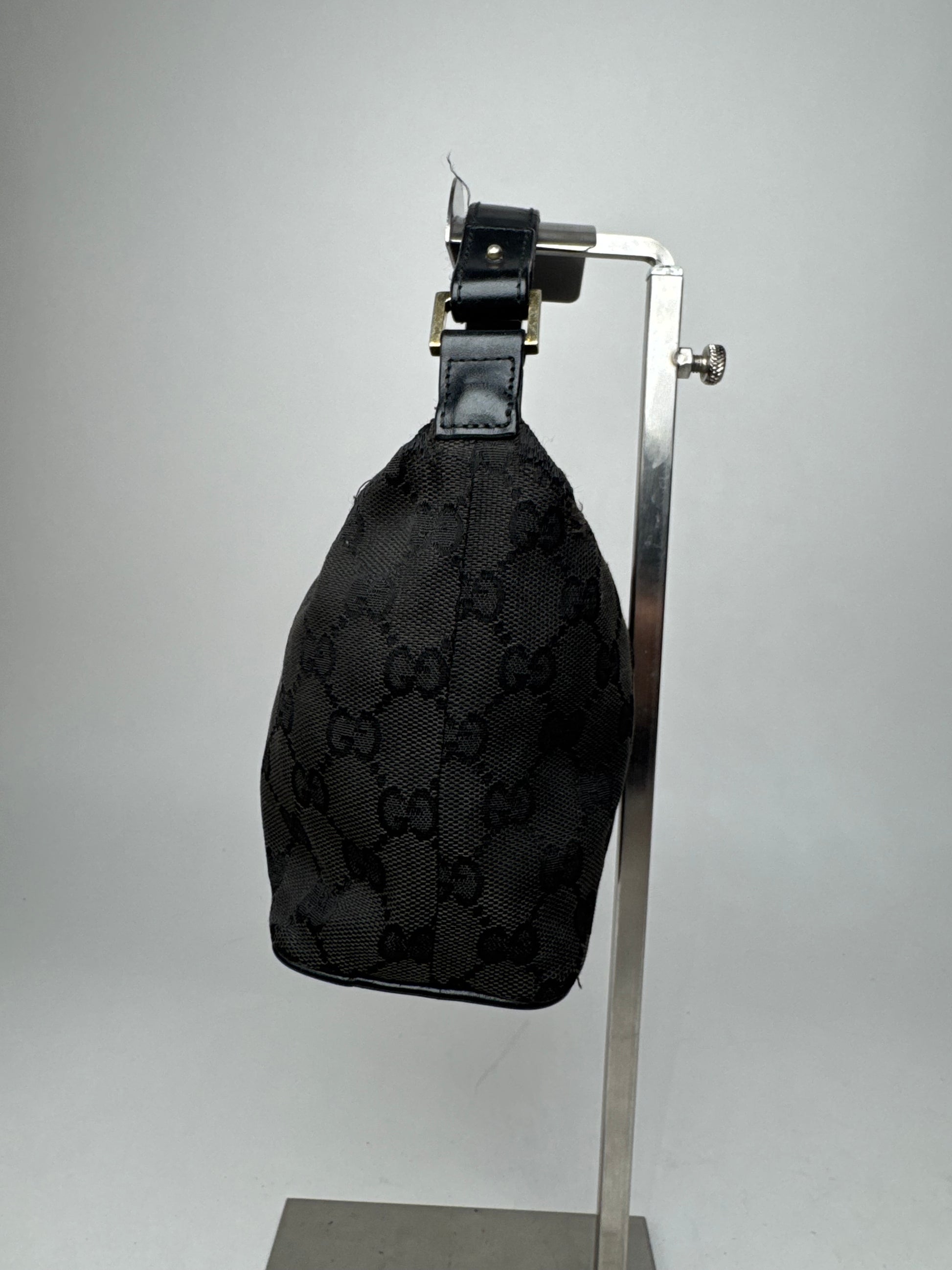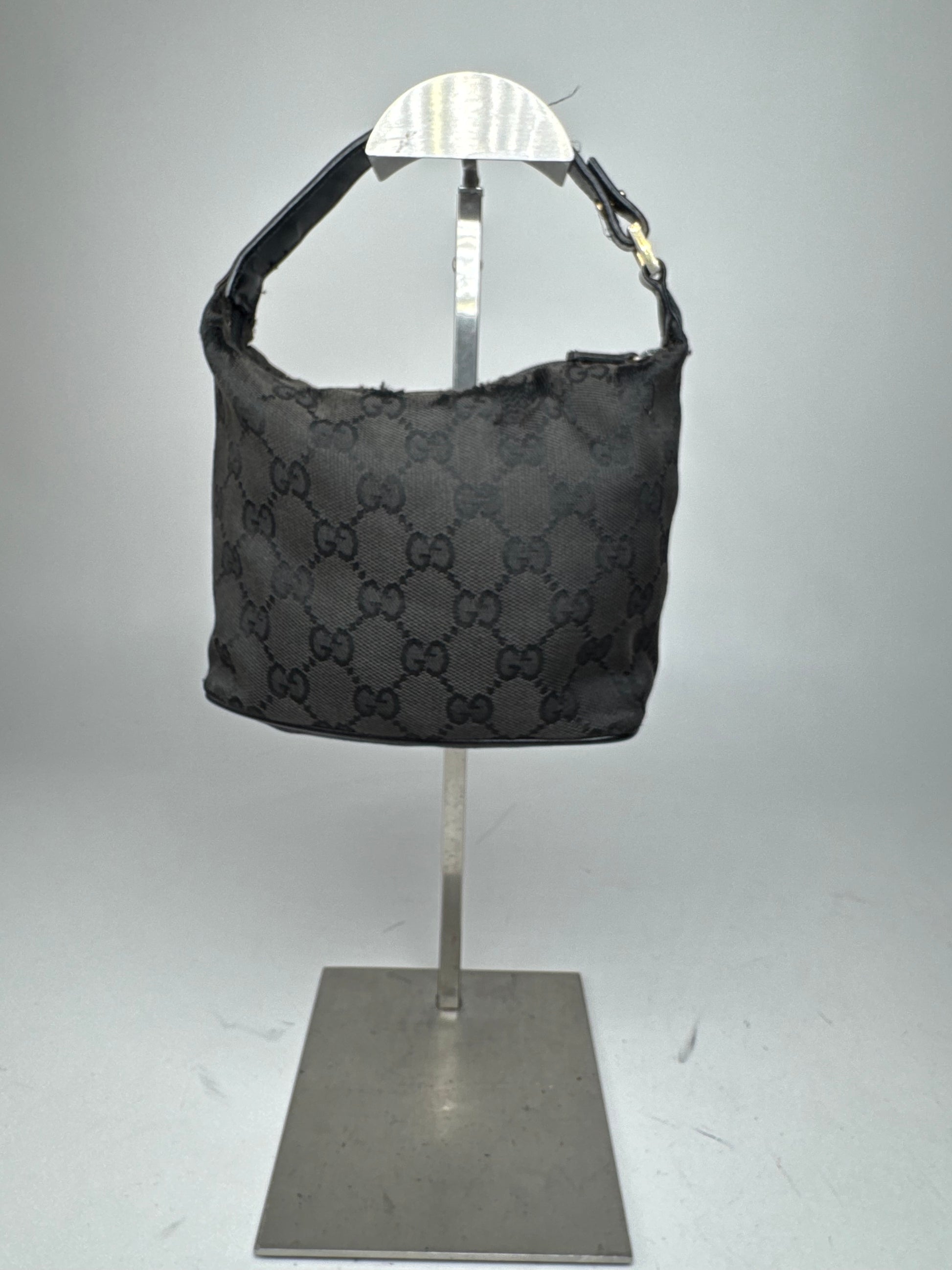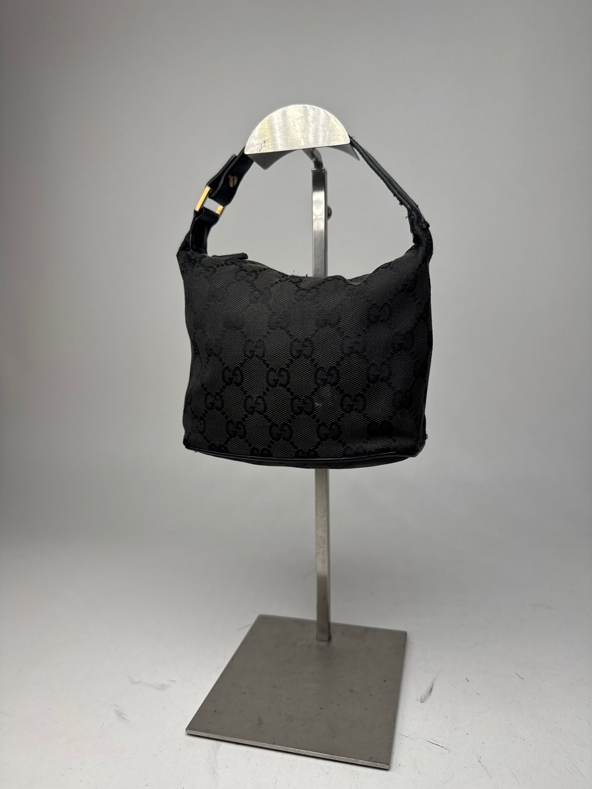 This elegant vintage handbag is crafted from black canvas featuring the classic Gucci monogram, complemented by a black leather handle and silver-tone steel hardware. The interior is lined with black polyester, reflecting Gucci’s signature blend of Italian craftsmanship and timeless design. Made in Italy, authenticity code reads: 039 1147 4025.