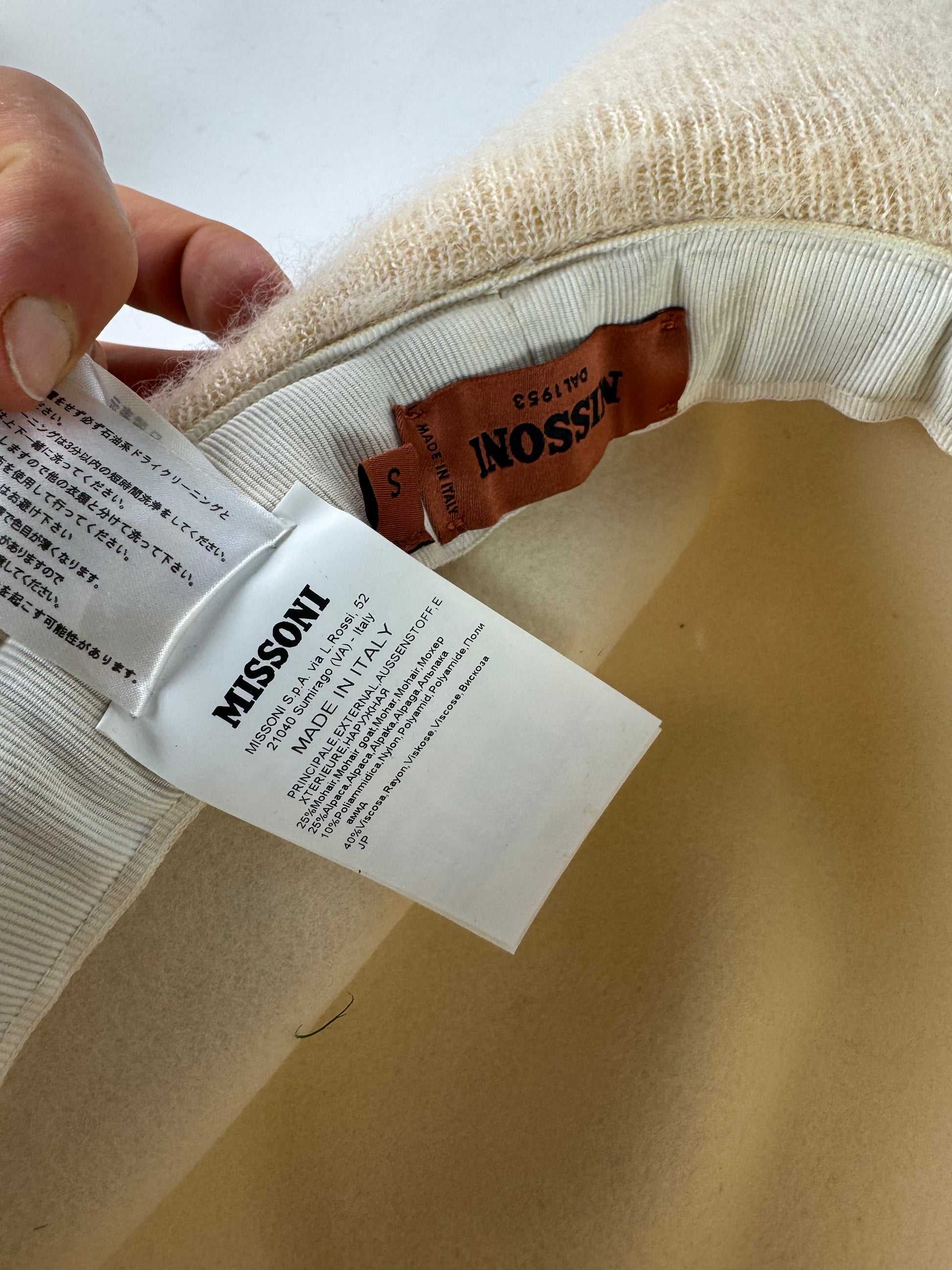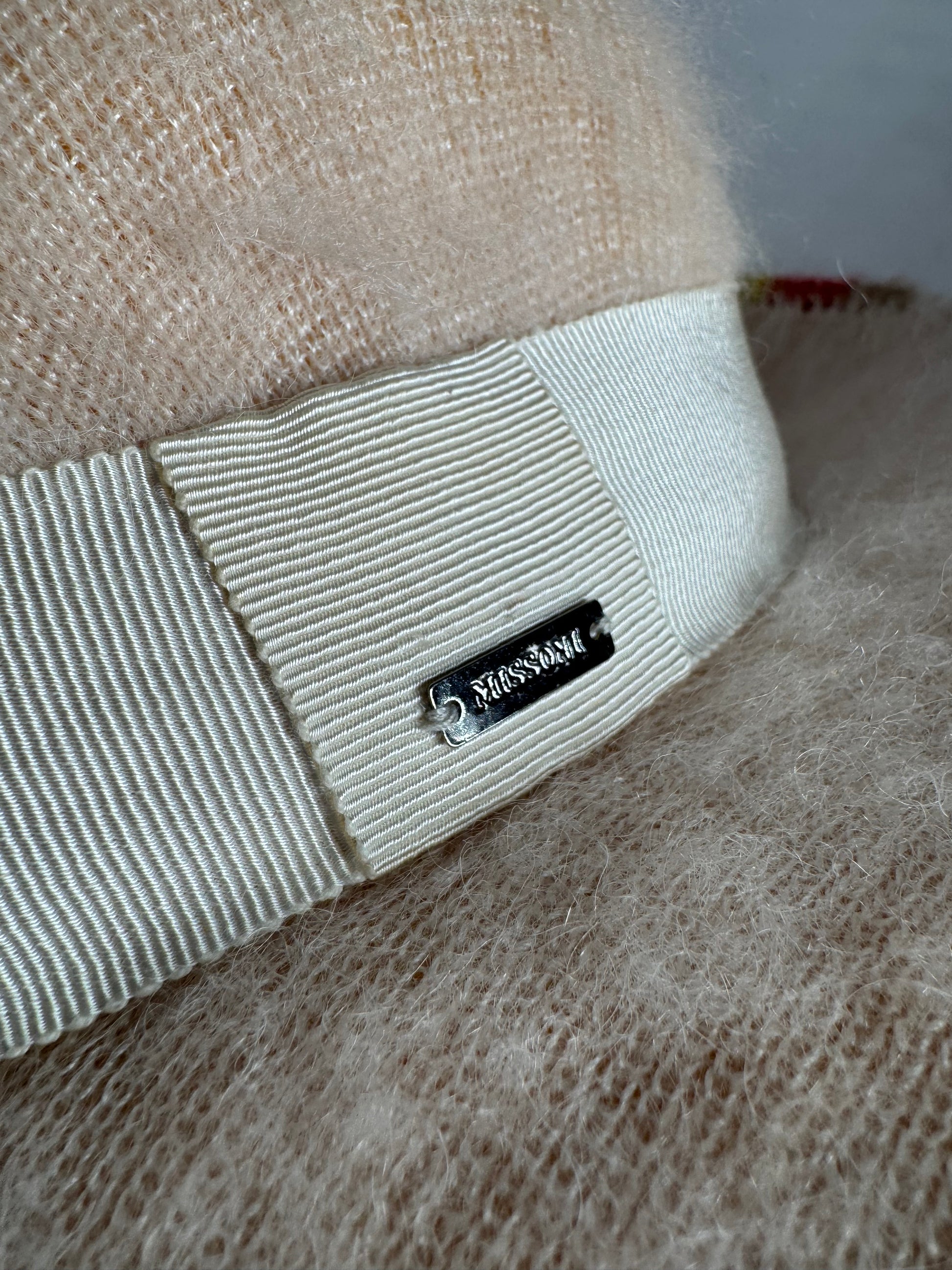 MISSONI Vintage Sombrero / Panama Hat. This distinctive vintage hat is crafted from beige wool and finished with a colorful woven wool trim along the brim, showcasing Missoni’s signature use of vibrant patterns and textures. It is accented with silver-tone steel hardware. Made in Italy and suitable for unisex wear.