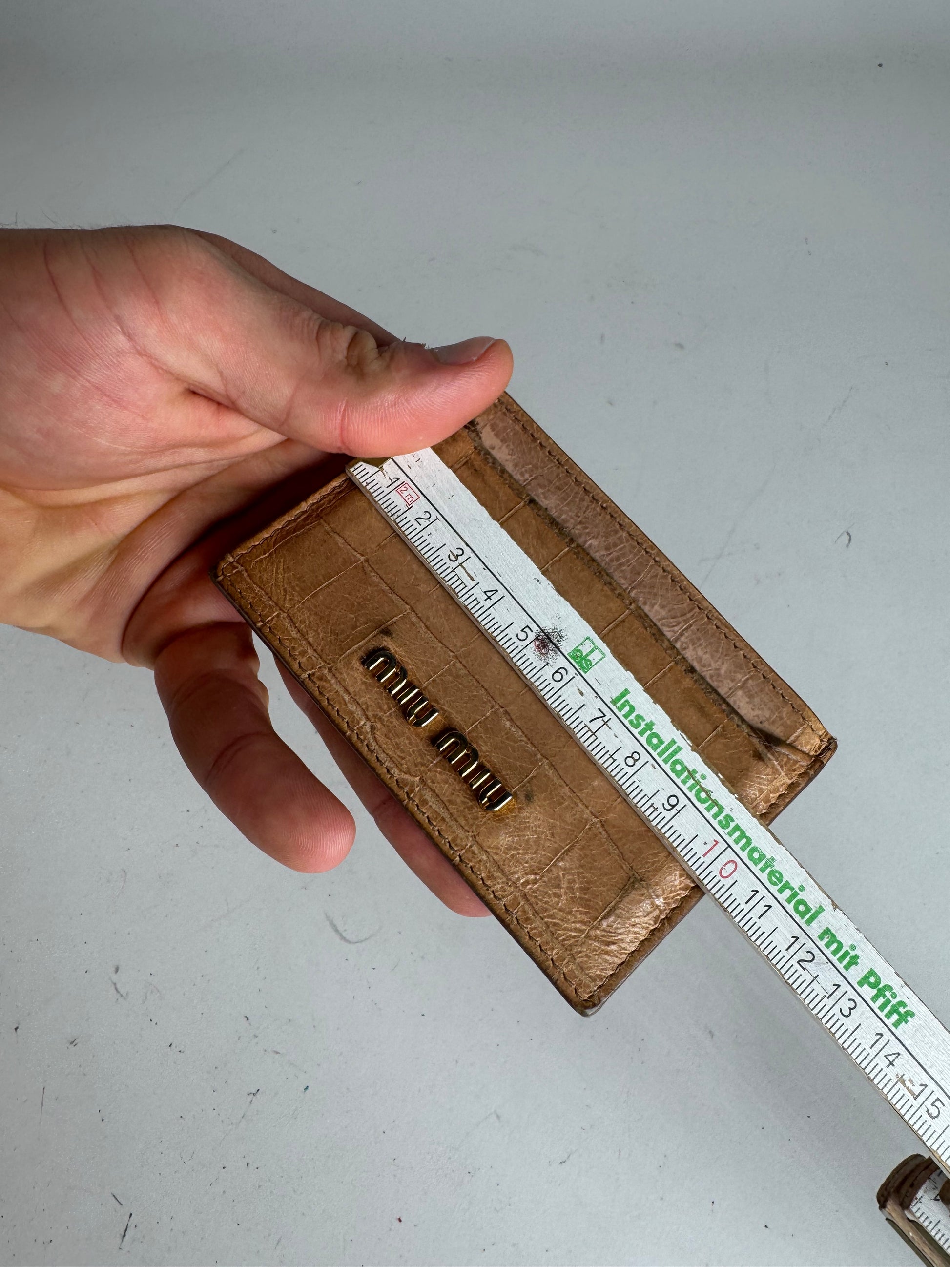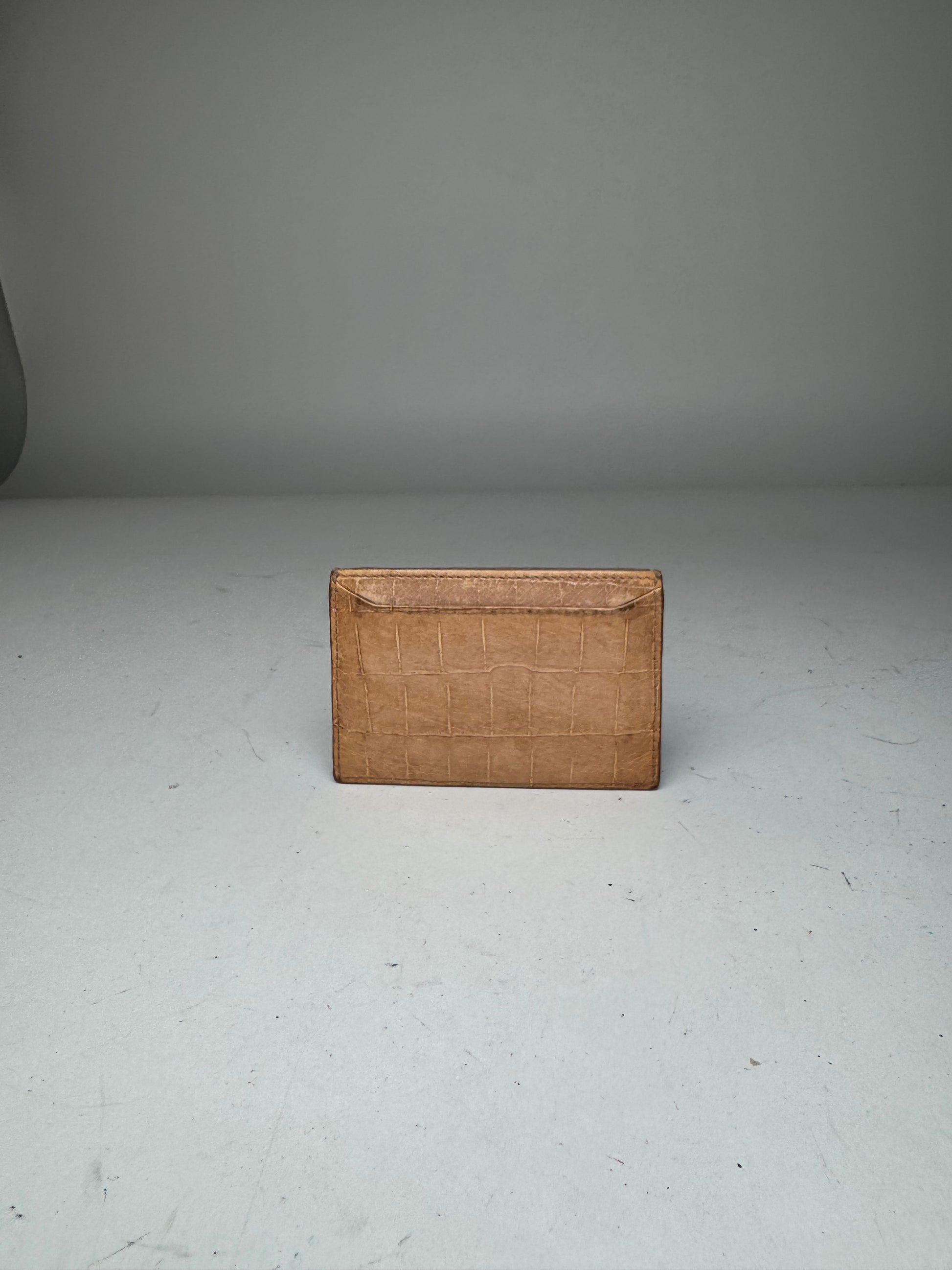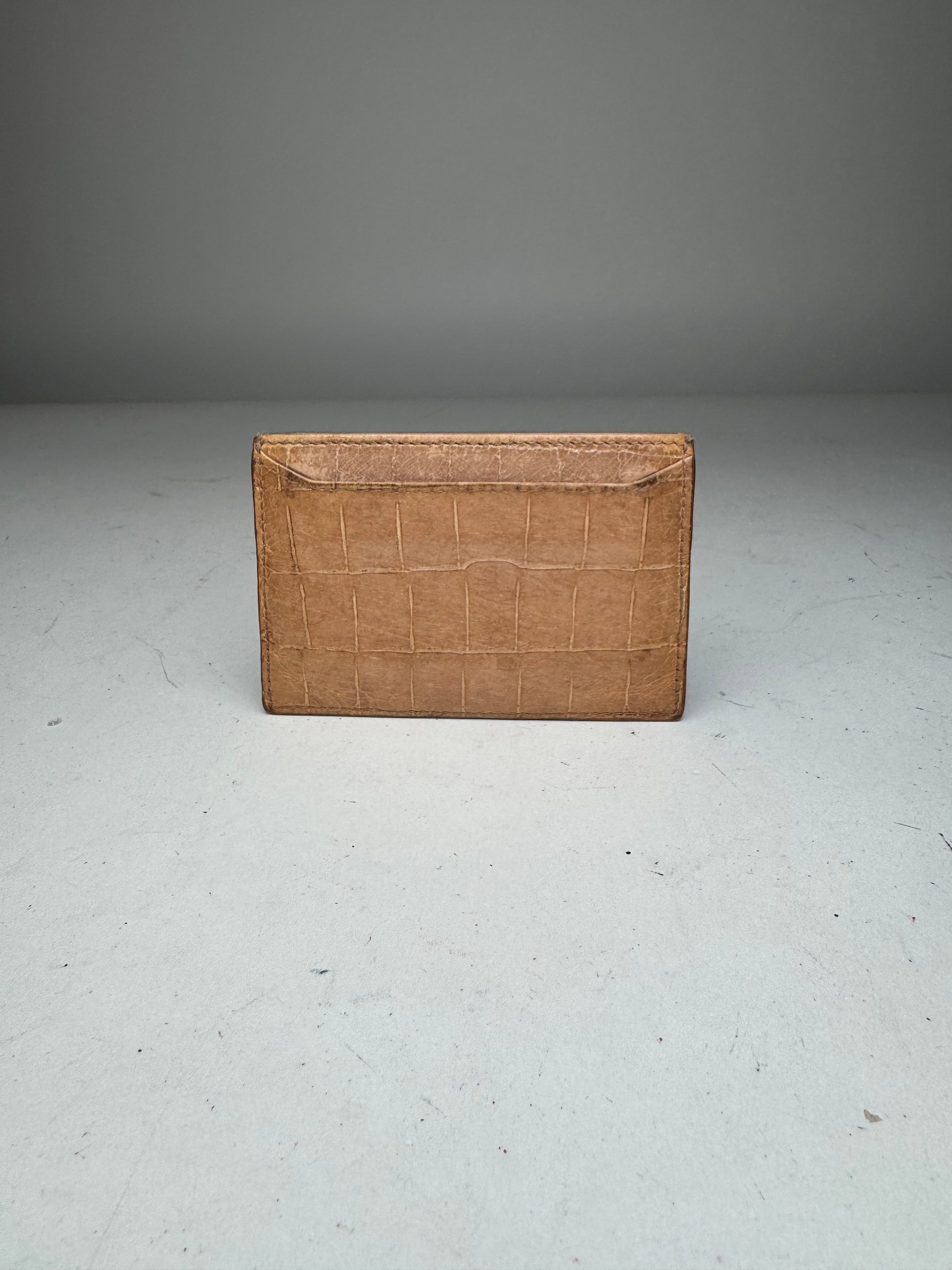 This vintage Miu Miu cardholder is crafted in brown crocodile-effect leather and features a gold-tone steel Miu Miu logo on the front. The interior combines lilac leather and brown canvas for an elegant contrast. A refined and compact accessory perfect for daily essentials. Made in Italy.