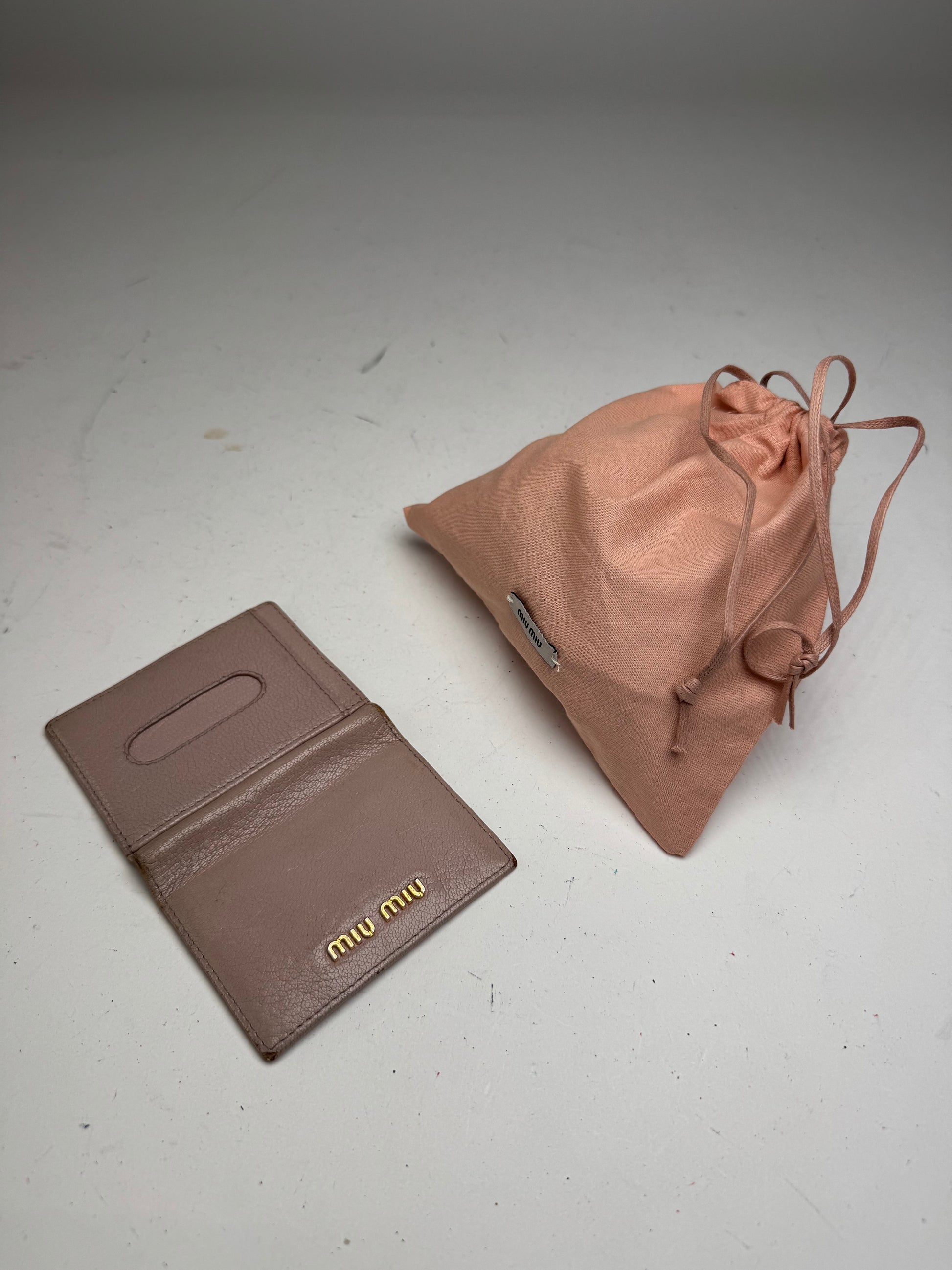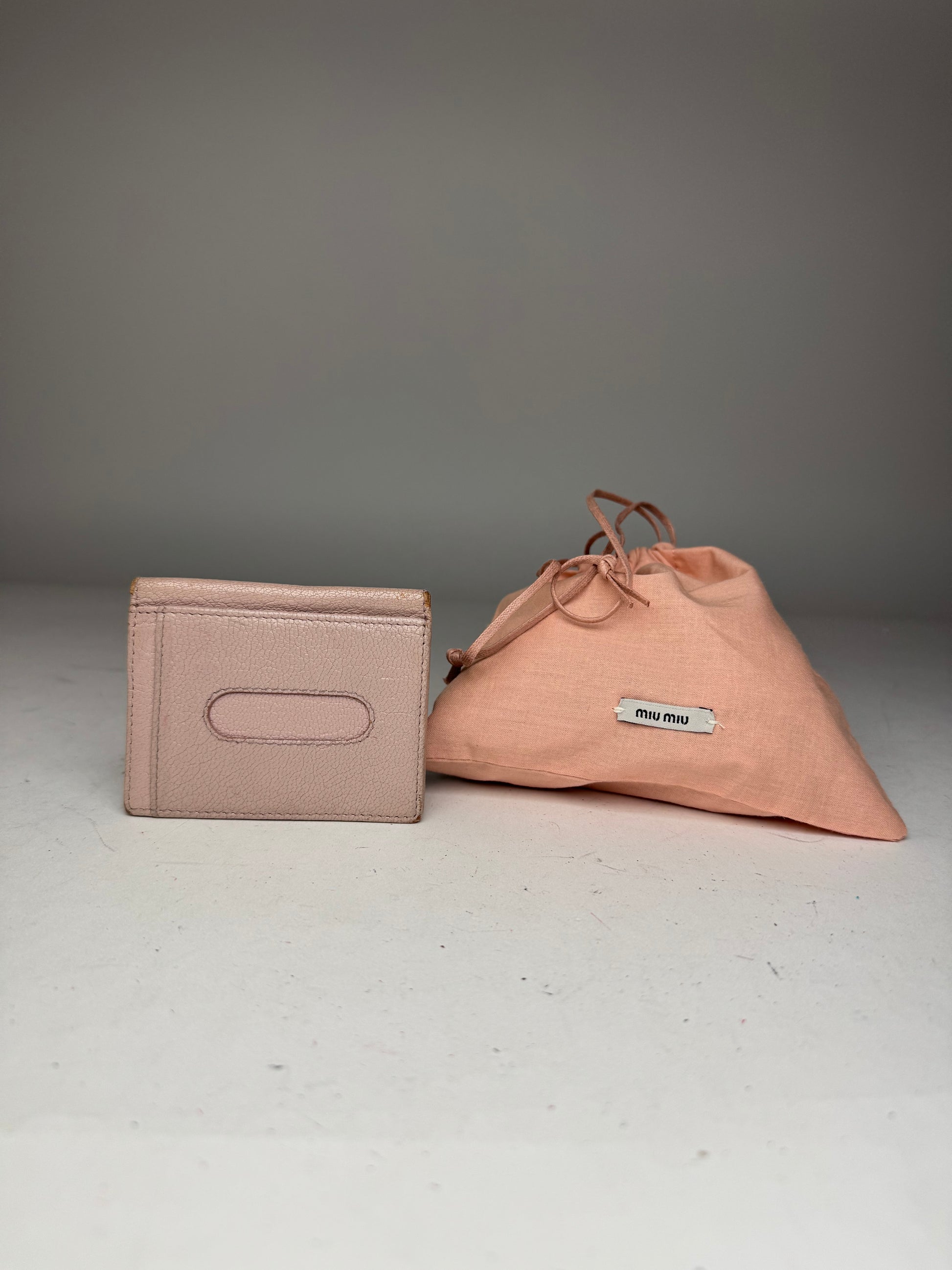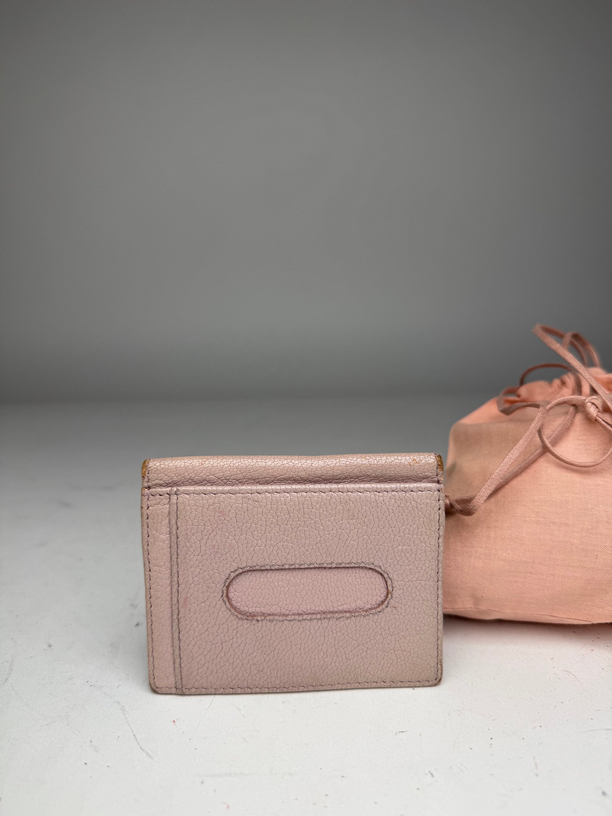 This charming card holder is finely crafted of pink leather and features the signature MIU MIU logo in gold-tone steel on the front. It has a snap button closure and an additional open pocket on the back, while the interior includes organized compartments for cards. Likely made in Italy, this piece reflects Miu Miu’s playful yet sophisticated design aesthetic. The sale includes the original Miu Miu dust bag.
