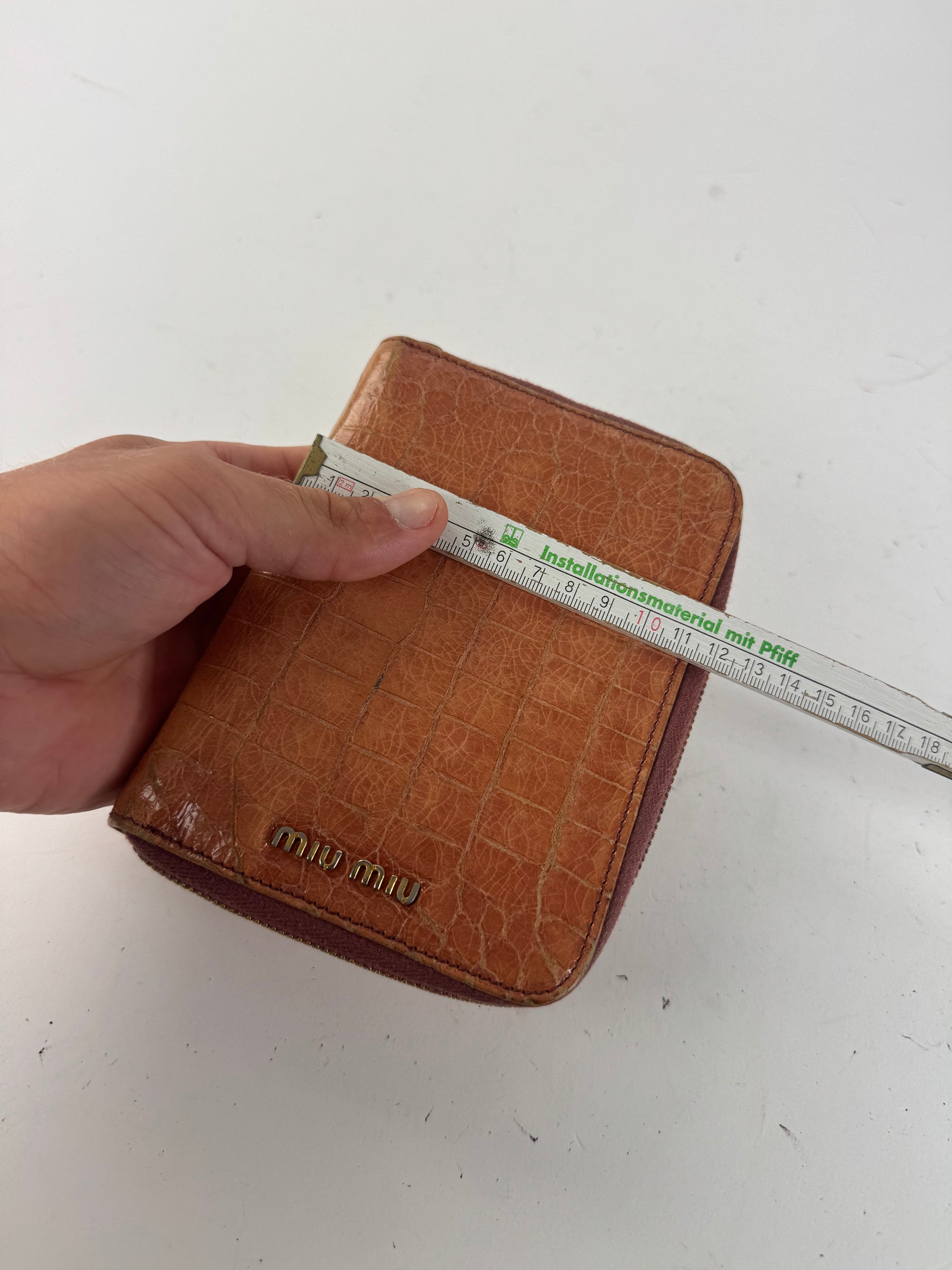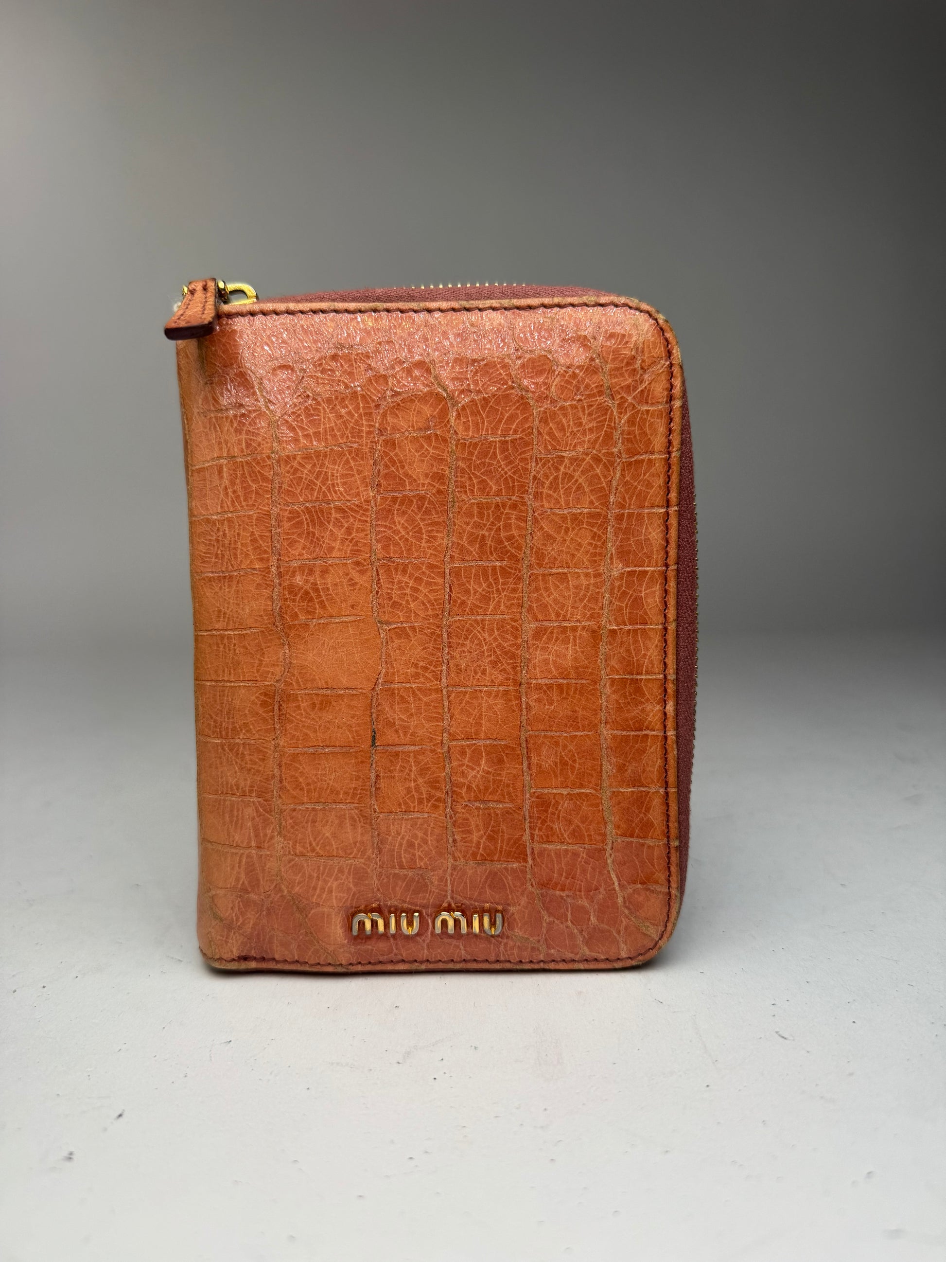 This elegant organizer is finely crafted of orange crocodile-embossed leather. The piece features gold-tone steel hardware and a top zipper closure. The interior is lined in coral red leather and includes a Miu Miu notebook and ruler insert, making it a functional and stylish piece — also a great gift idea.