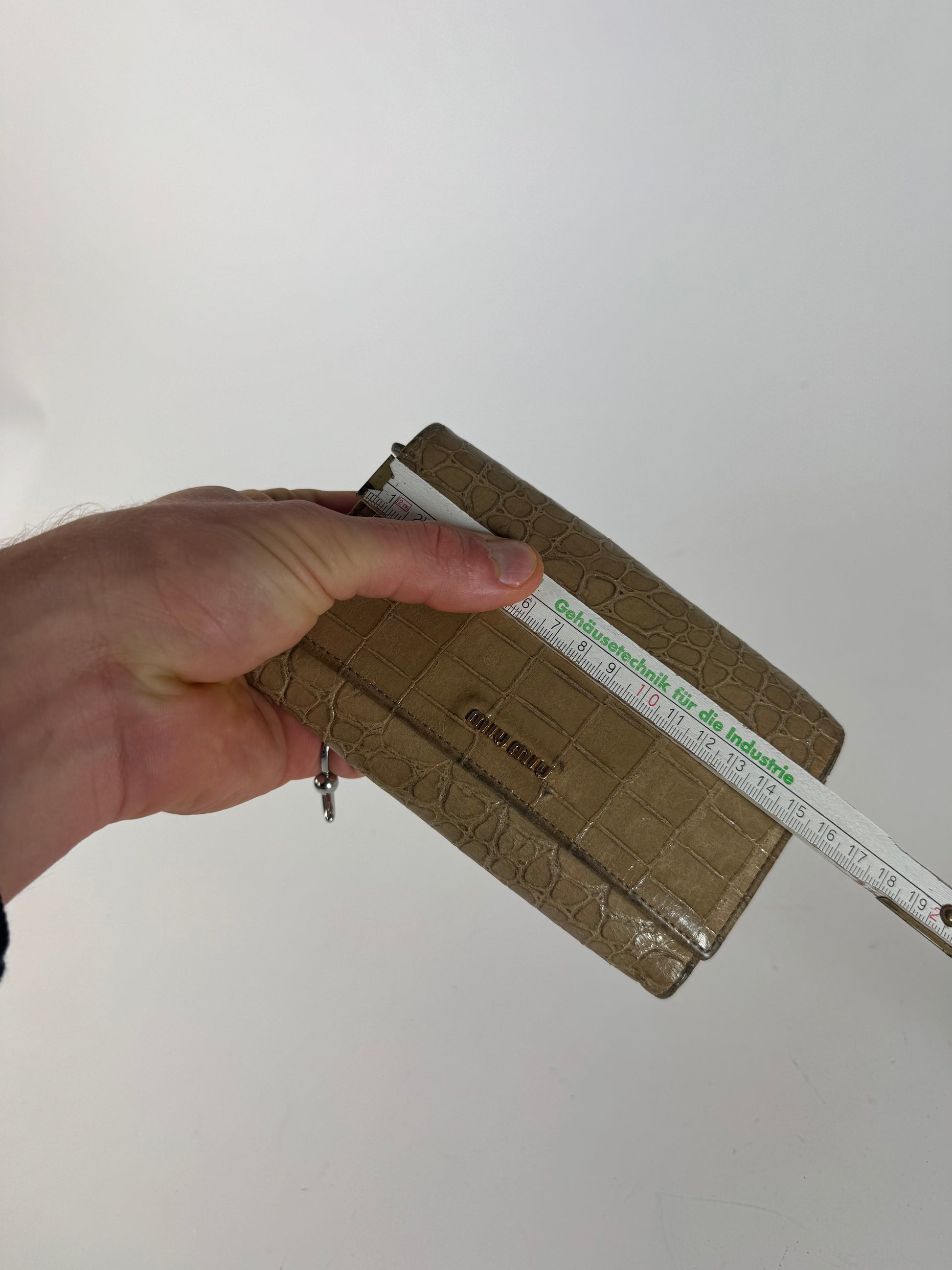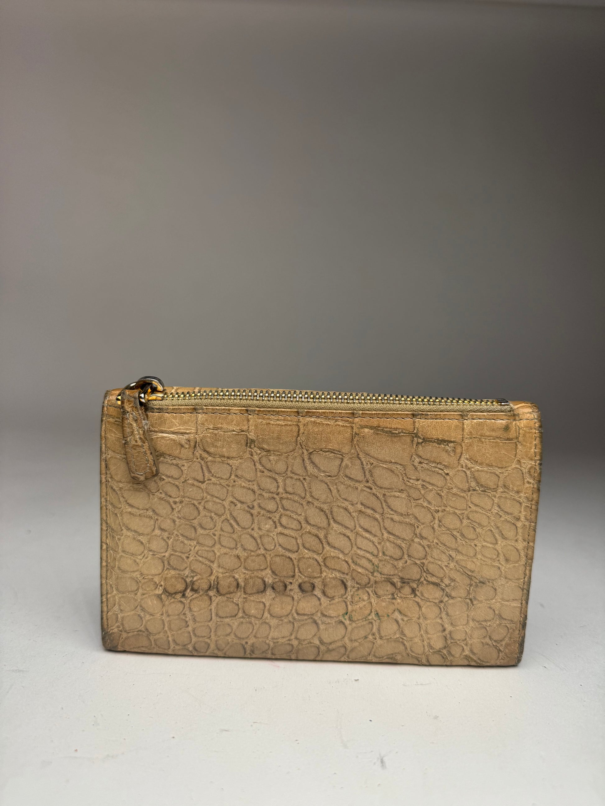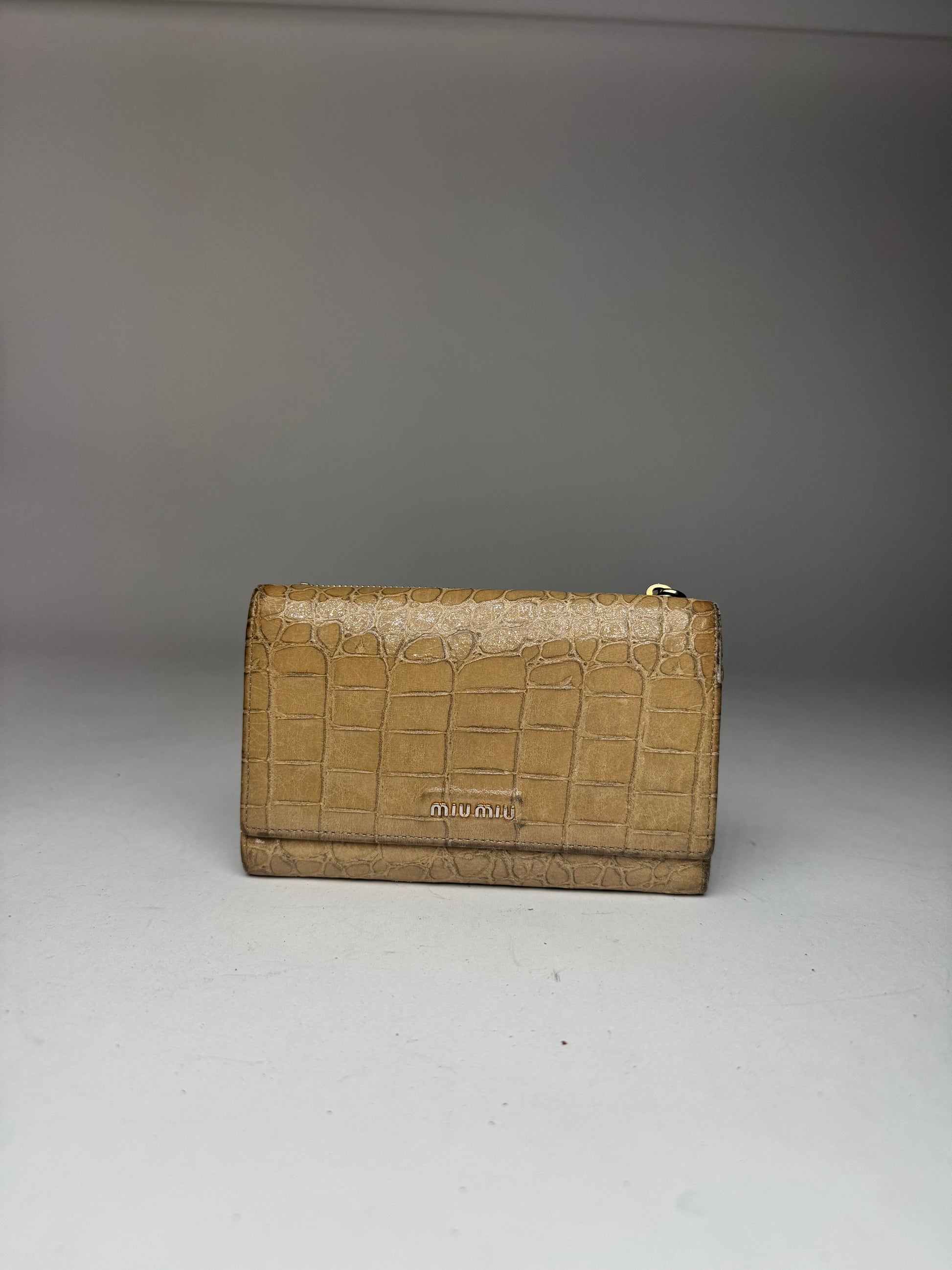 MIU MIU Vintage Wallet. This vintage Miu Miu wallet is crafted from beige patent leather with a crocodile-embossed finish, offering a bold and luxurious look. The interior is lined with grey leather, and the gold-tone steel hardware adds an elegant touch. Despite some spots and scratches, the wallet remains in very good condition.