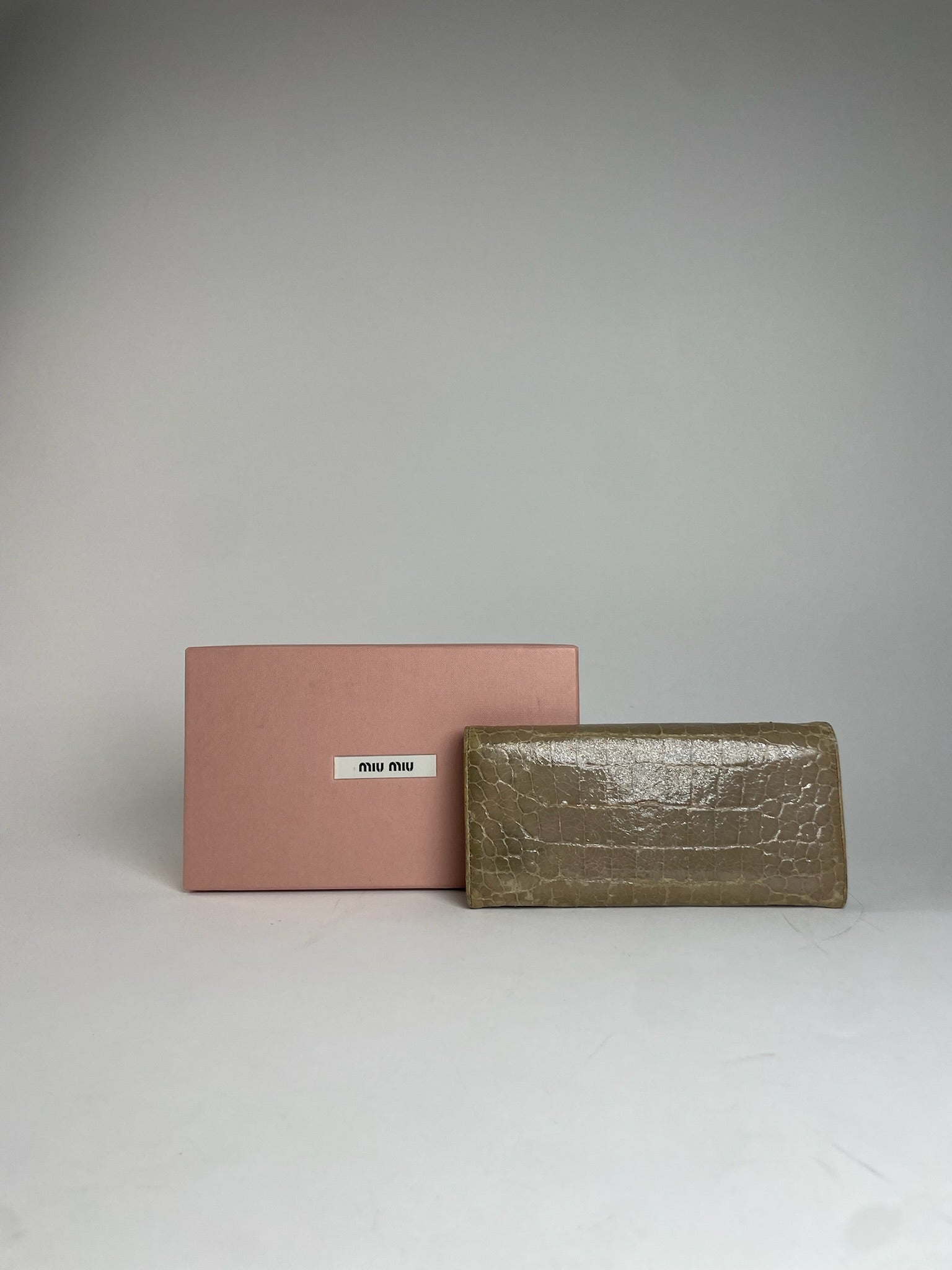 MIU MIU Vintage Croc-Embossed Leather Wallet. This chic wallet is finely crafted of grey croc-embossed leather. The wallet features a gold-tone steel Miu Miu logo on the front, secure snap button closures, and opens to a smooth silver leather interior with multiple compartments for cards and cash.
