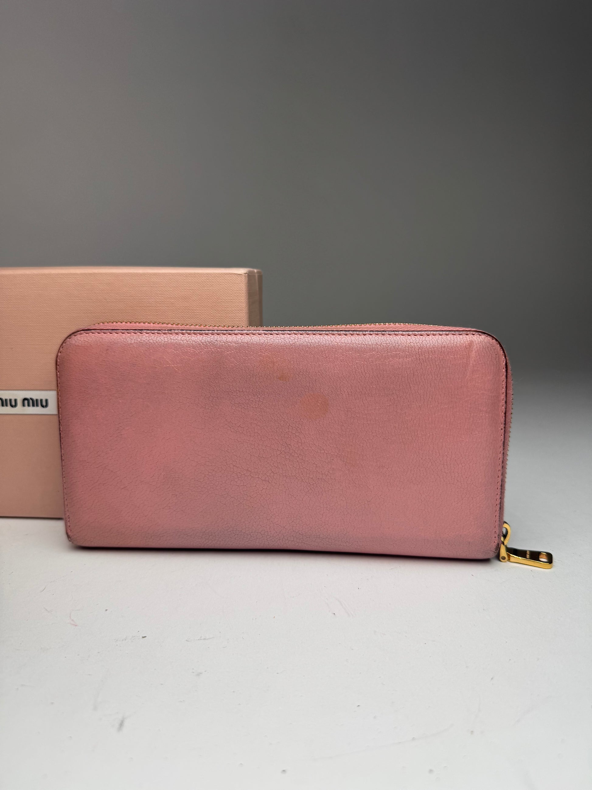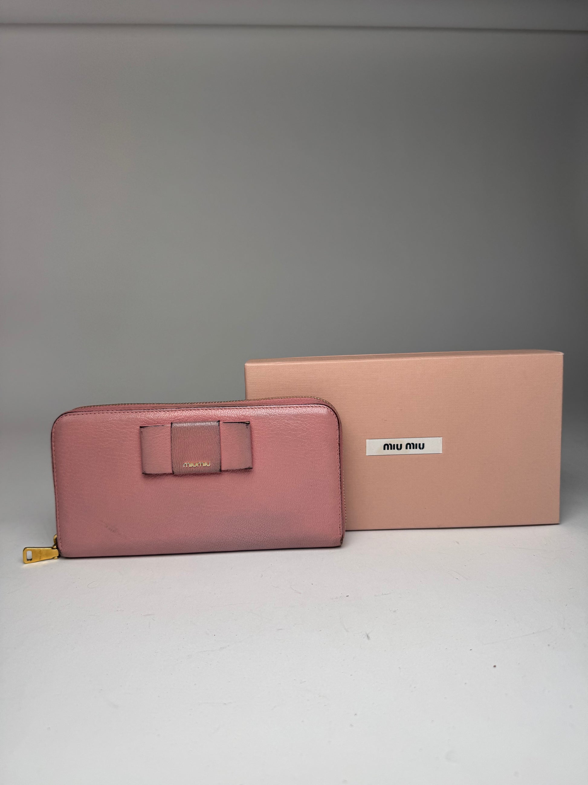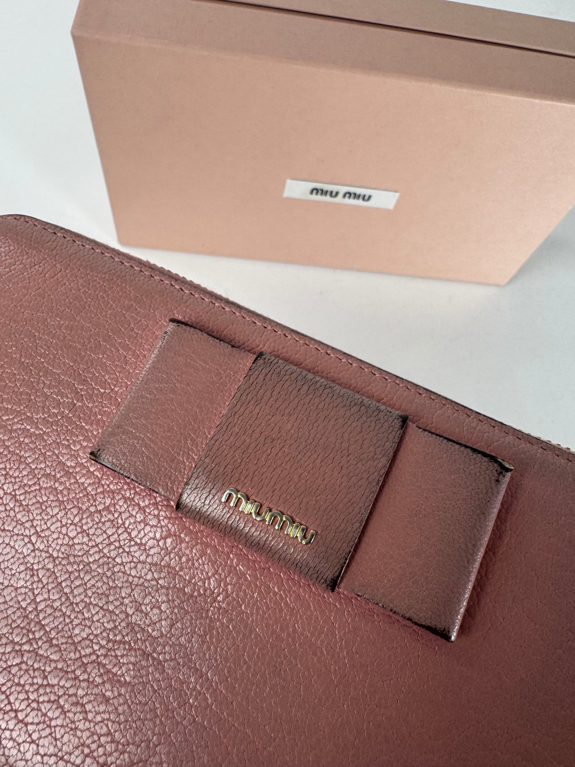 MIU MIU Vintage Wallet. This elegant wallet is finely crafted of red leather with a bow detail on the front. The accessory features a top zipper closure, gold-toned hardware, and a pink leather interior.
