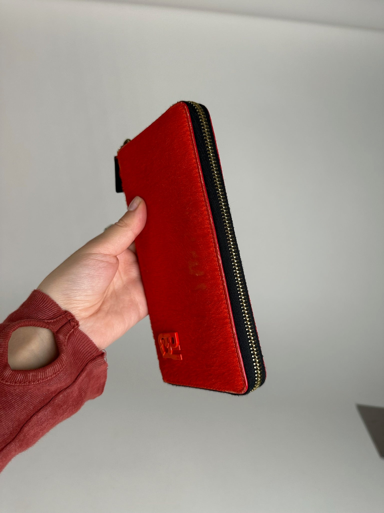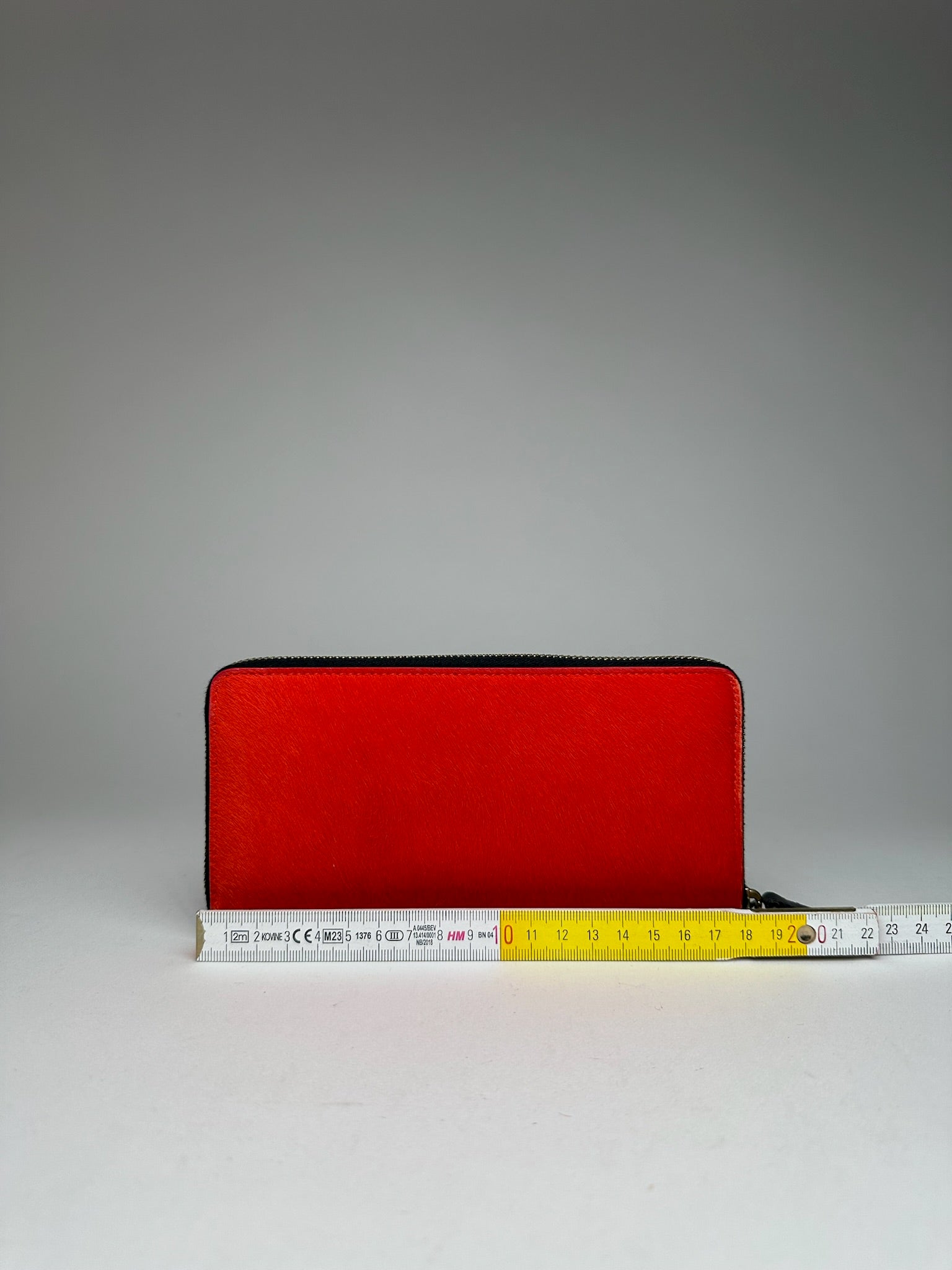 PUCCI Vintage Wallet. This chic accessory is finely crafted of orange fur and leather with a black leather zipper trim. The interior is lined with black leather and offers ample space for essentials.