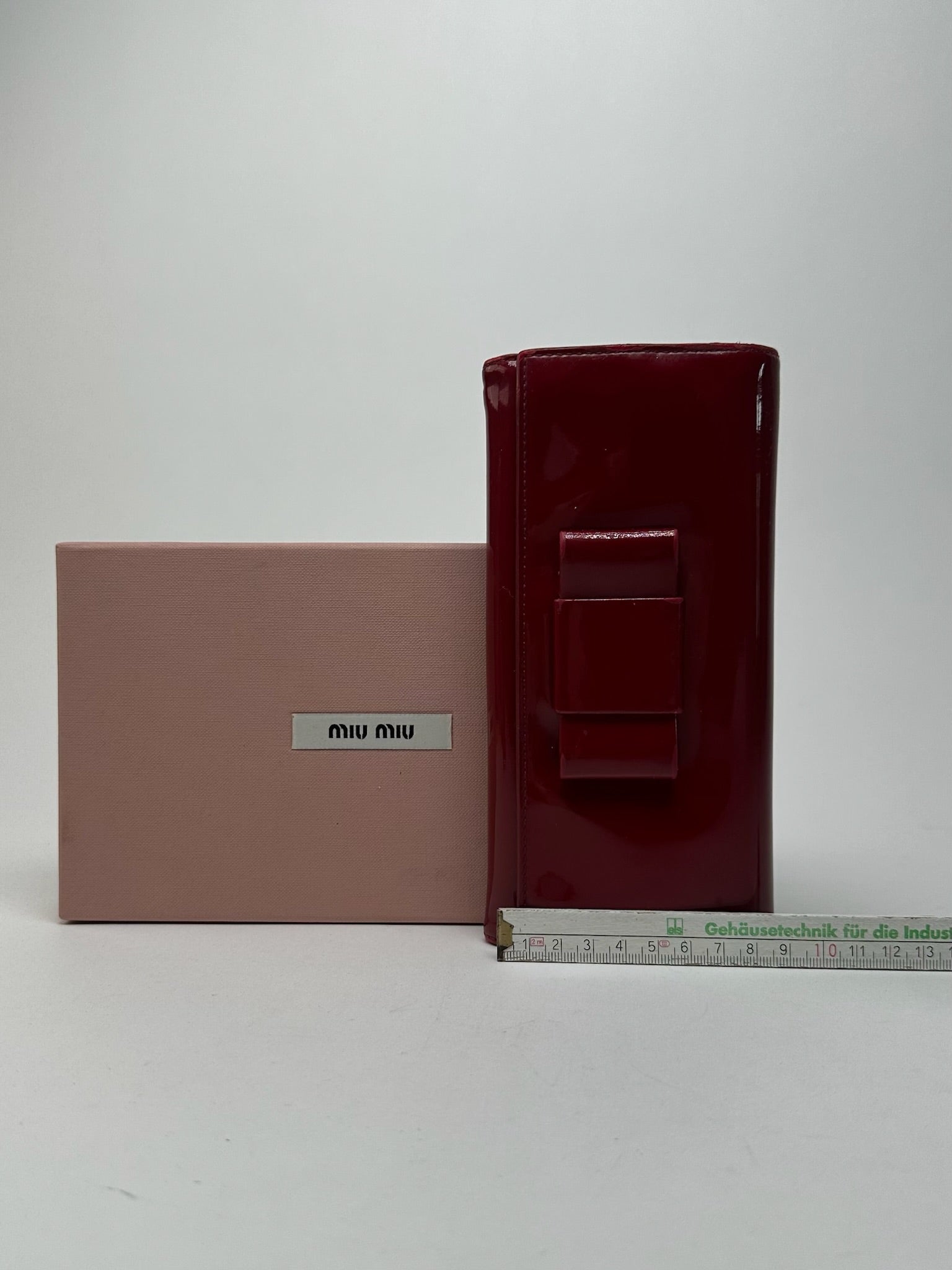 MIU MIU Vintage Patent Leather Wallet. This chic wallet is finely crafted of dark red patent leather with gold-tone steel hardware. The back features a bow appliqué made of matching material. It opens with snap closures to a pink leather interior with multiple compartments.