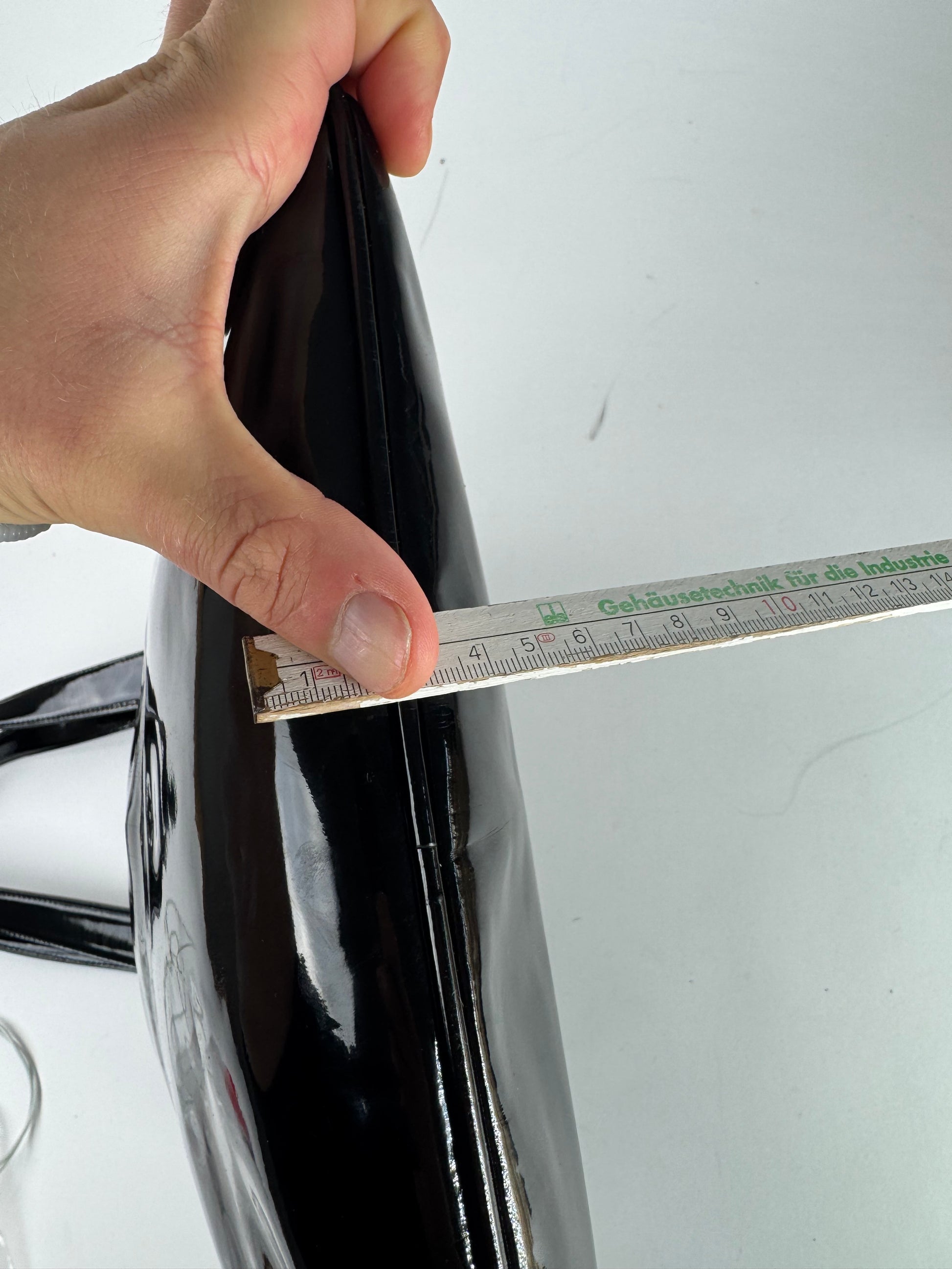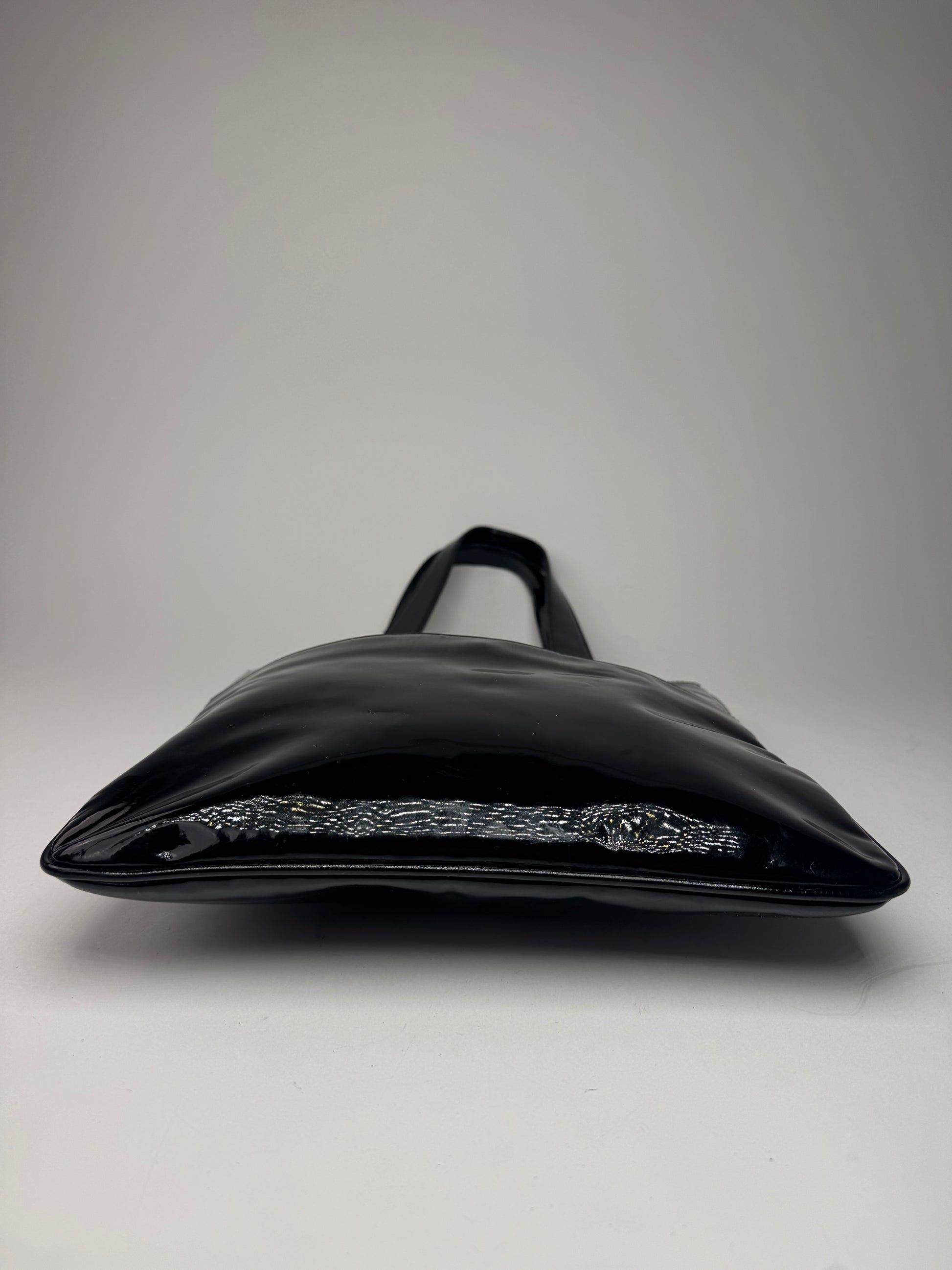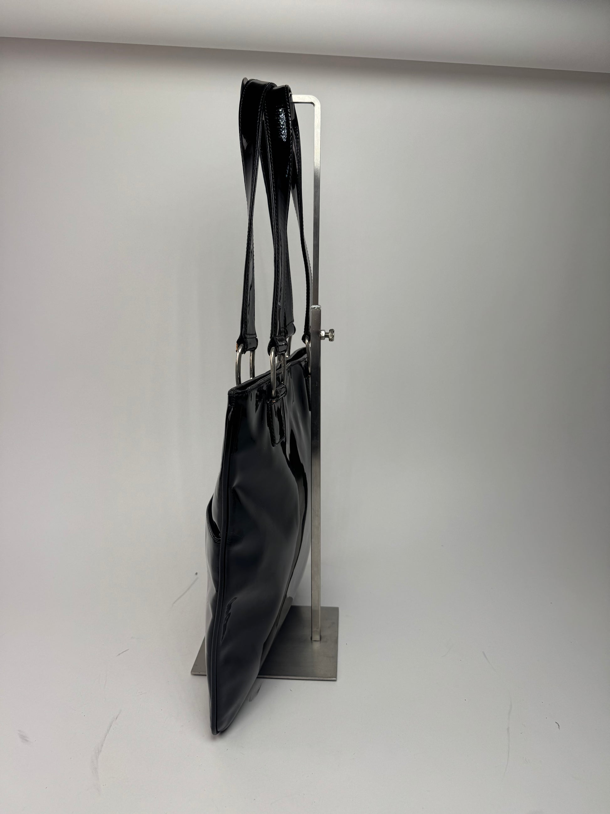 LOEWE MADRID Vintage Handbag. This chic handbag is finely crafted of black patent leather with silver-tone steel hardware. It features a magnetic closure and an additional compartment with magnetic fastening. The front is adorned with the iconic silver Loewe anagram logo. Founded in 1846 in Madrid, Loewe is one of the oldest luxury houses in the world, renowned for its exceptional leather craftsmanship and timeless Spanish elegance.