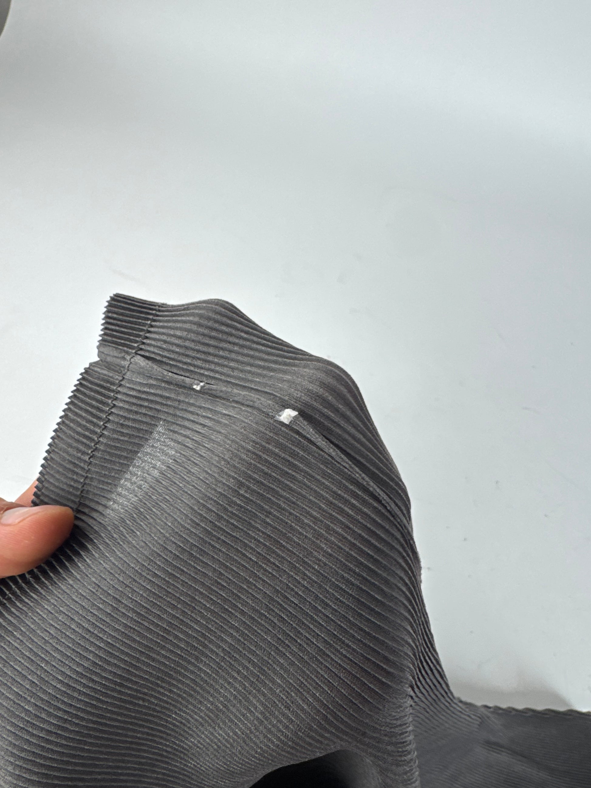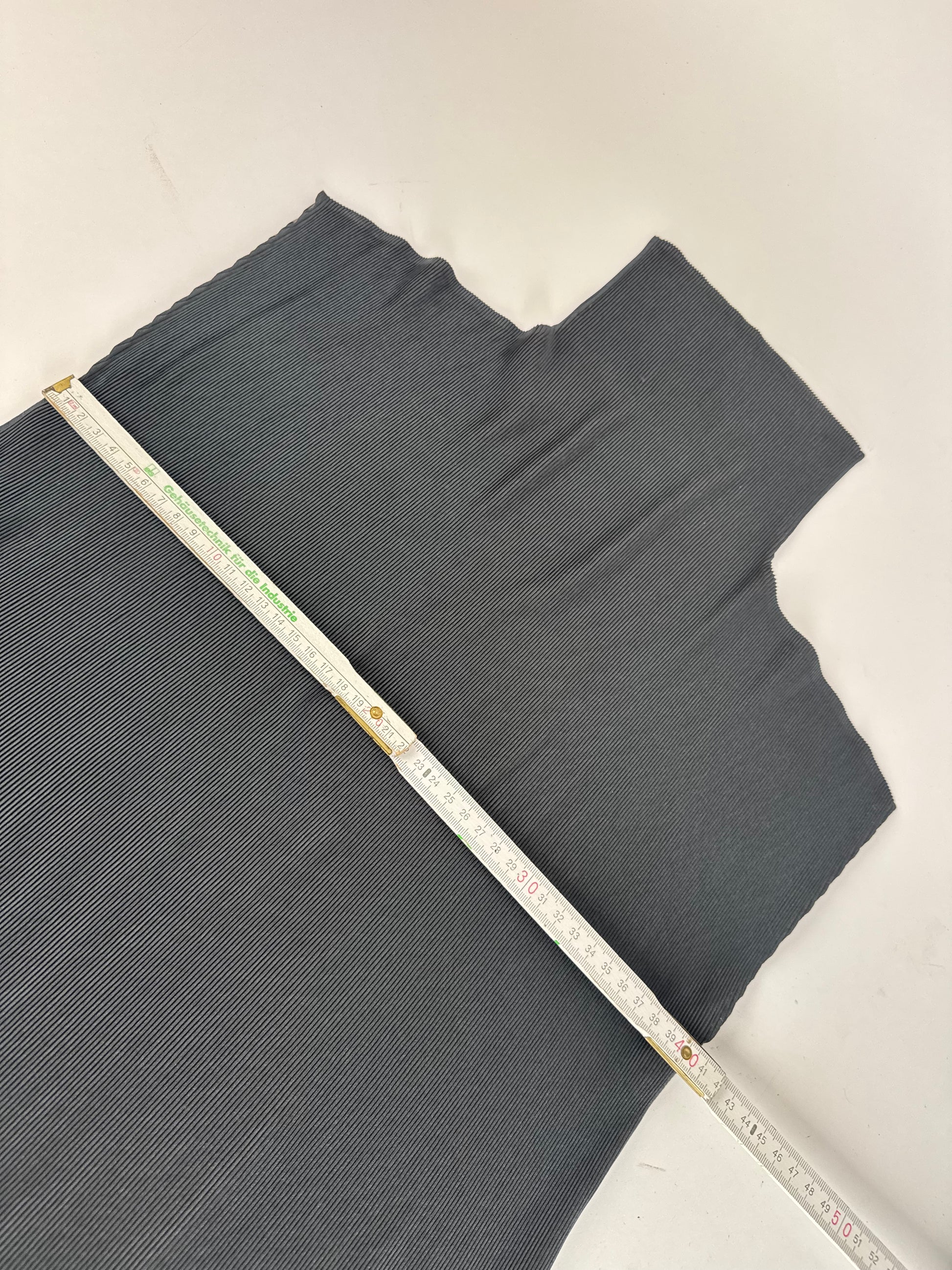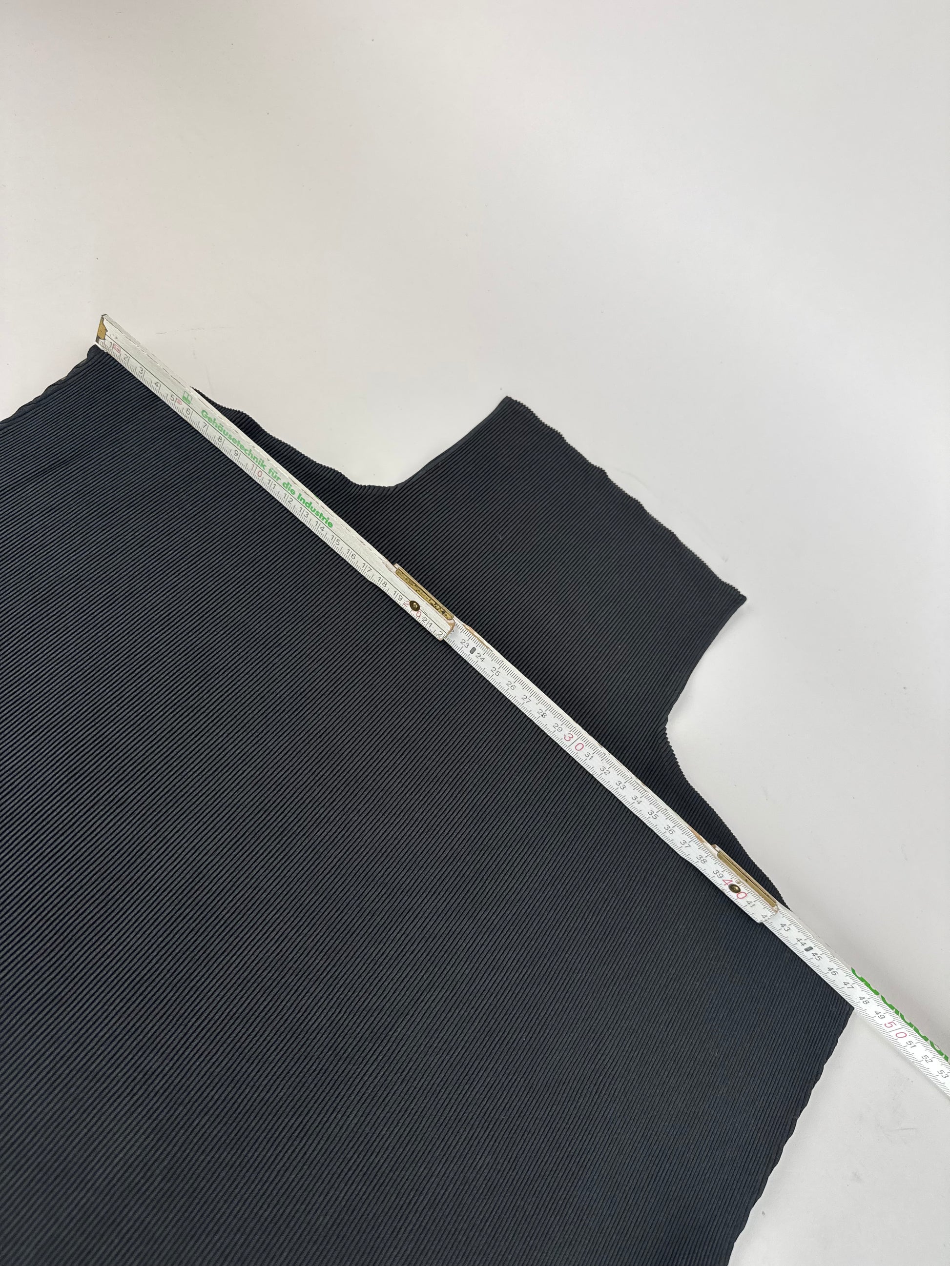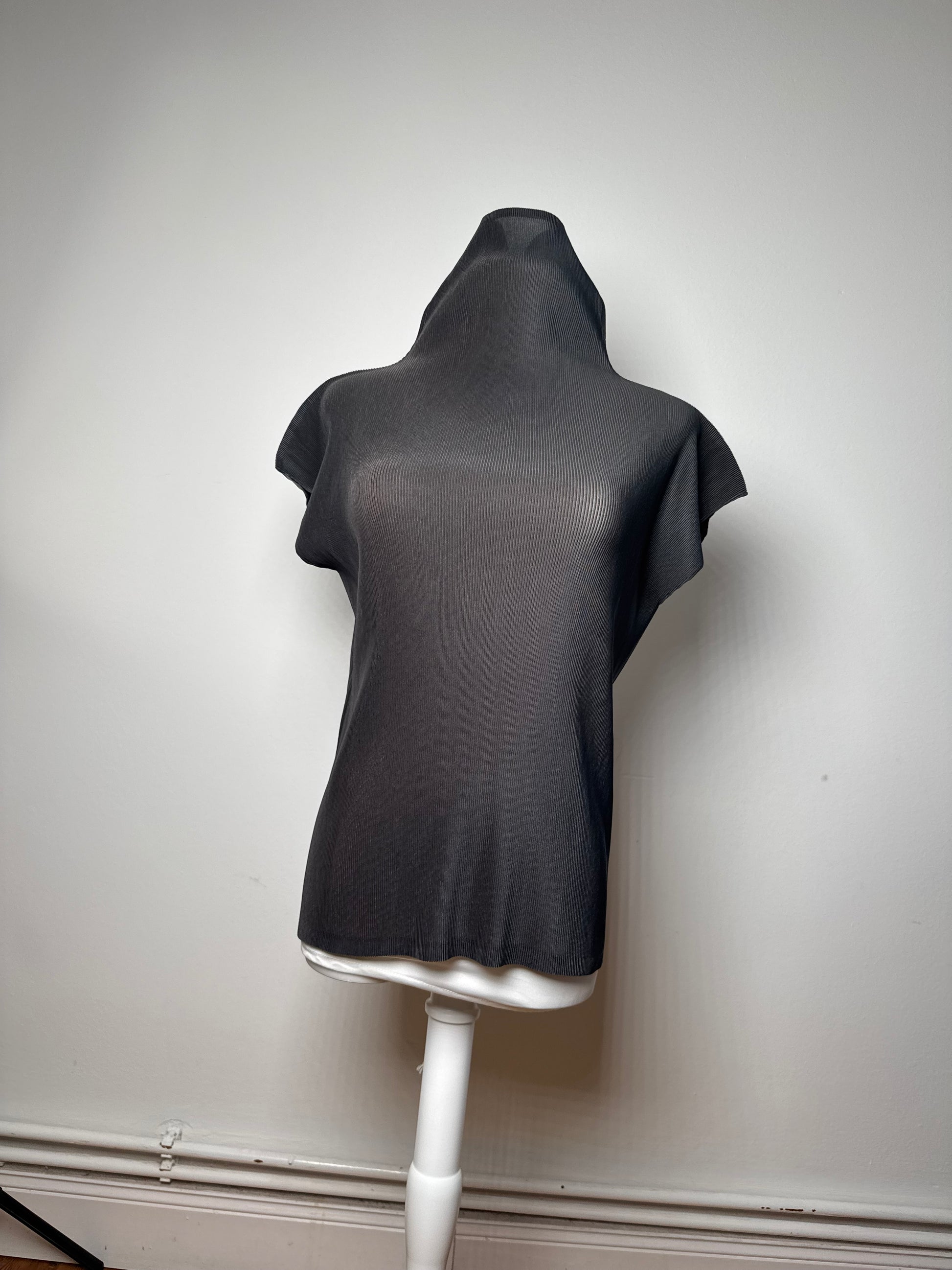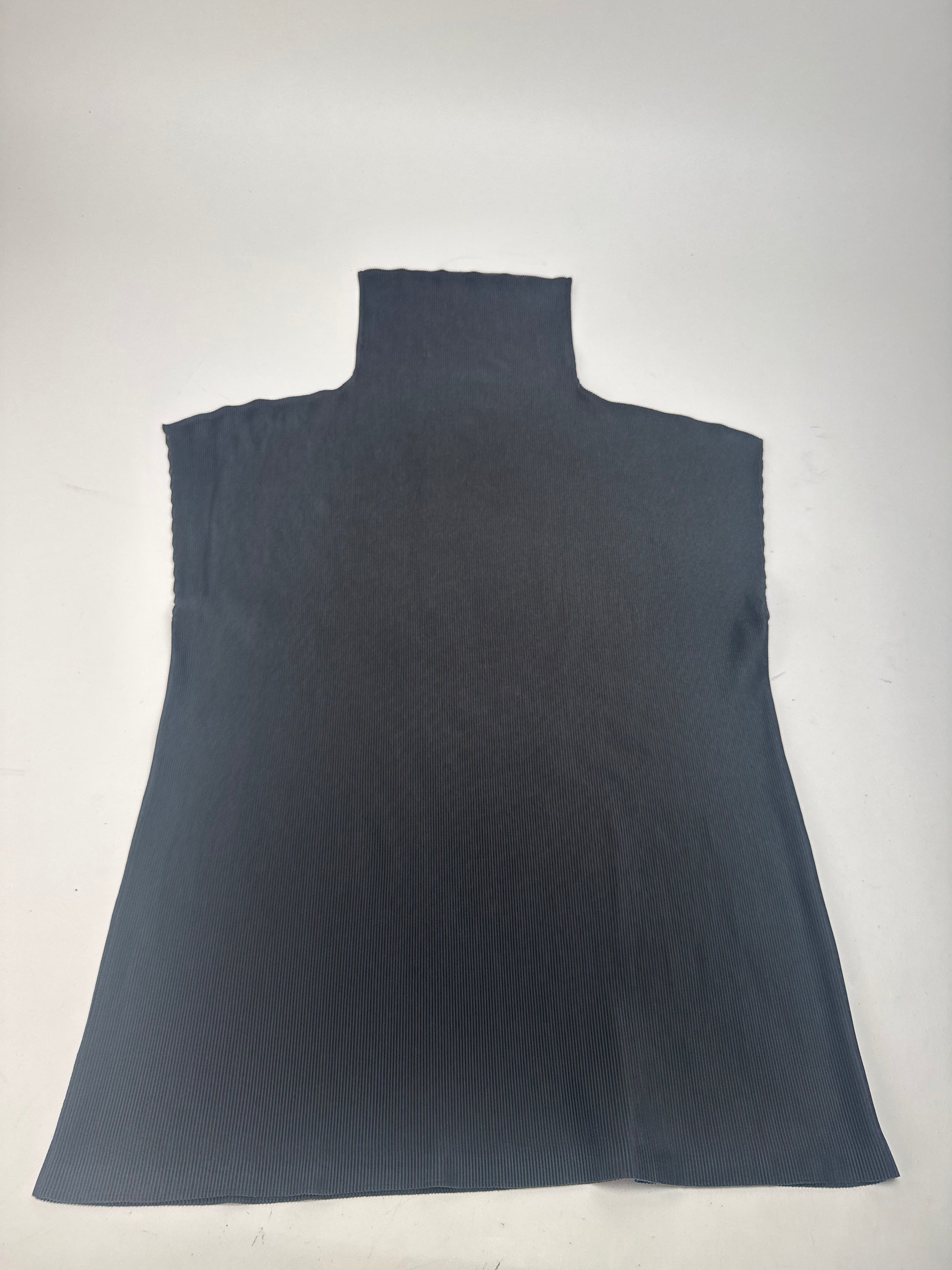 ISSEY MIYAKE (Pleats Please) Vintage Anthracite Pleated Tank Top with Turtleneck. This distinctive top is finely crafted in Issey Miyake’s signature pleated fabric (plissé) in an anthracite tone. It is styled as a sleeveless tank top with a high roll neck. The mannequin in the photo is size 38/M.