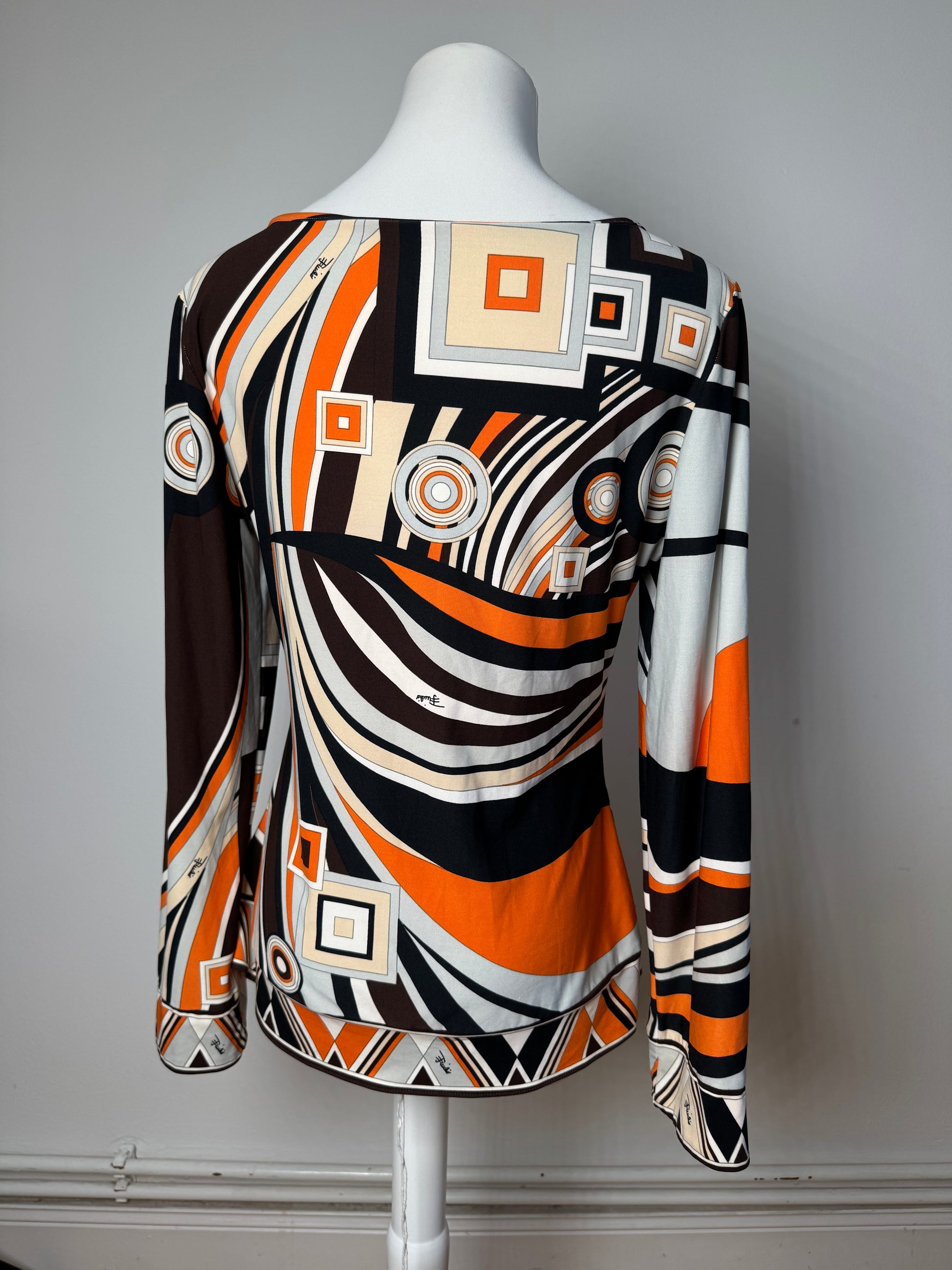 This chic sweater is finely crafted of 100% silk in a grey, beige, and orange patterned design. Emilio Pucci, known as the "Prince of Prints," rose to fame in the 1950s for his vibrant patterns and luxurious fabrics, making vintage Pucci knitwear both collectible and timeless. The mannequin in the photo is wearing size M.