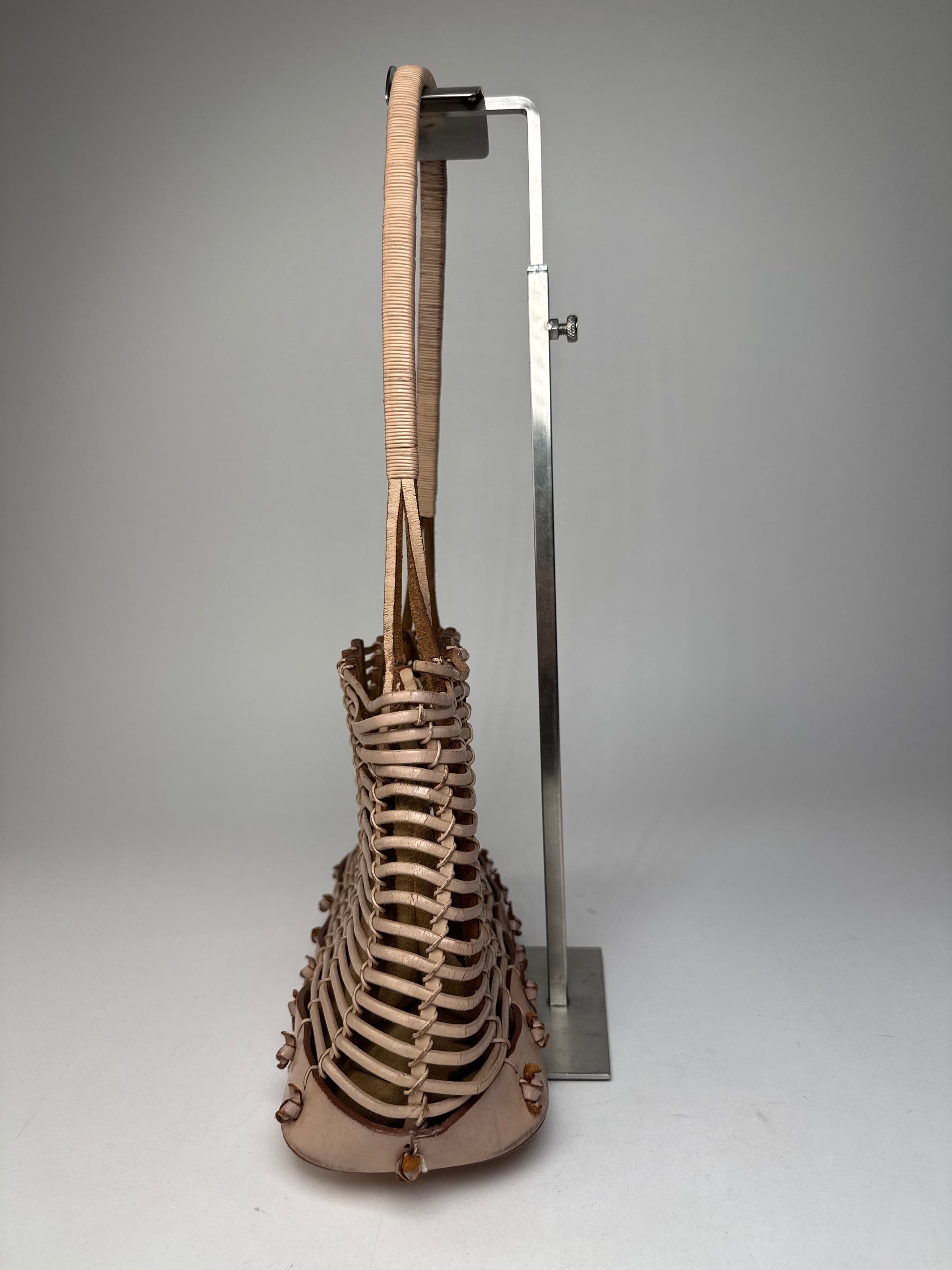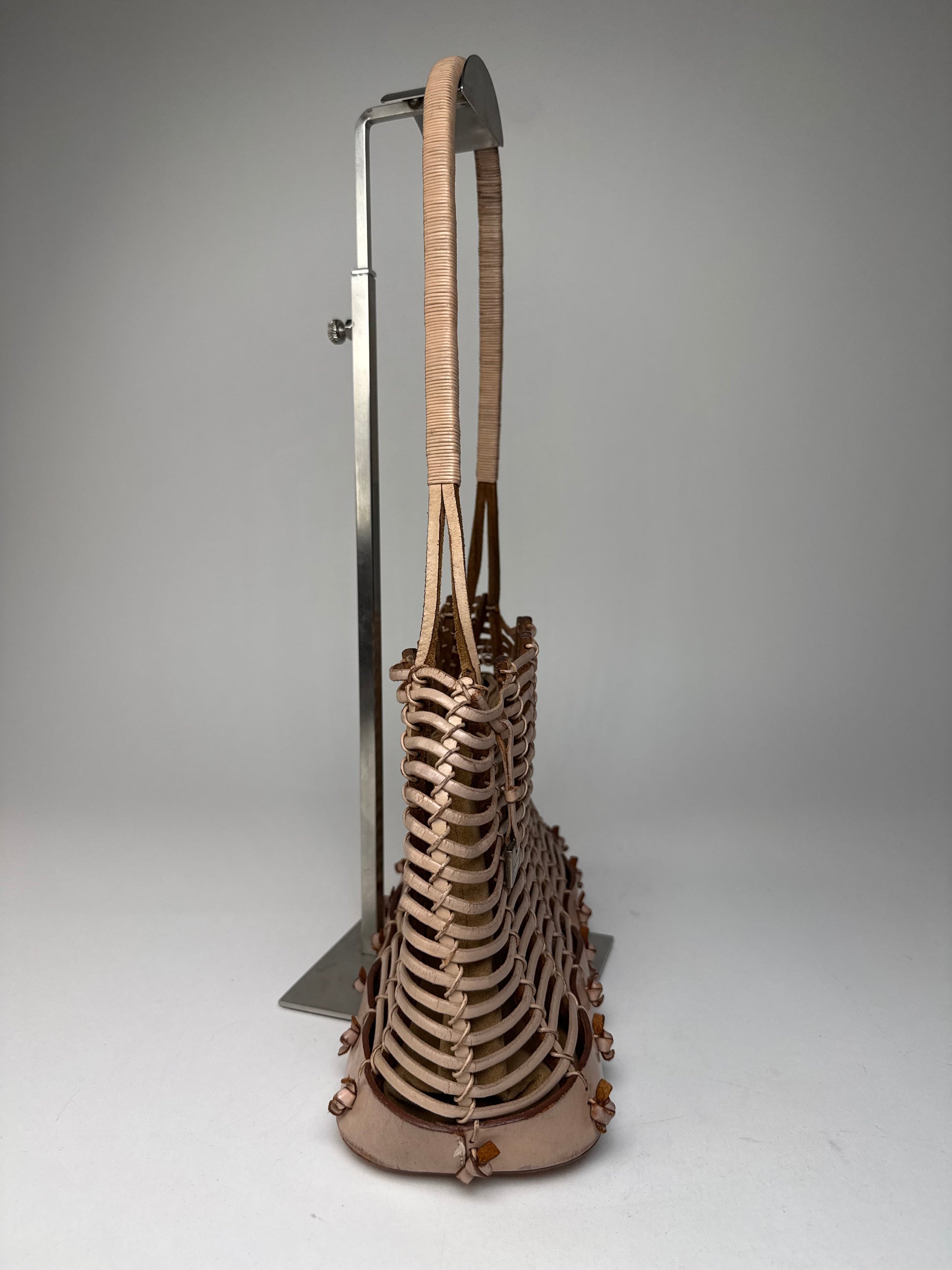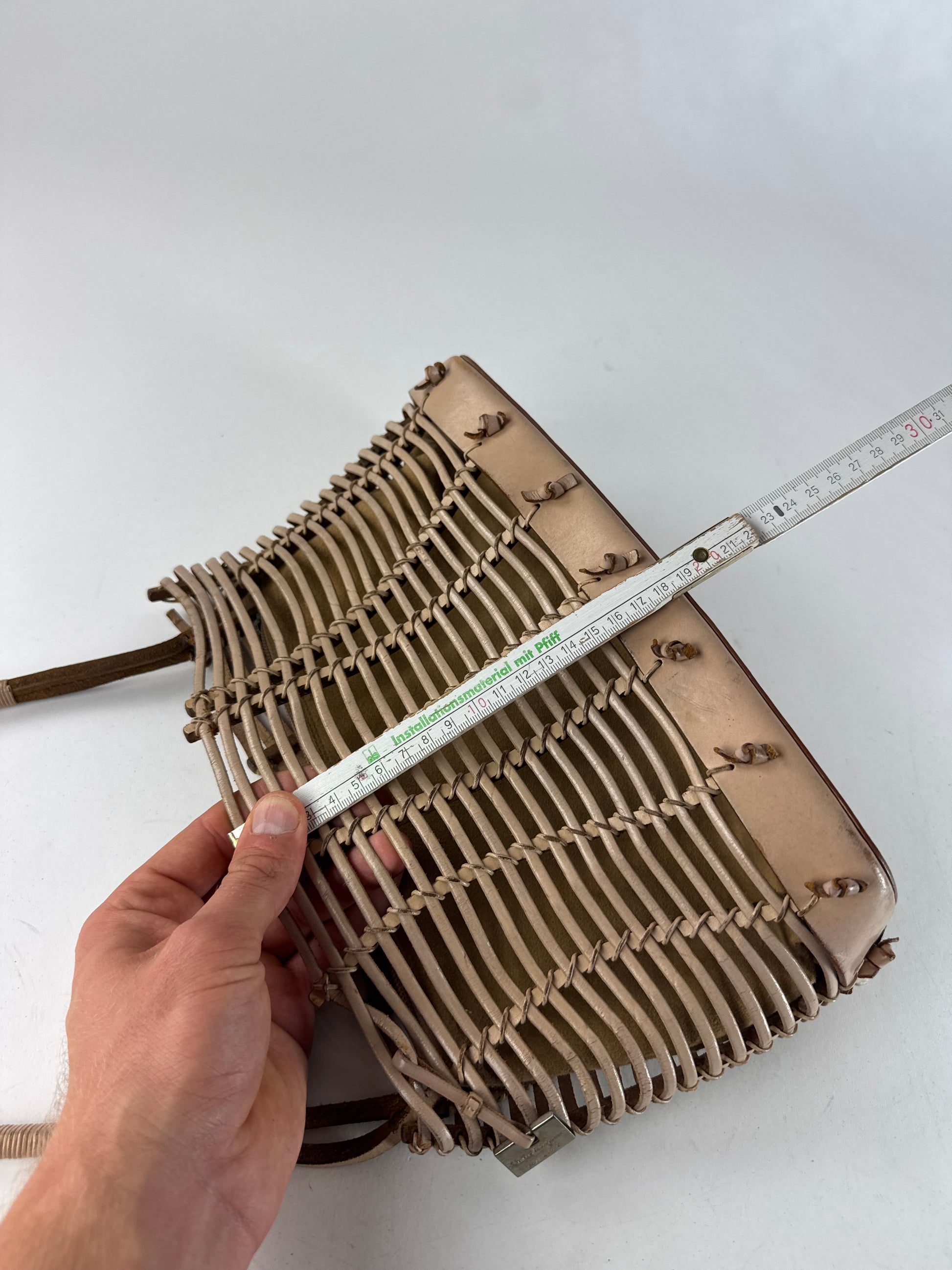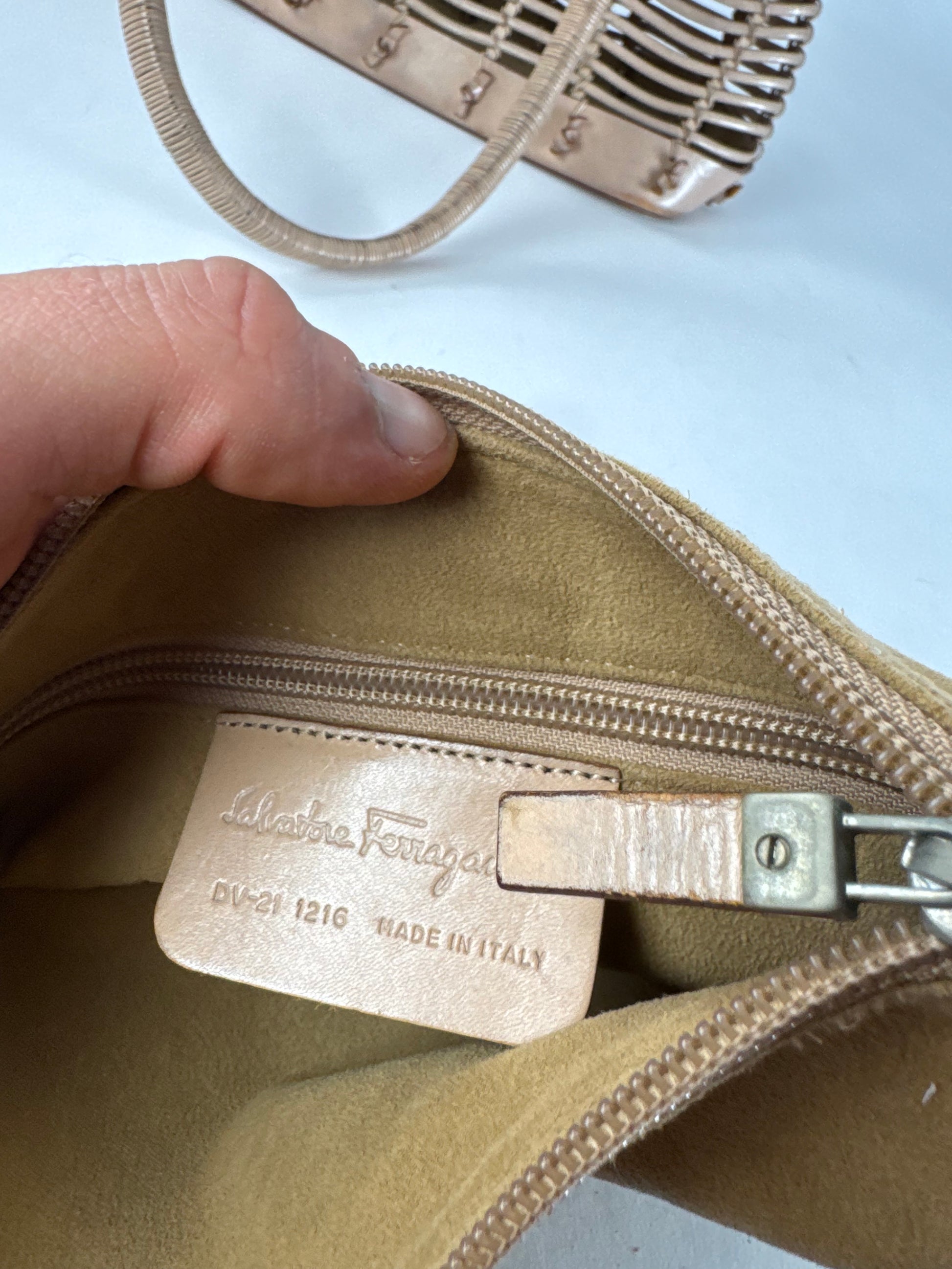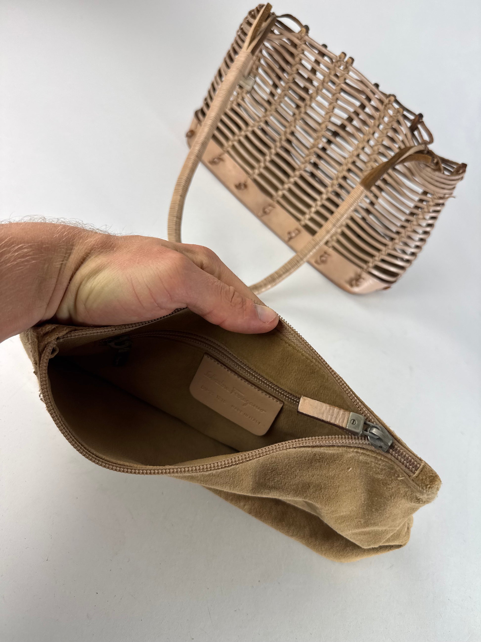 SALVATORE FERRAGAMO Vintage Leather Handbag “Cage”. This distinctive vintage handbag in the Cage model is crafted from beige-brown leather and features an open, structured design—true to its name, as “Cage” translates to a cage-like construction that showcases Ferragamo’s architectural approach to accessories. The bag comes with a removable inner leather clutch, combining functionality with refined Italian craftsmanship.