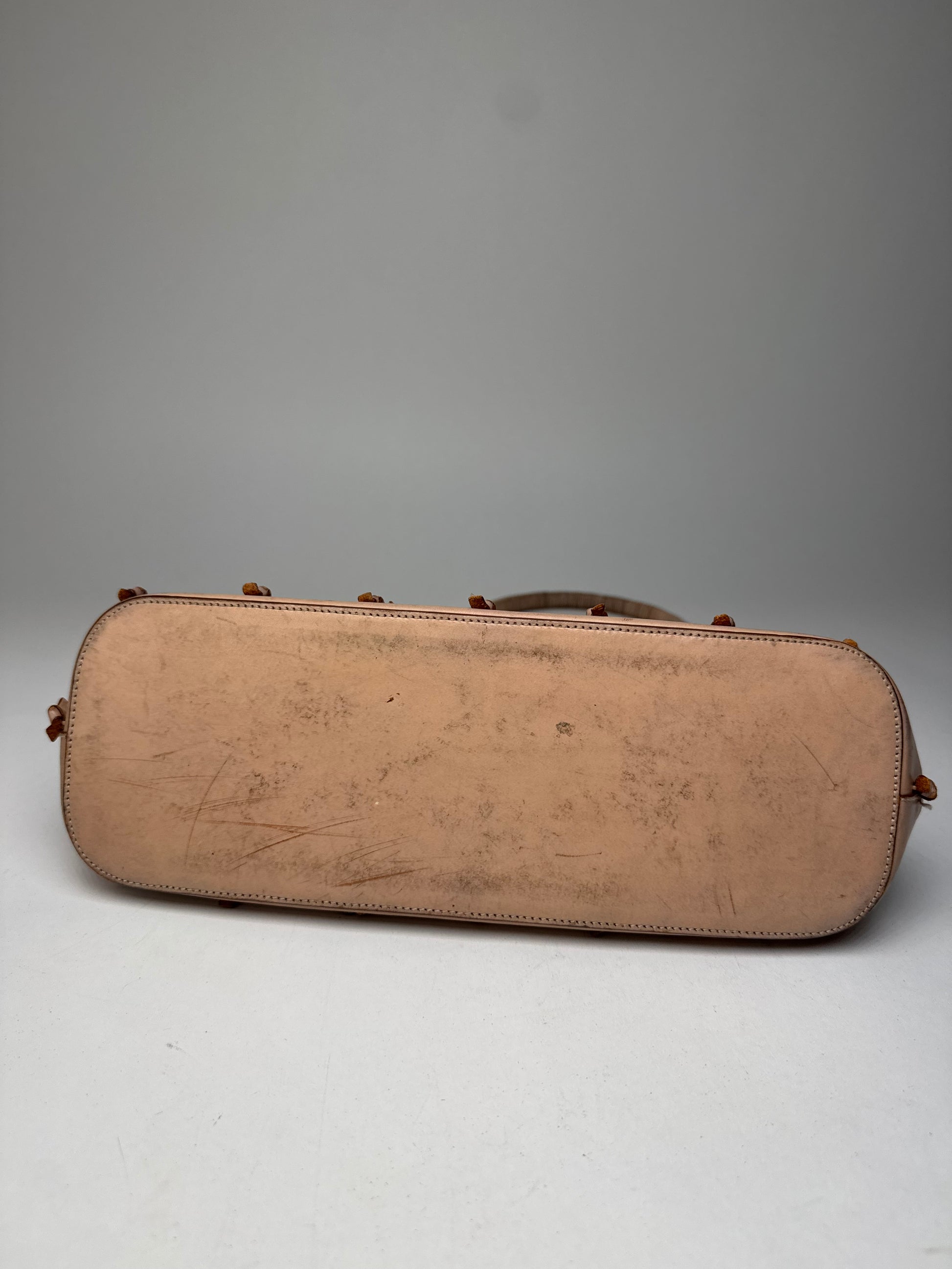 Condition Details: The leather shows signs of wear with damaged areas and loosened screws. The underside of the bag has noticeable stains and heavier wear. Overall, despite these flaws, the bag remains in very good vintage condition. The inner clutch is well preserved.