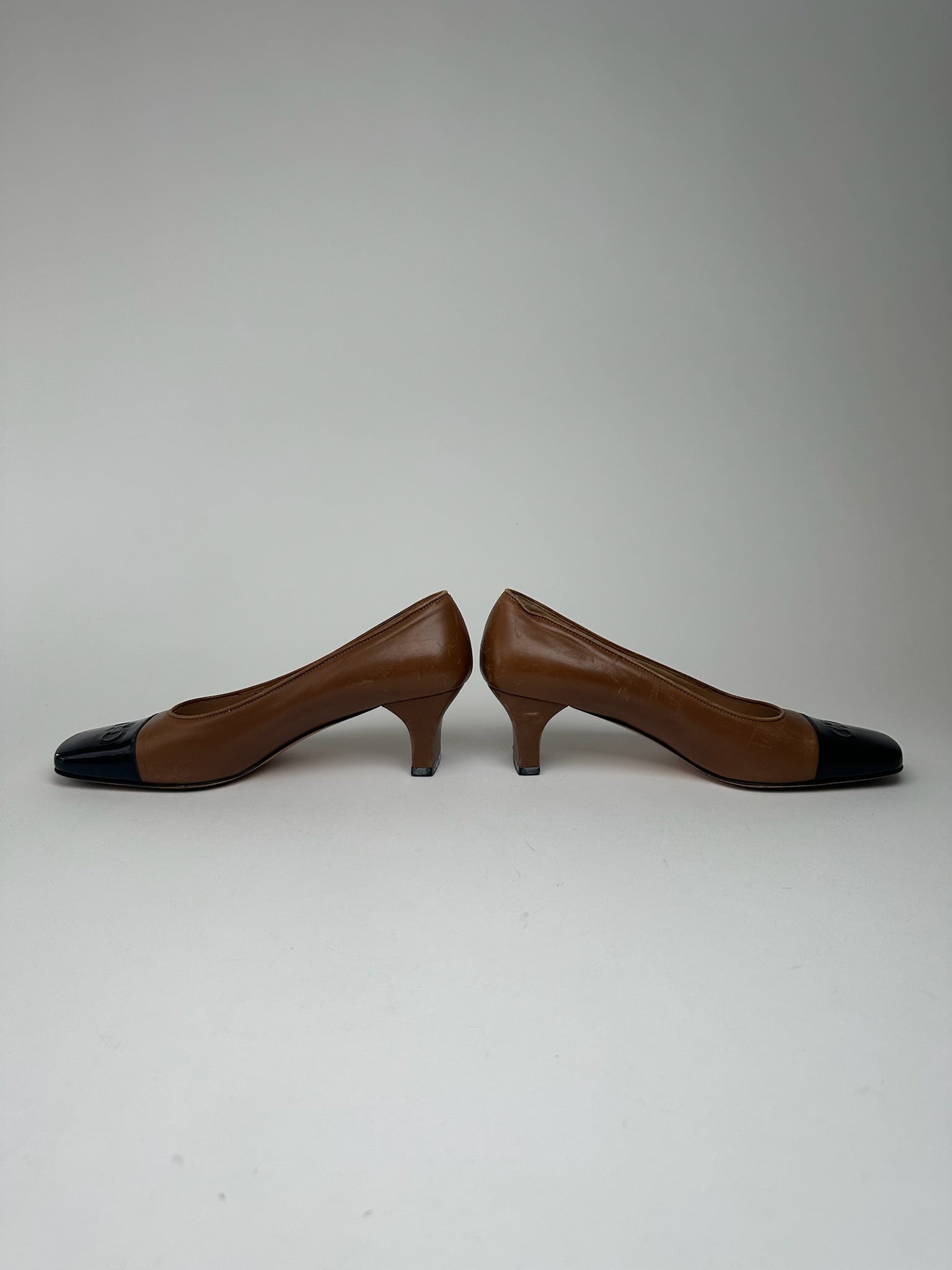 These elegant heels are finely crafted of brown and black leather. The shoes feature a classic silhouette with a rounded toe and a comfortable mid-height heel.