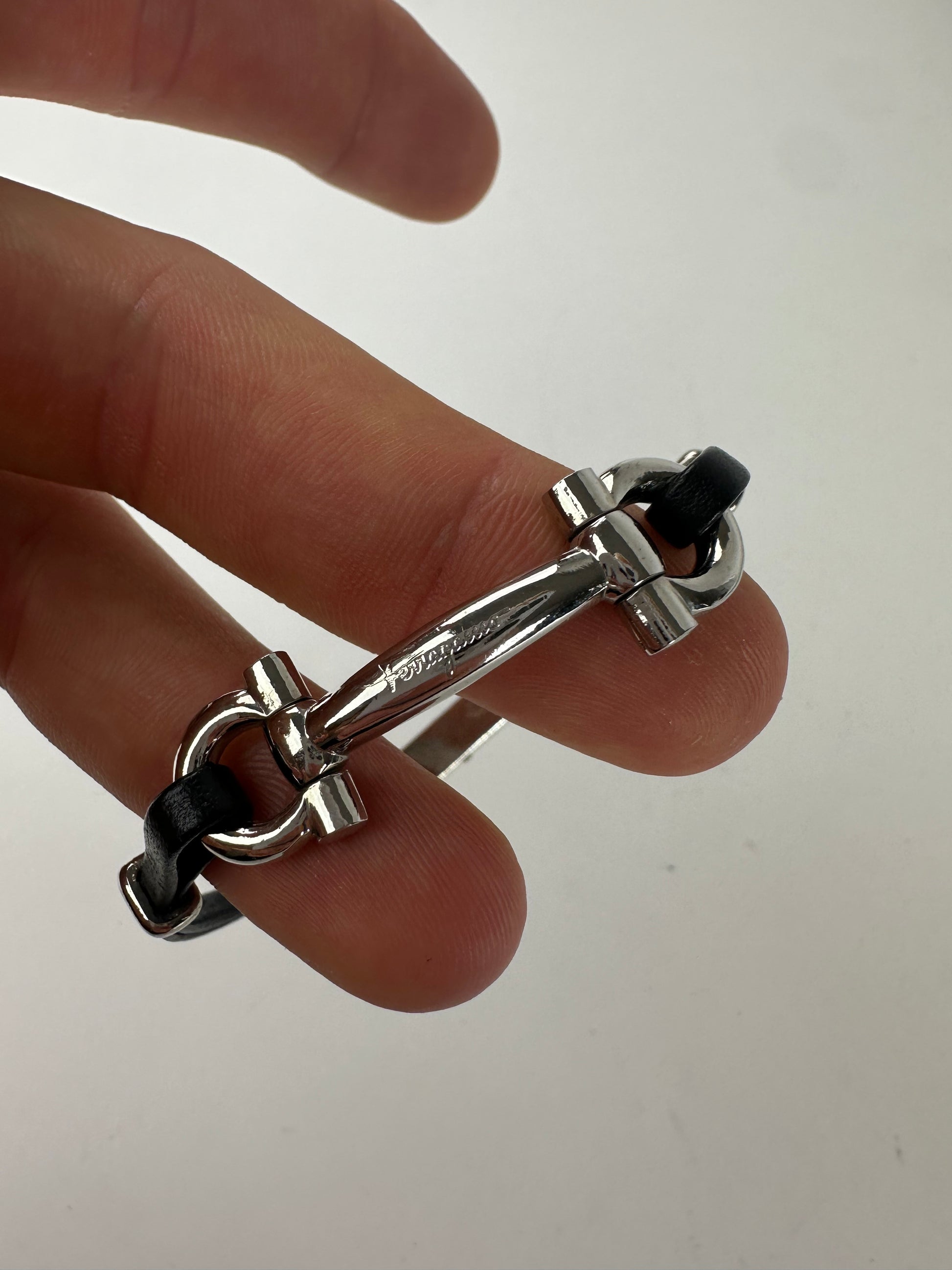 SALVATORE FERRAGAMO Vintage Horsebit Bracelet. This elegant bracelet is crafted of black leather and features a double Horsebit appliqué in silver-tone steel. The bracelet has a snap button closure.