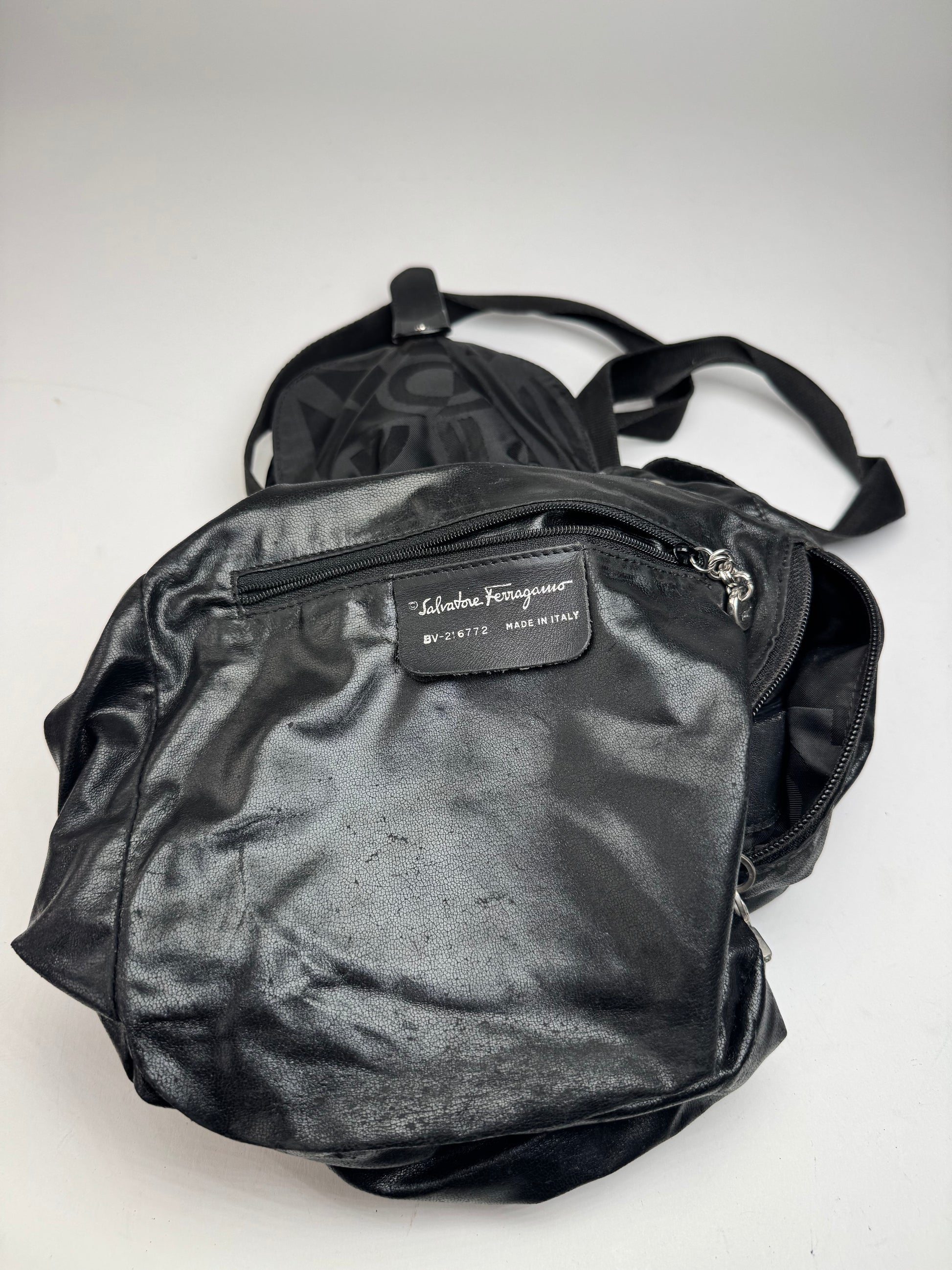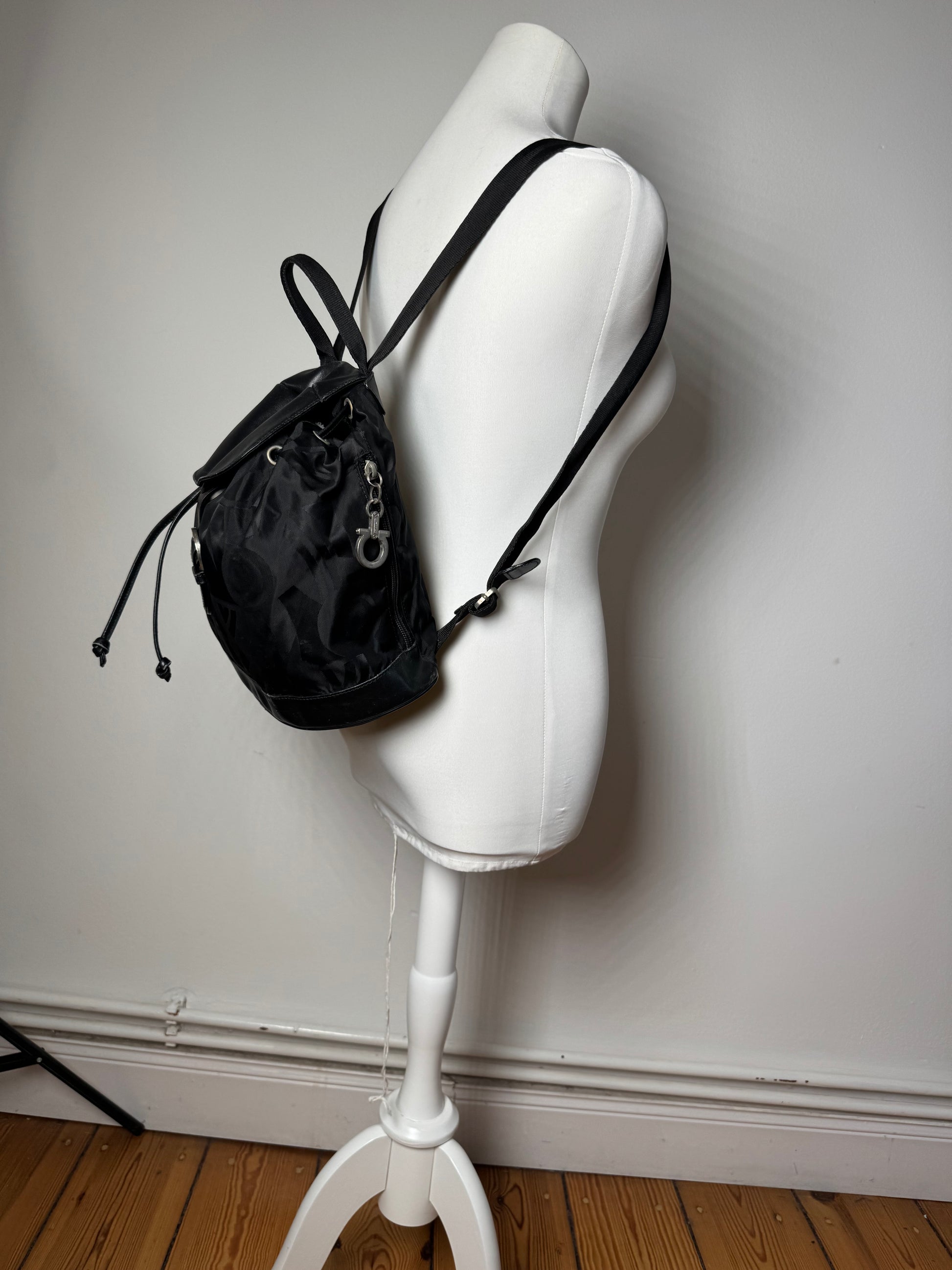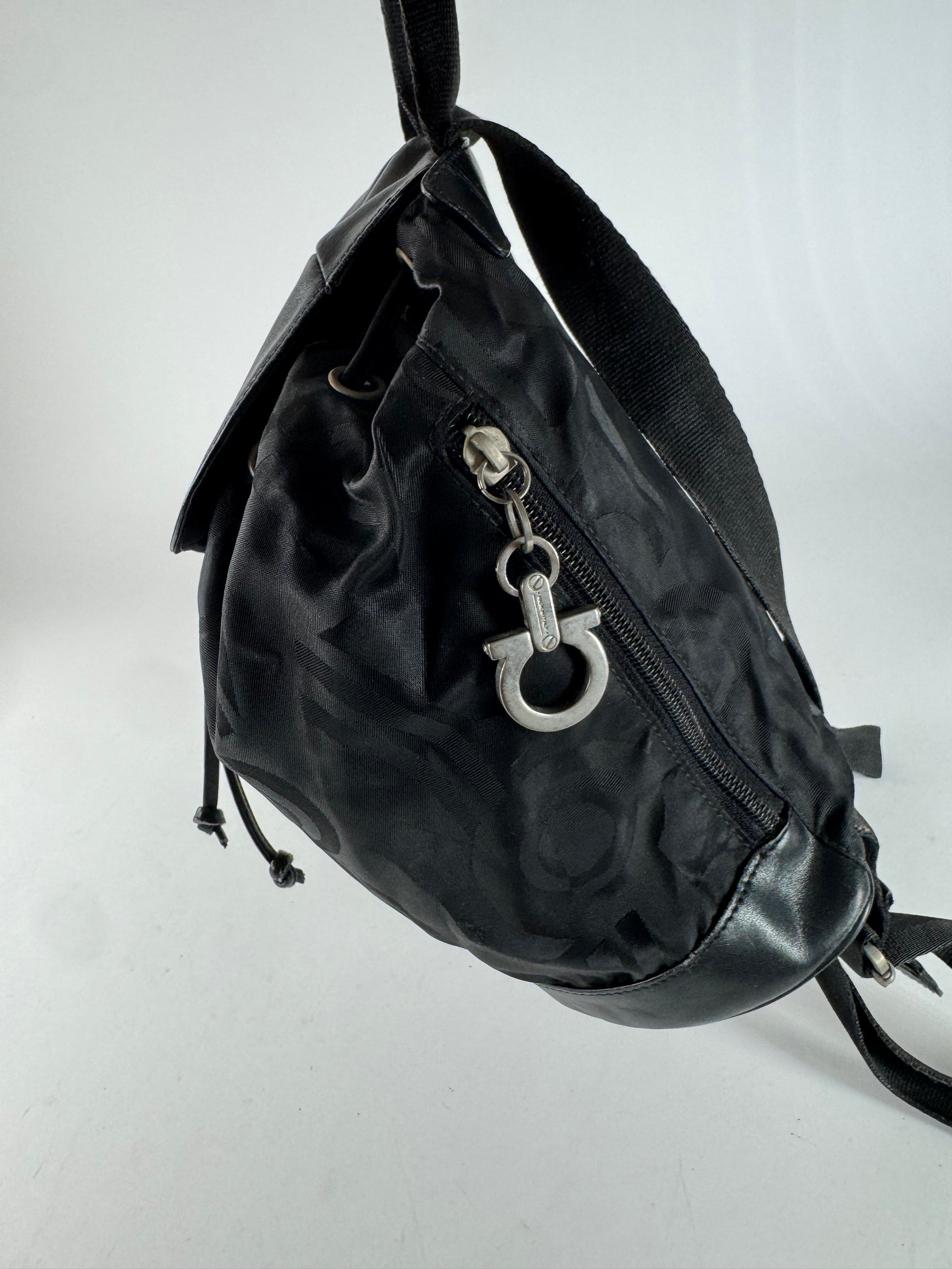 SALVATORE FERRAGAMO Vintage Monogram Backpack. This sleek vintage backpack is crafted of black polyester with Ferragamo monogram detailing. The backpack features black leather trim, silver-tone hardware, and a unisex design. The top opens to a black vegan leather interior. Made in Italy.