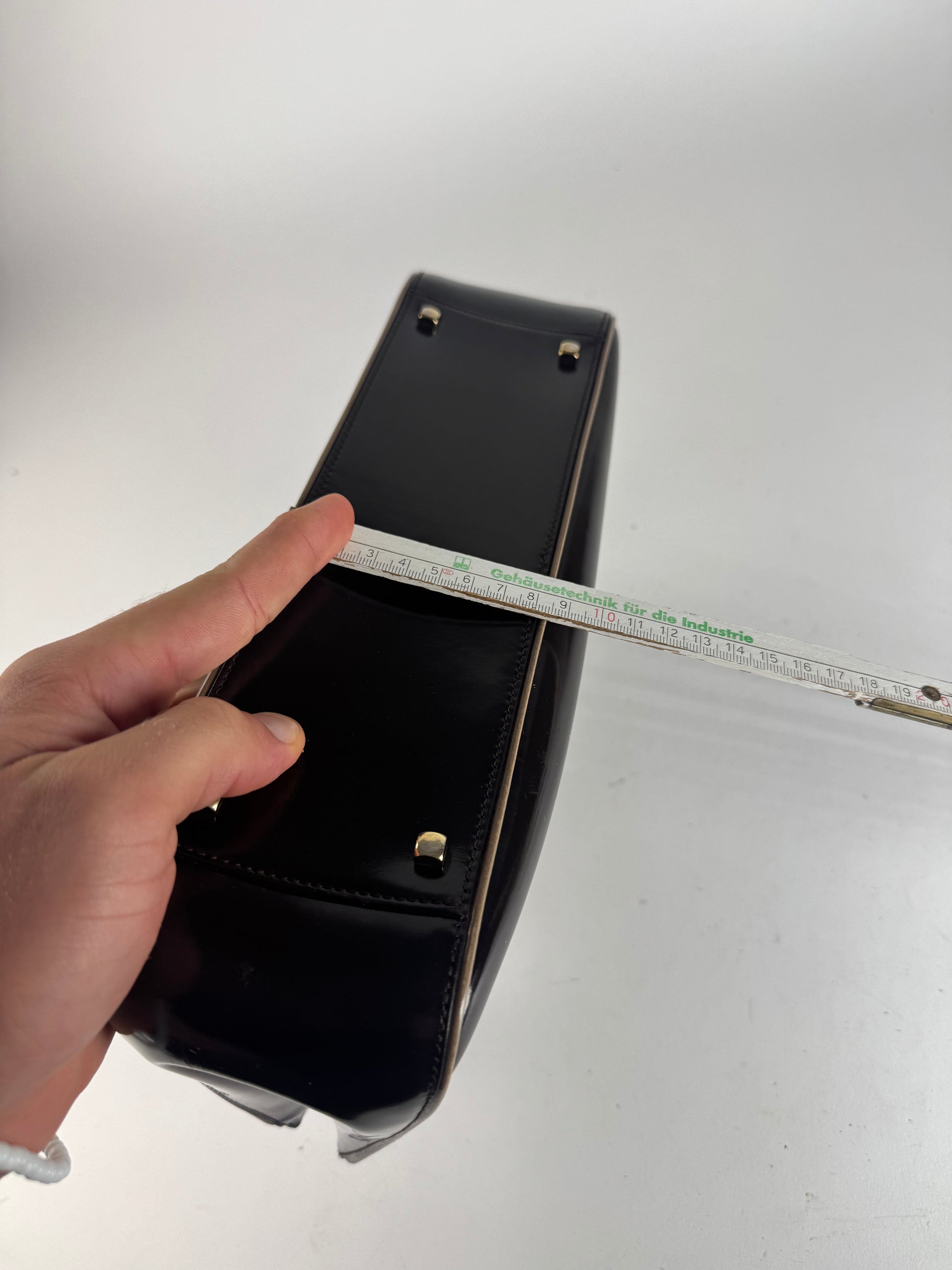 Condition Details: The exterior patent leather shows light scratches, but overall the bag remains in very good condition.