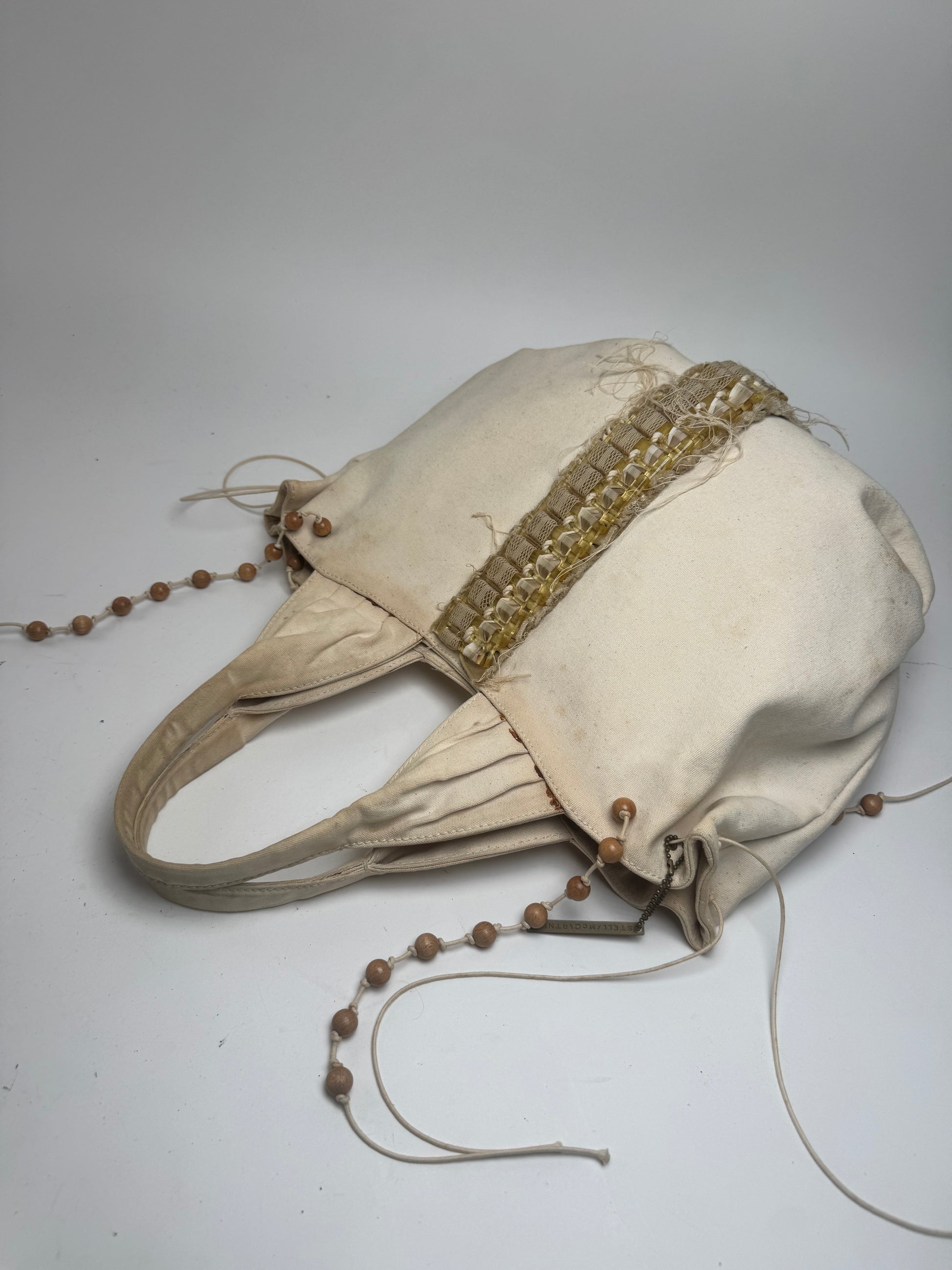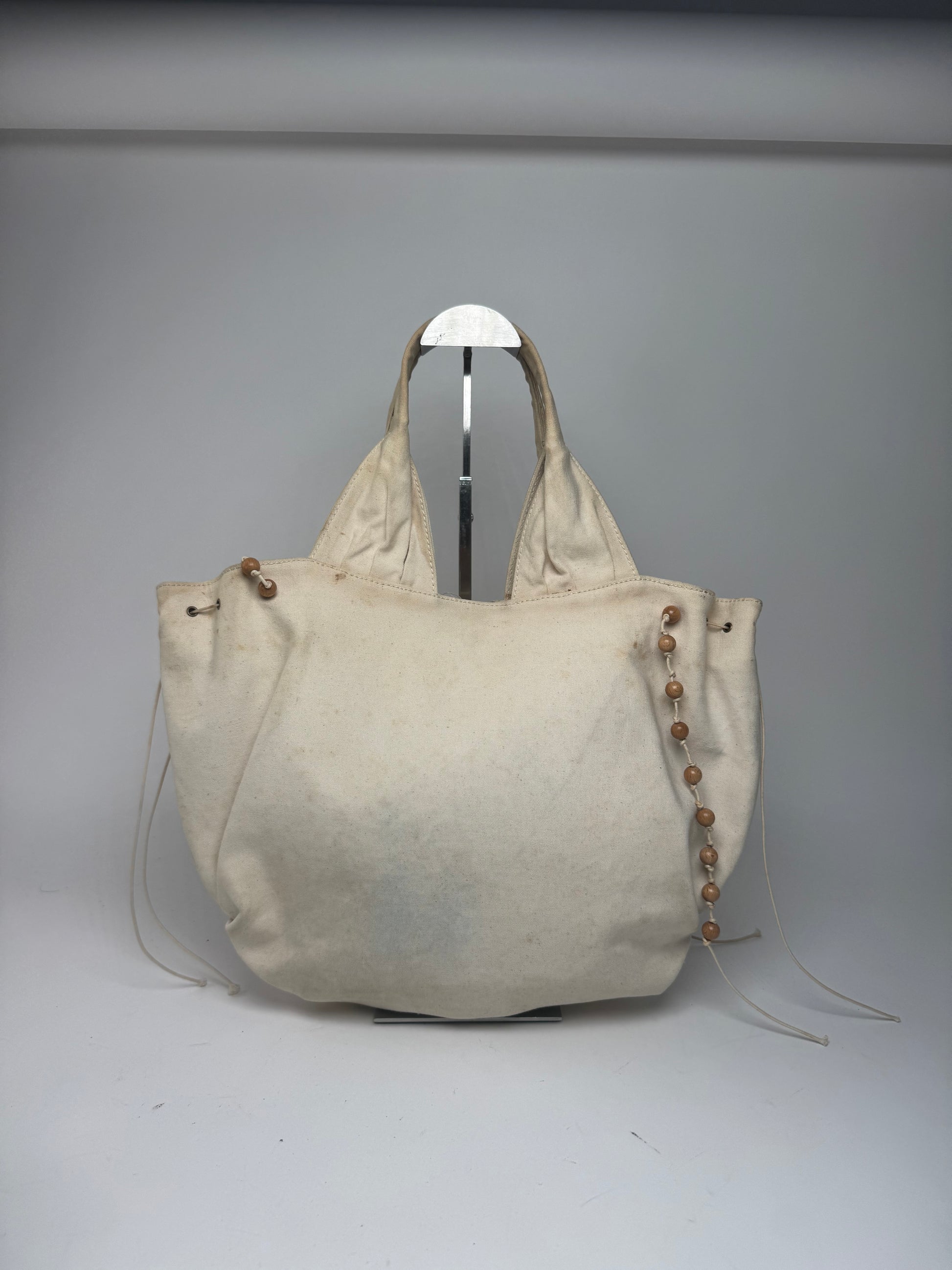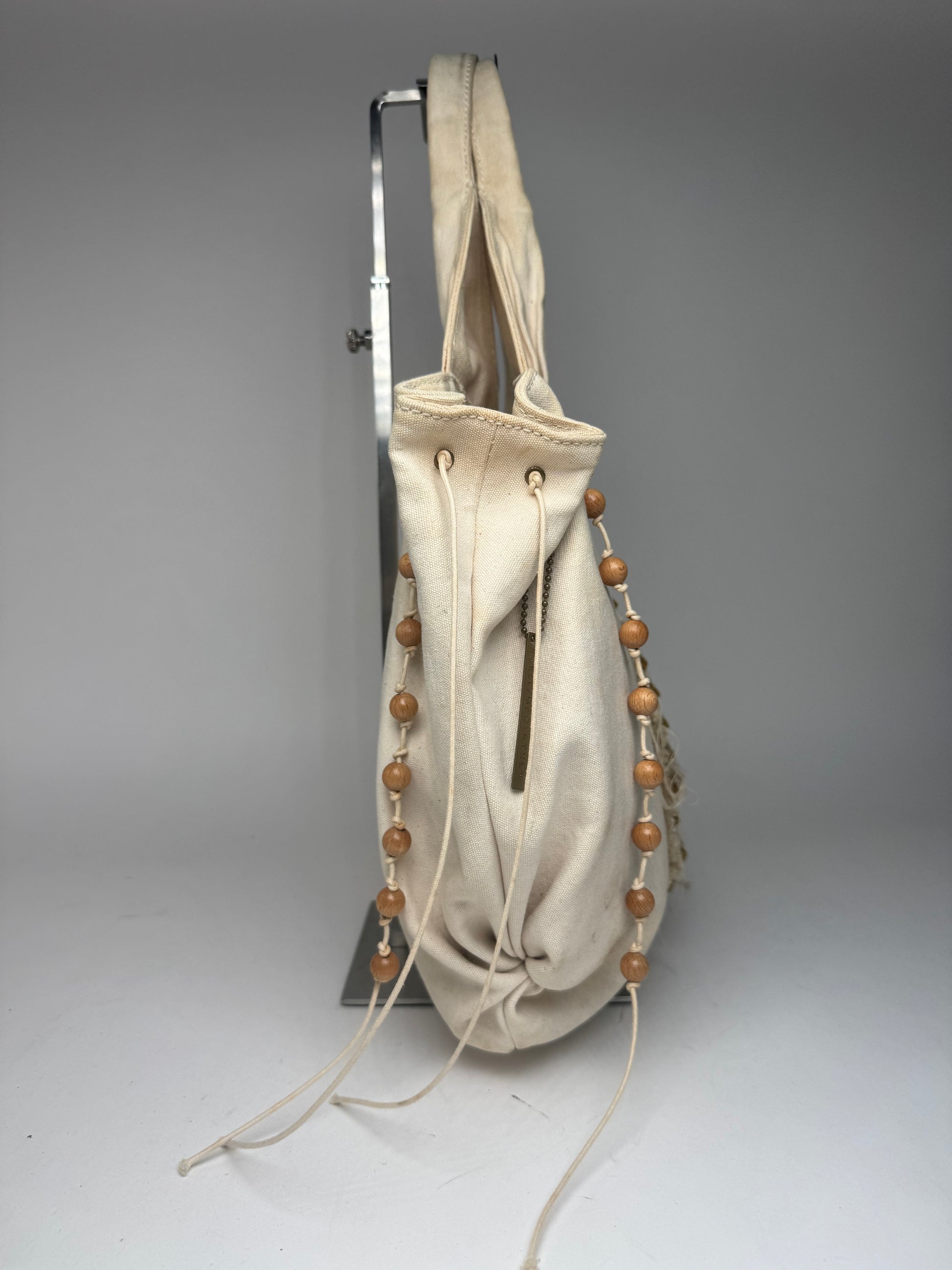 STELLA MCCARTNEY Vintage Handbag. This unique handbag is finely crafted of beige canvas or denim in an avant-garde style. The design features denim chain details adorned with wooden beads, complemented by numerous fringes cascading from the top. The interior is lined with lilac canvas.