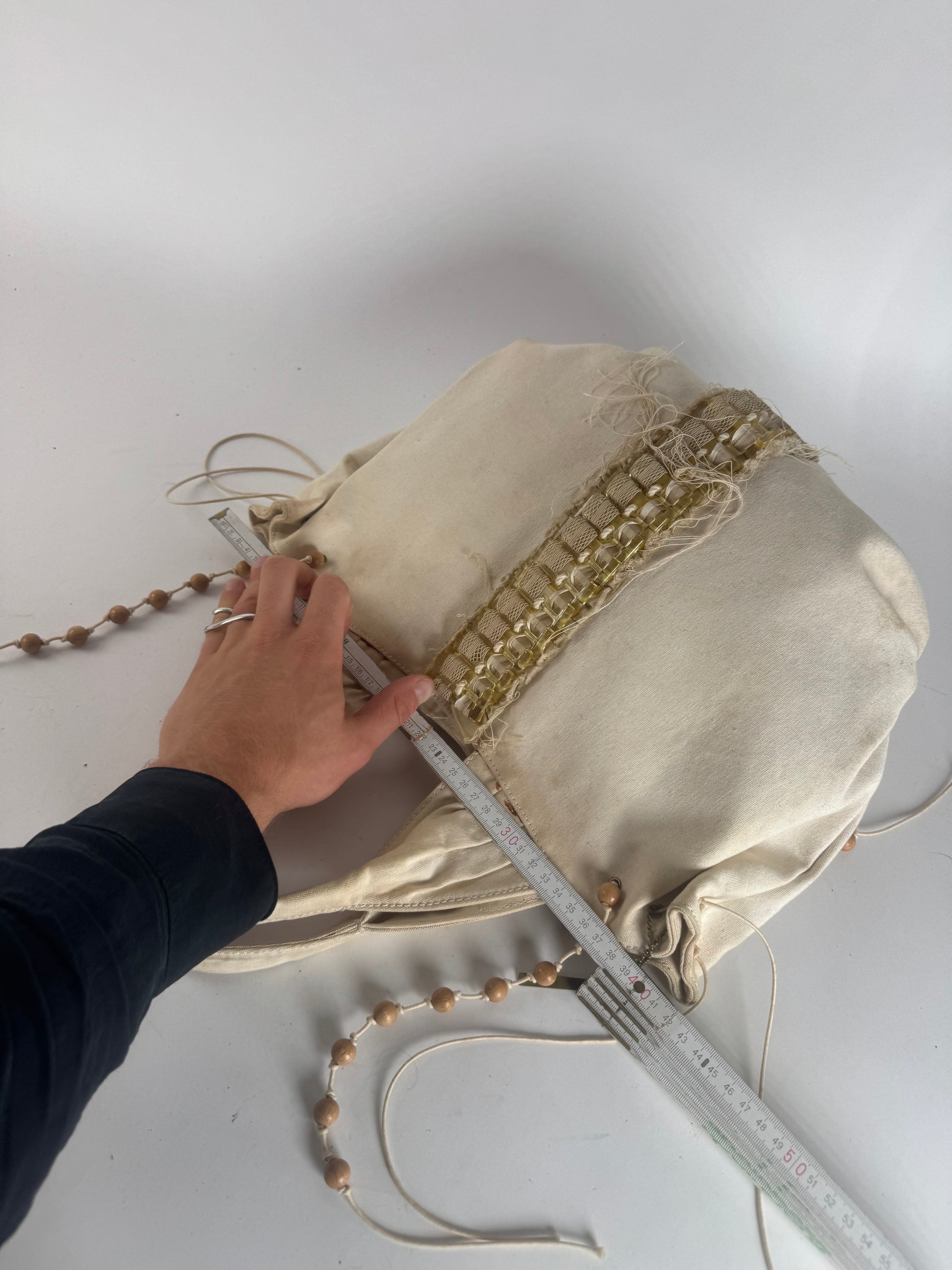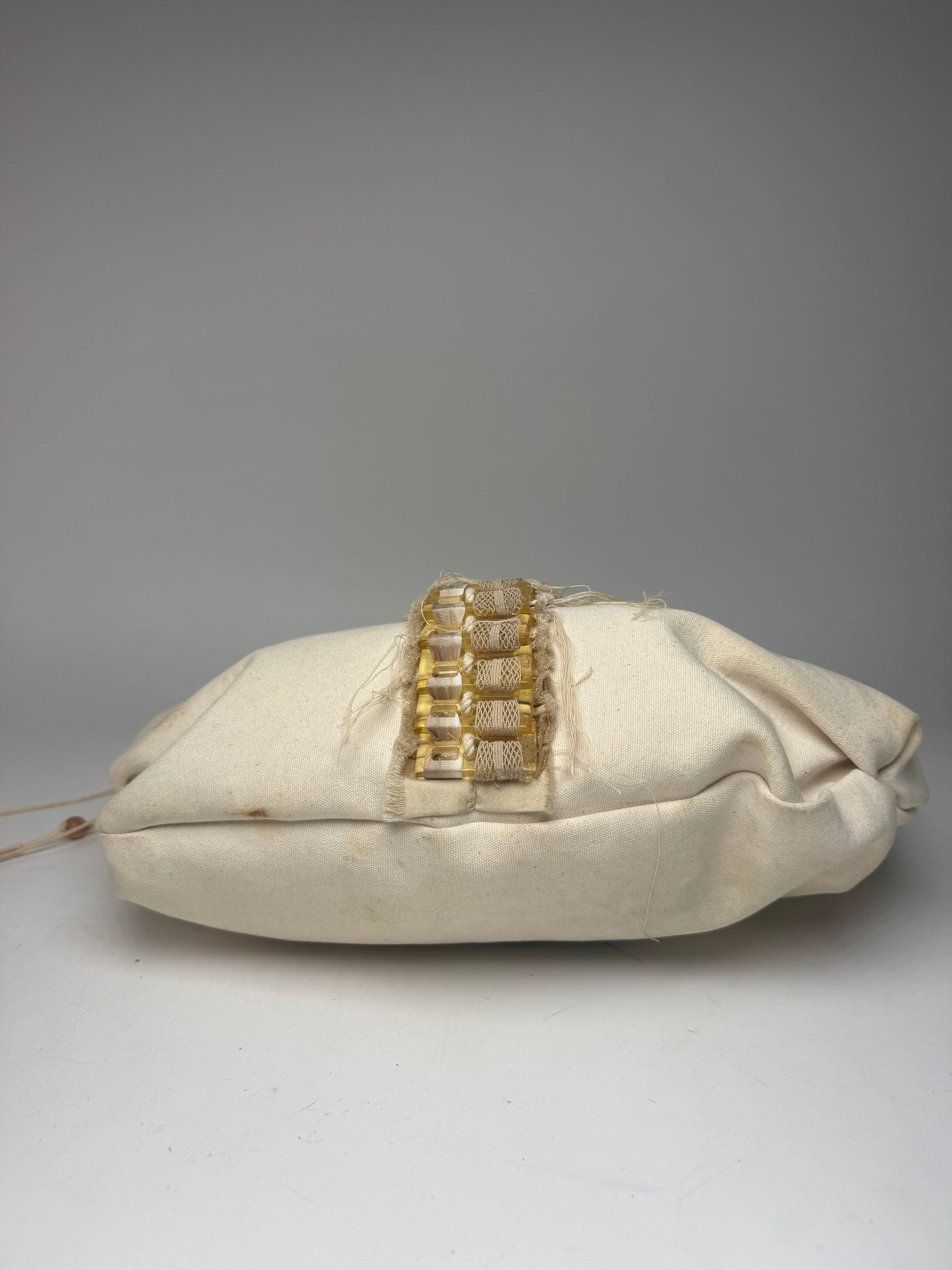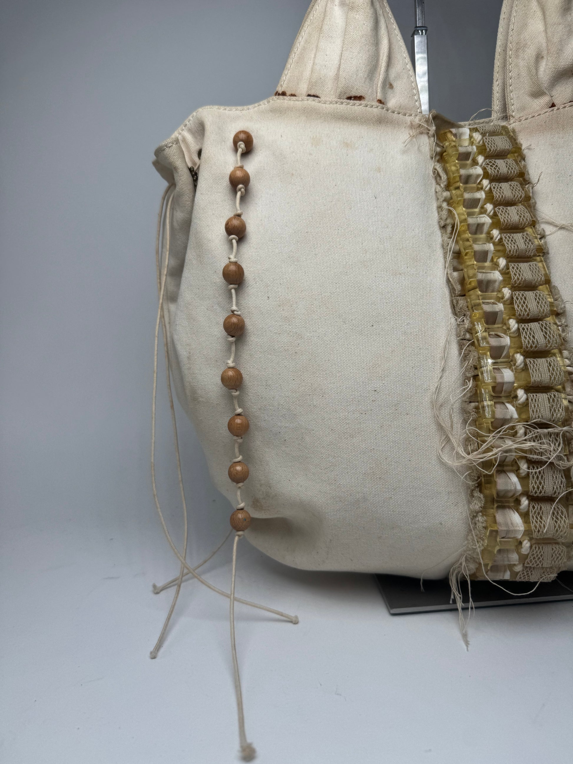 STELLA MCCARTNEY Vintage Handbag. This unique handbag is finely crafted of beige canvas or denim in an avant-garde style. The design features denim chain details adorned with wooden beads, complemented by numerous fringes cascading from the top. The interior is lined with lilac canvas.