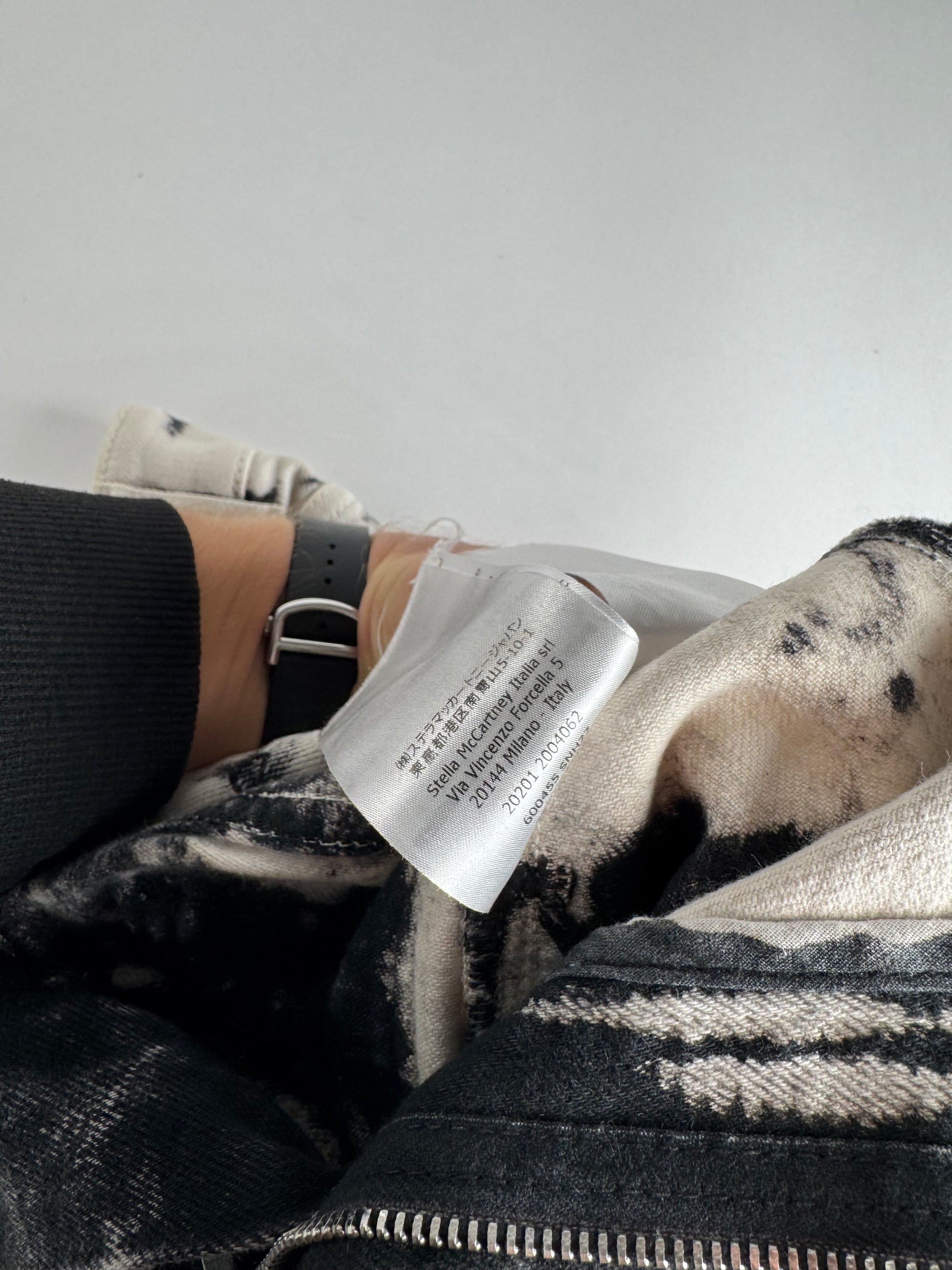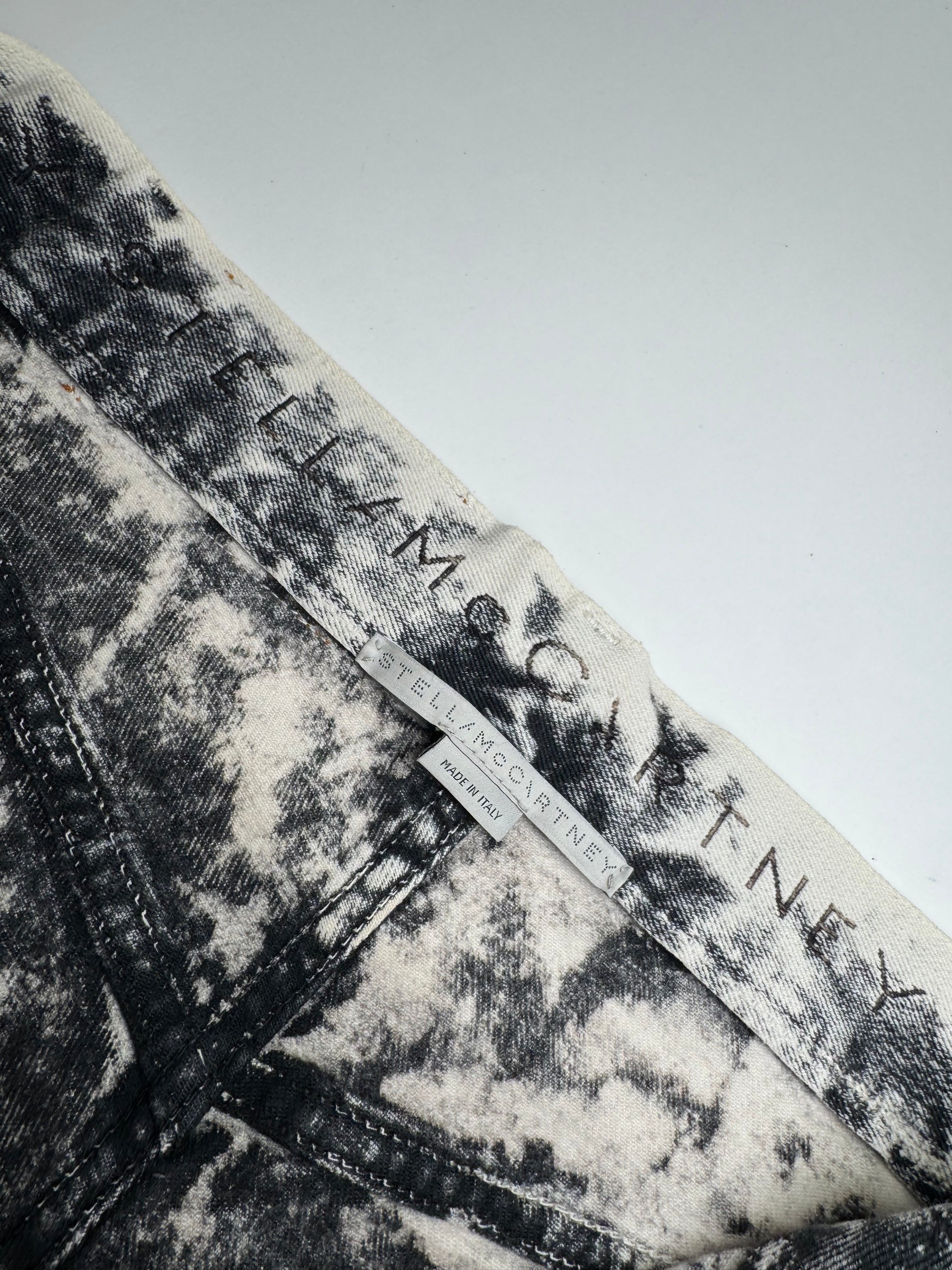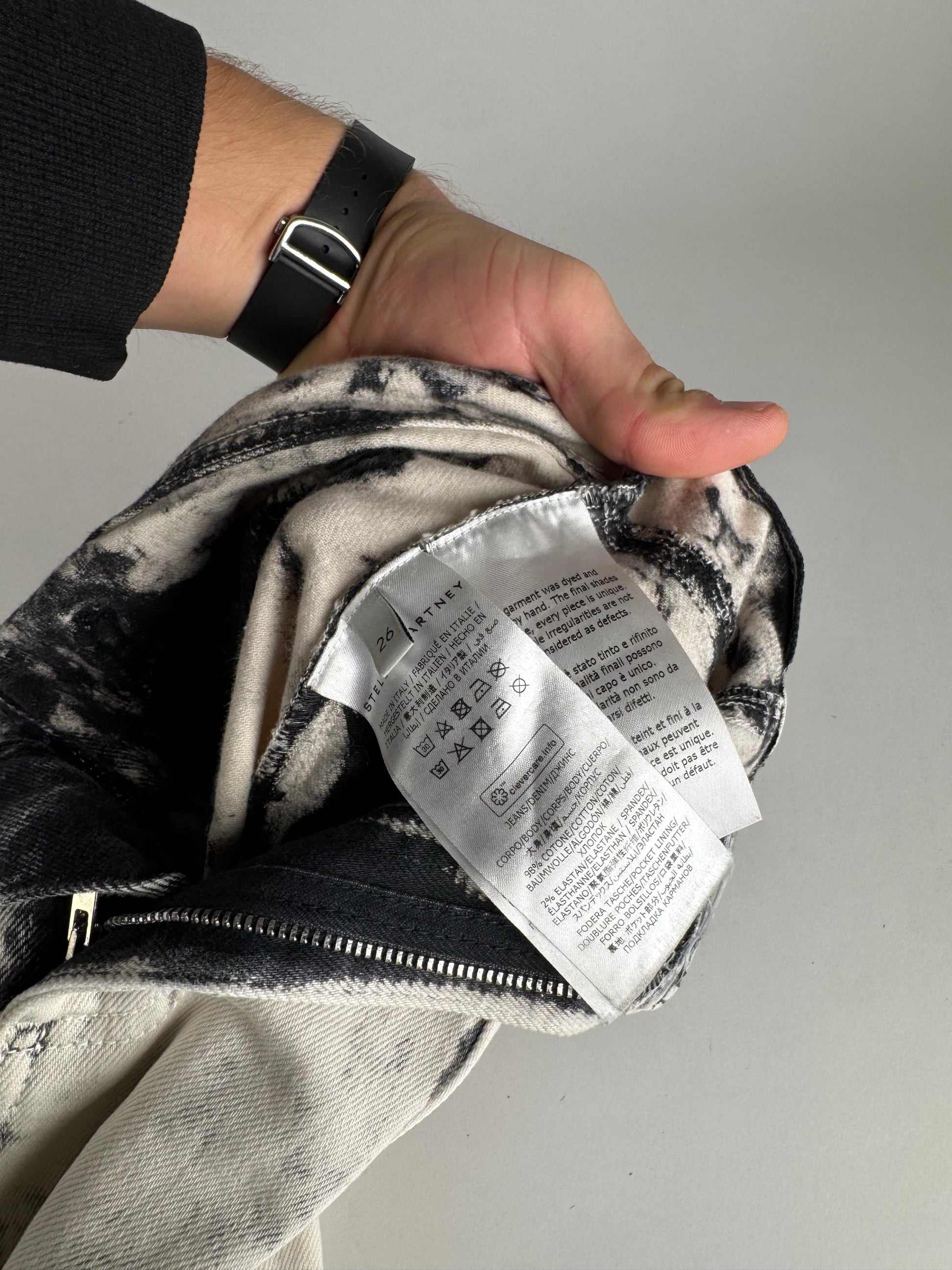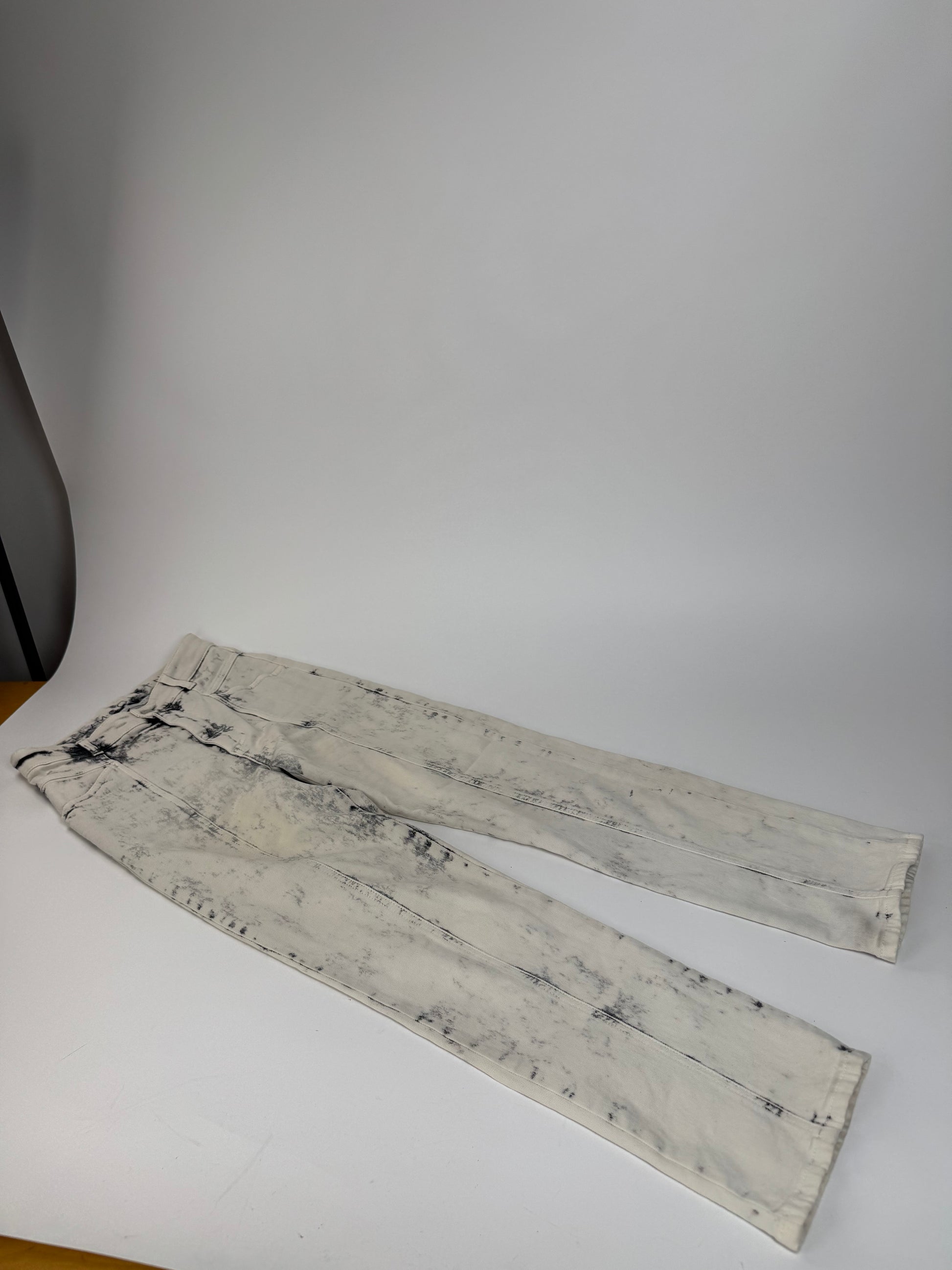 These vintage jeans are crafted in white denim with a washed black patterned effect. They feature silver-tone steel buttons, a high-waist fit, and a brown leather logo patch on the back. Measurements: total length 102 cm, inseam 70 cm, leg opening 18 cm, waist 32.5 cm. The mannequin in the photos is a size 38/M.