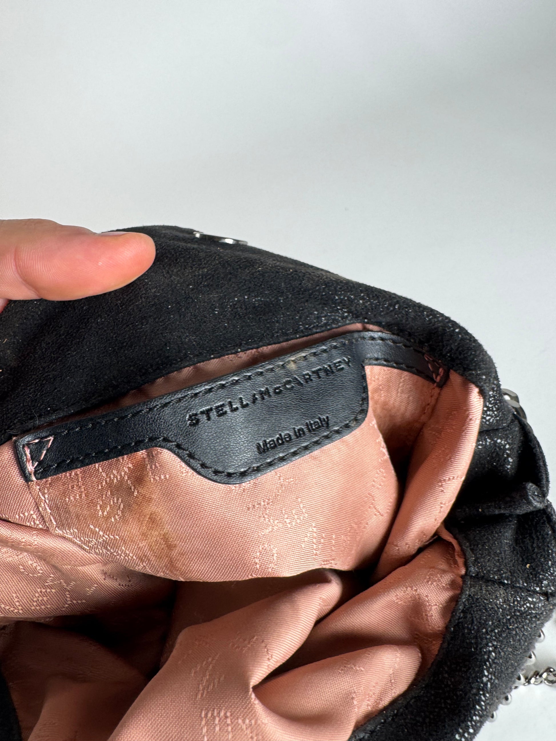 STELLA McCARTNEY Vintage Falabella 2-Way Handbag. This iconic vintage handbag is crafted from black vegan leather and features the signature silver-tone steel chain hardware that defines the Falabella line. Introduced in 2009, the Falabella became a symbol of Stella McCartney’s commitment to cruelty-free luxury, combining ethical materials with a bold, modern aesthetic. The bag offers two top handles and a chain shoulder strap, allowing for versatile wear, and opens to a rosé-colored canvas interior detailed with Stella McCartney logo lettering.